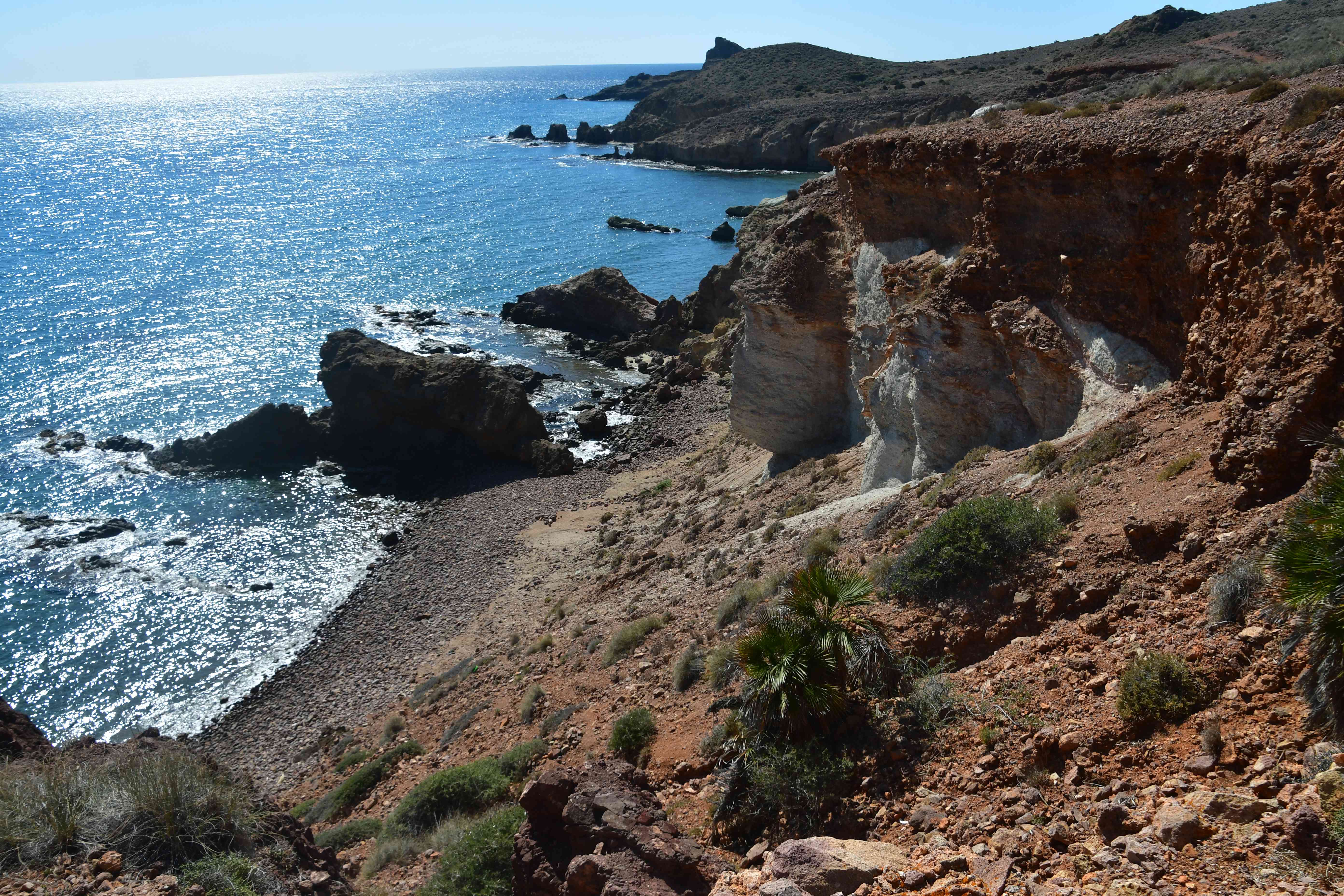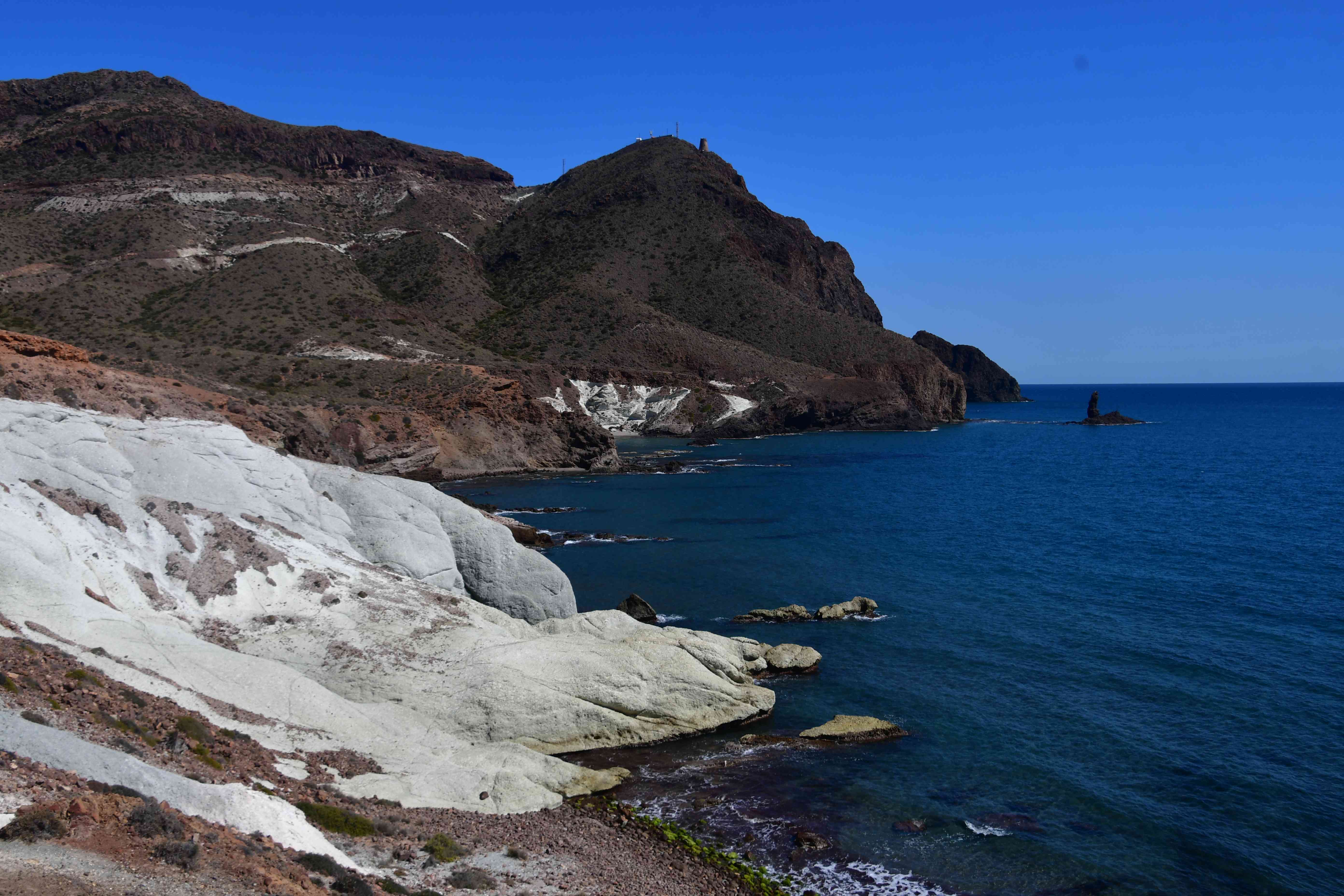 The white rocks are tuffs, very old vulcanic material.