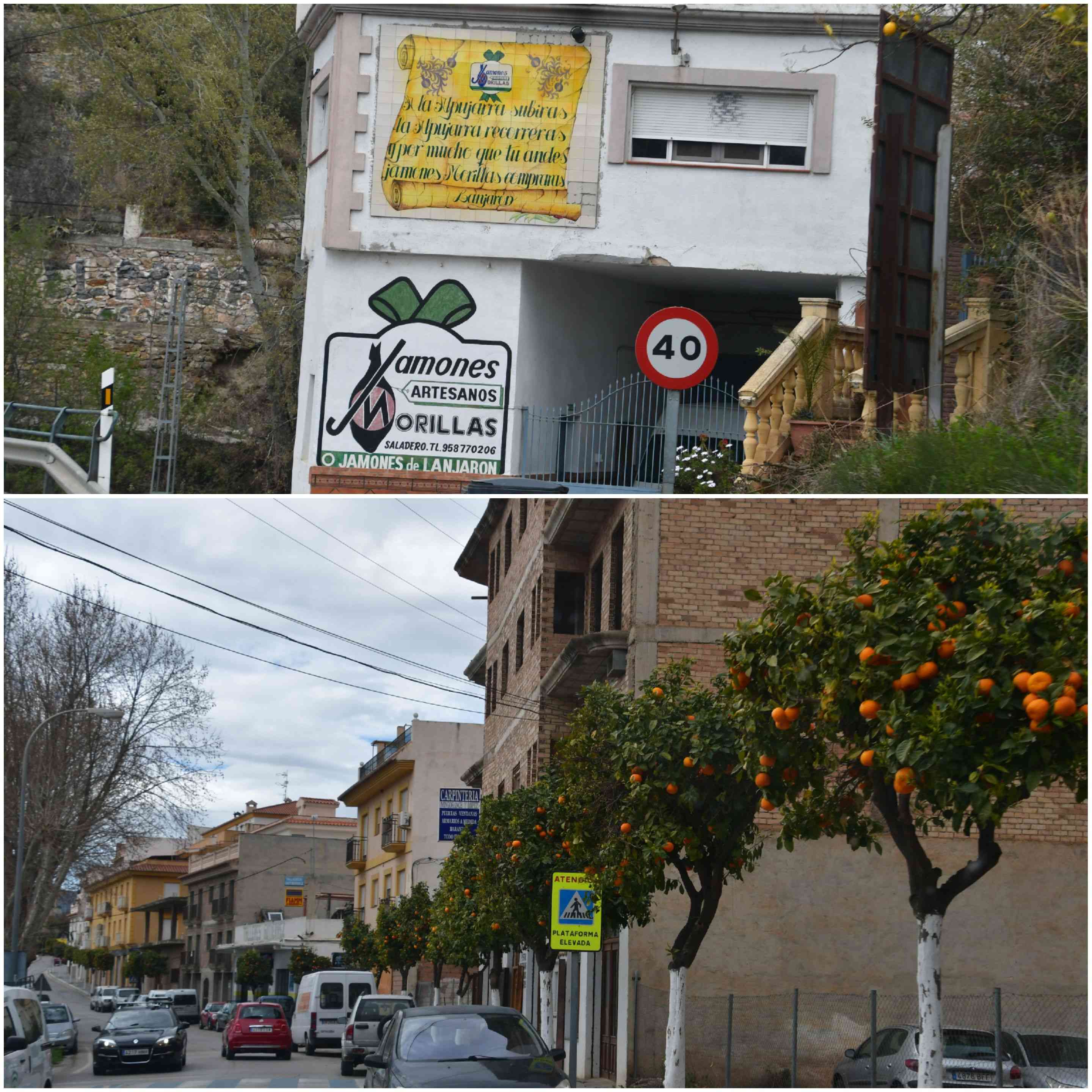 We drove further west, out of the Sierra Nevada, past Pampaneira, Orgiva and Lanjarón. The villages are all stuck to a hillside, painted white, and with flat roofs. It sometimes smelled (or rather stunk…) of dried ham (Jamón Serrano). It’s THE speciality of that region.