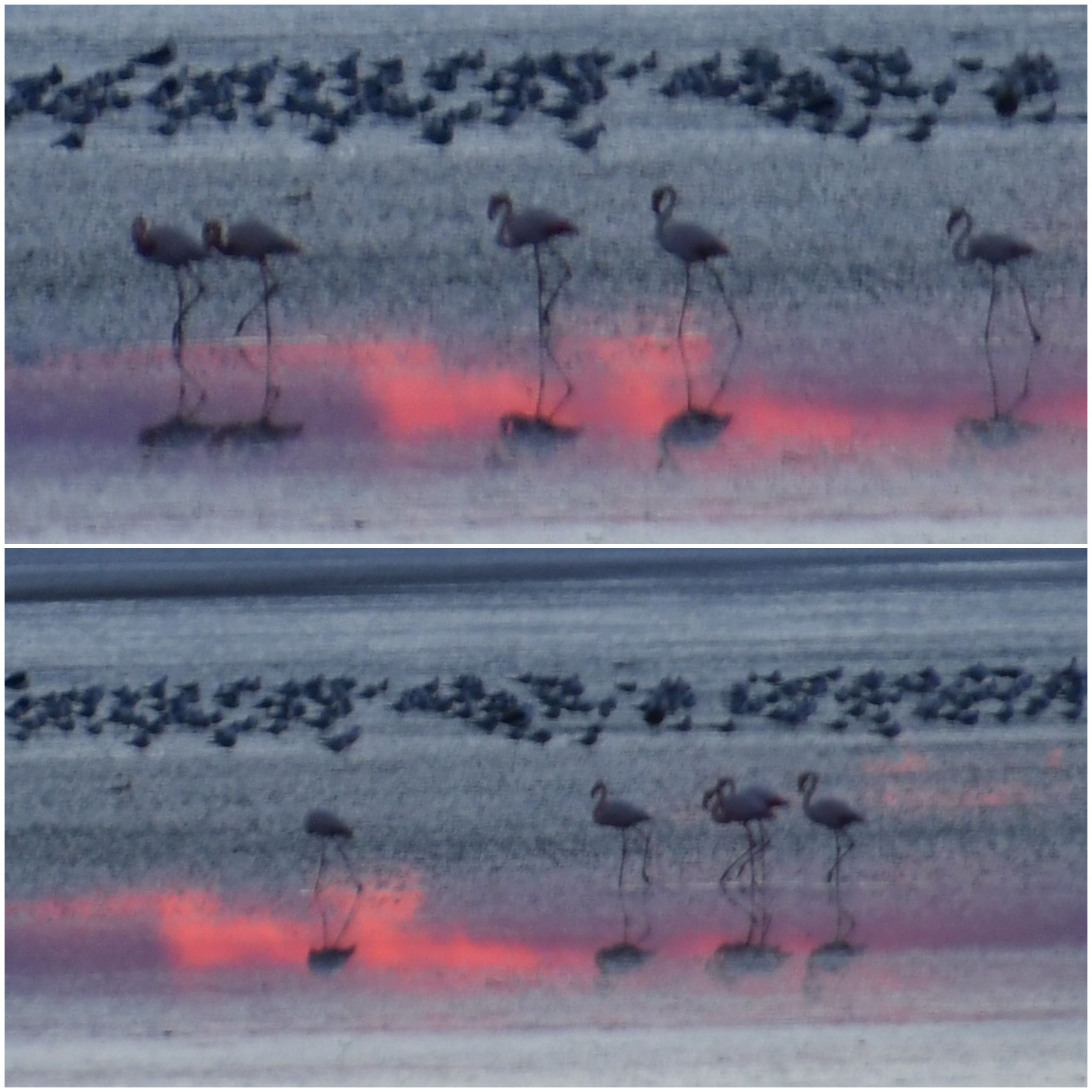 We were probably the only ones at the Camping, and there were only a few people around the lagoon. When it rains plenty in autumn and winter, the lagoon is full of water, and there are a lot of very pink flamingoes breeding. That wasn’t the case last winter, so the water is very shallow and there are not many flamingoes. In any case they have to fly about 300 km every night to look for food elsewhere!