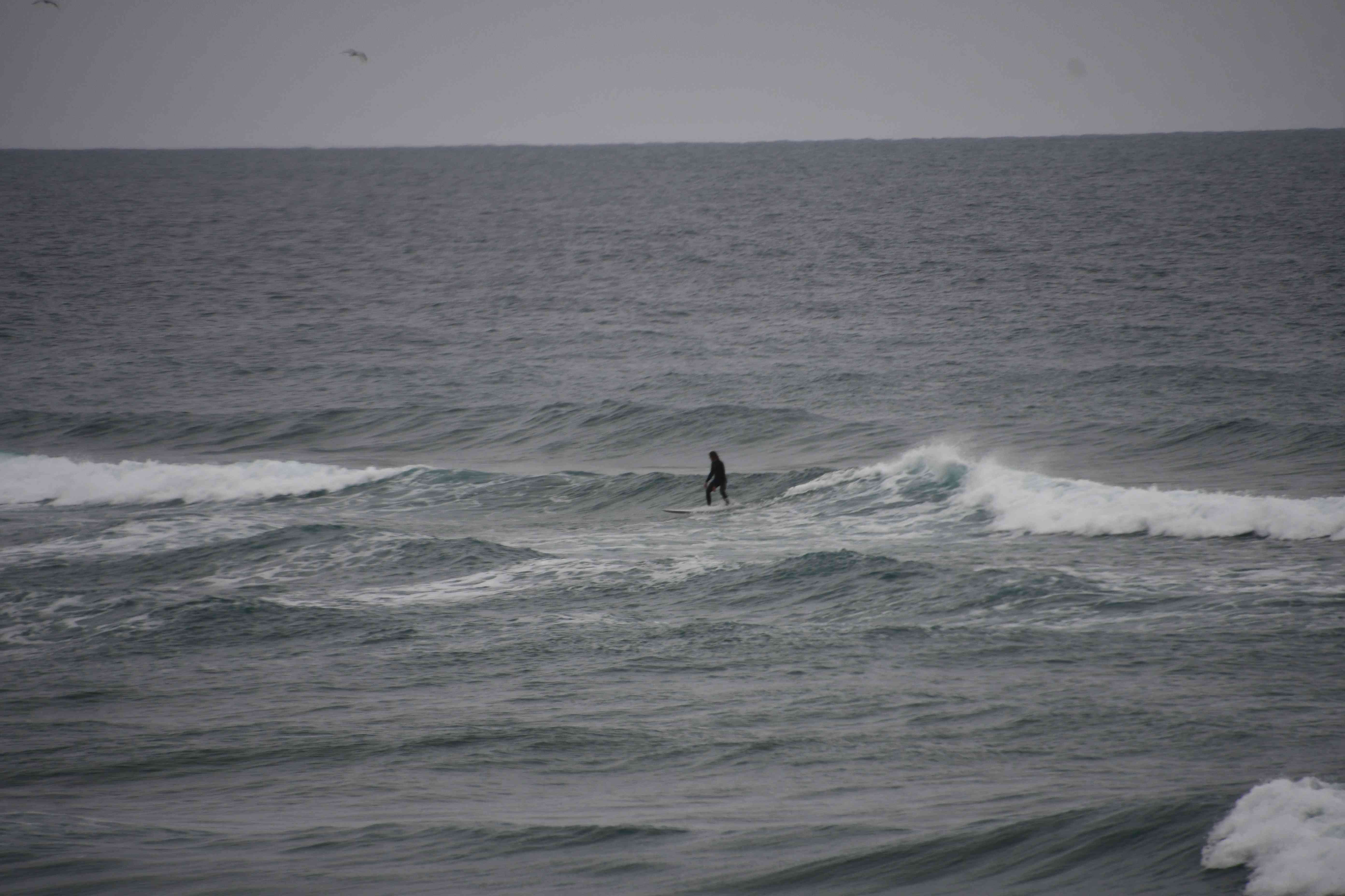 A lonely surfer, and a lonely fisherman.