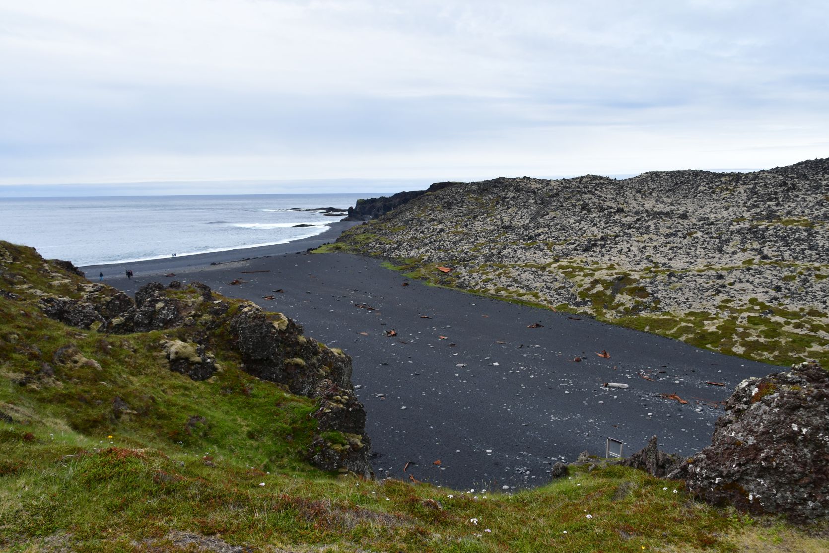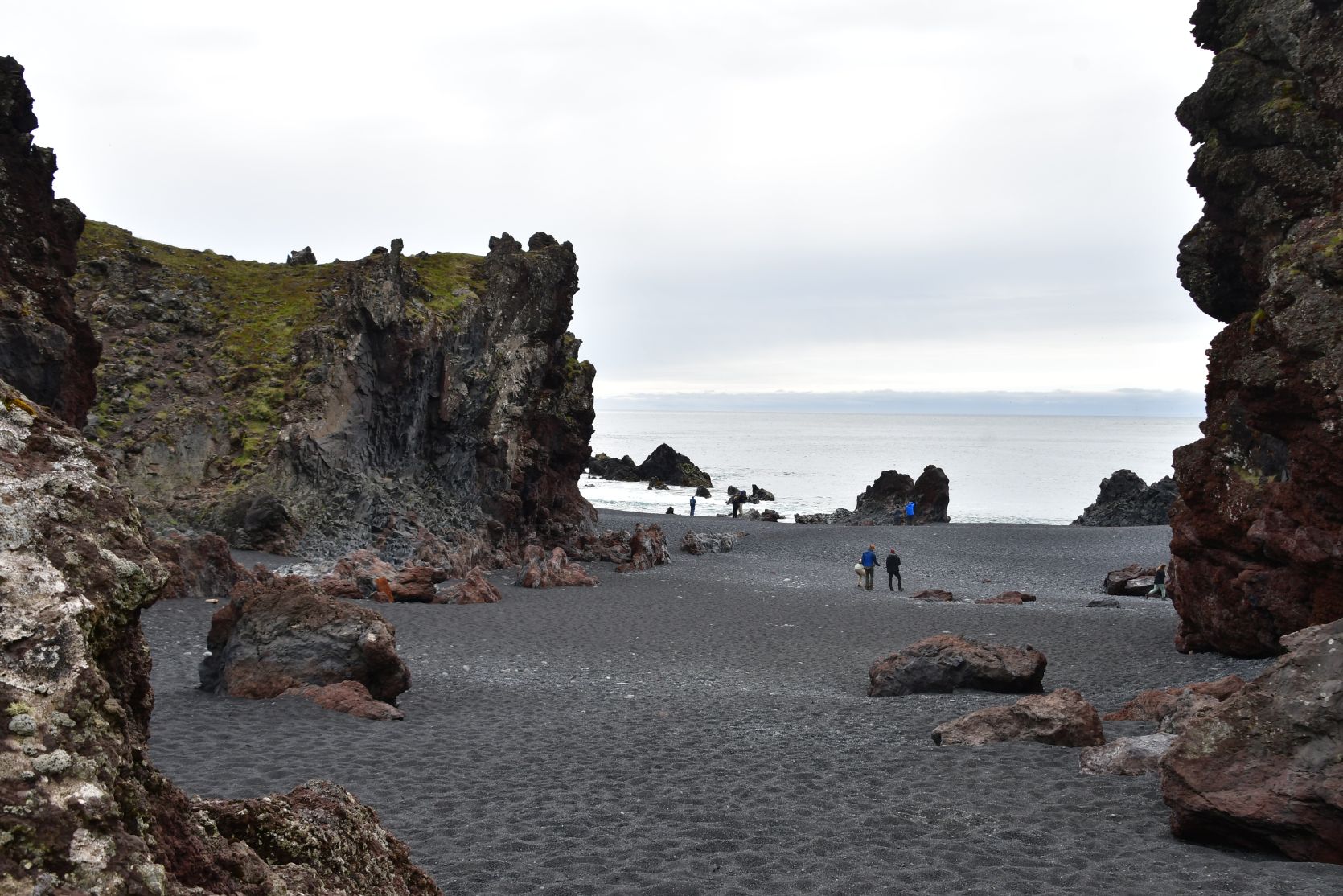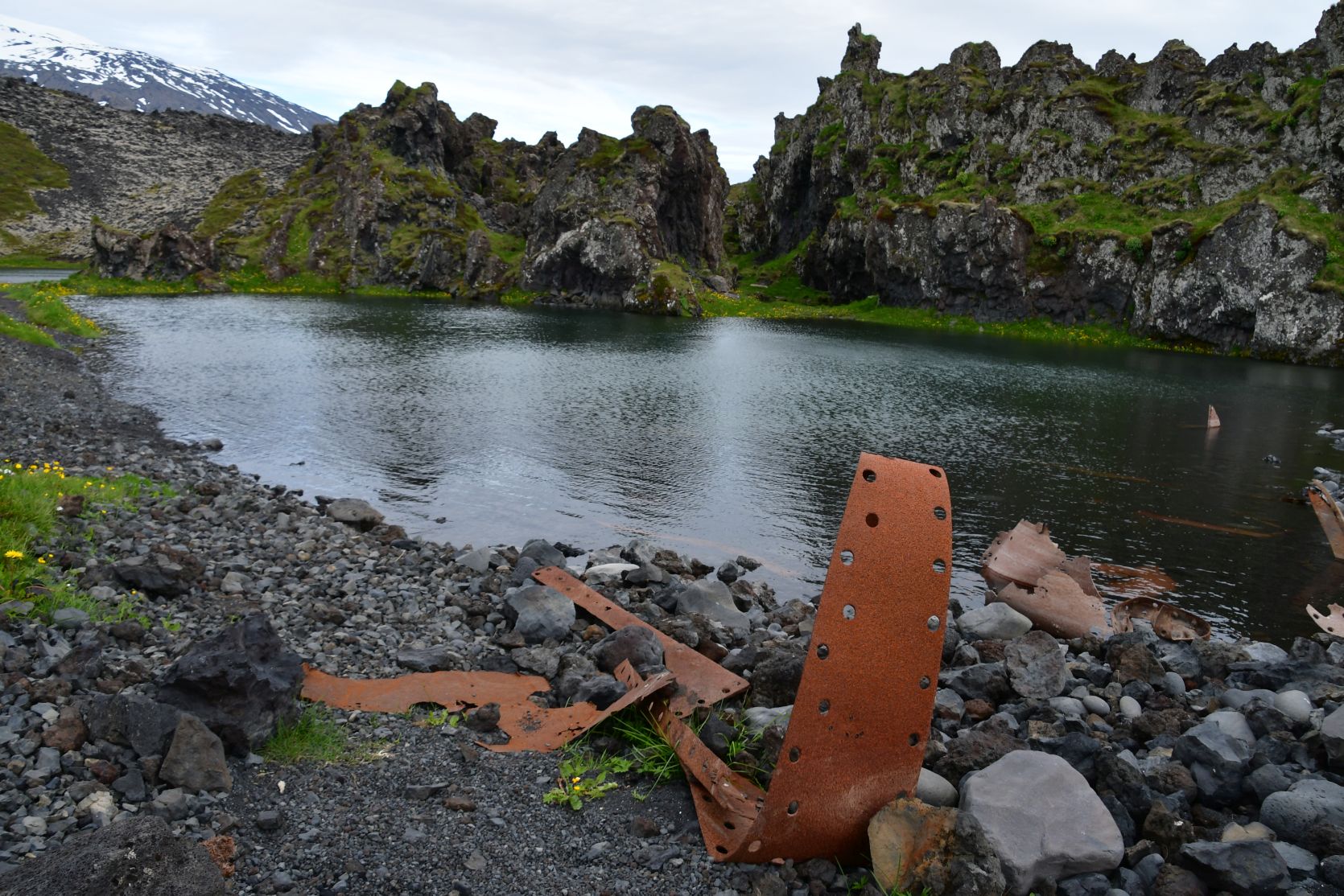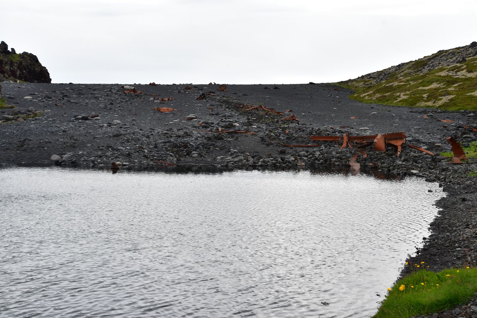 Djúpalónssandur, a black beach with lots of rusty metal pieces from a shipwreck lying around.