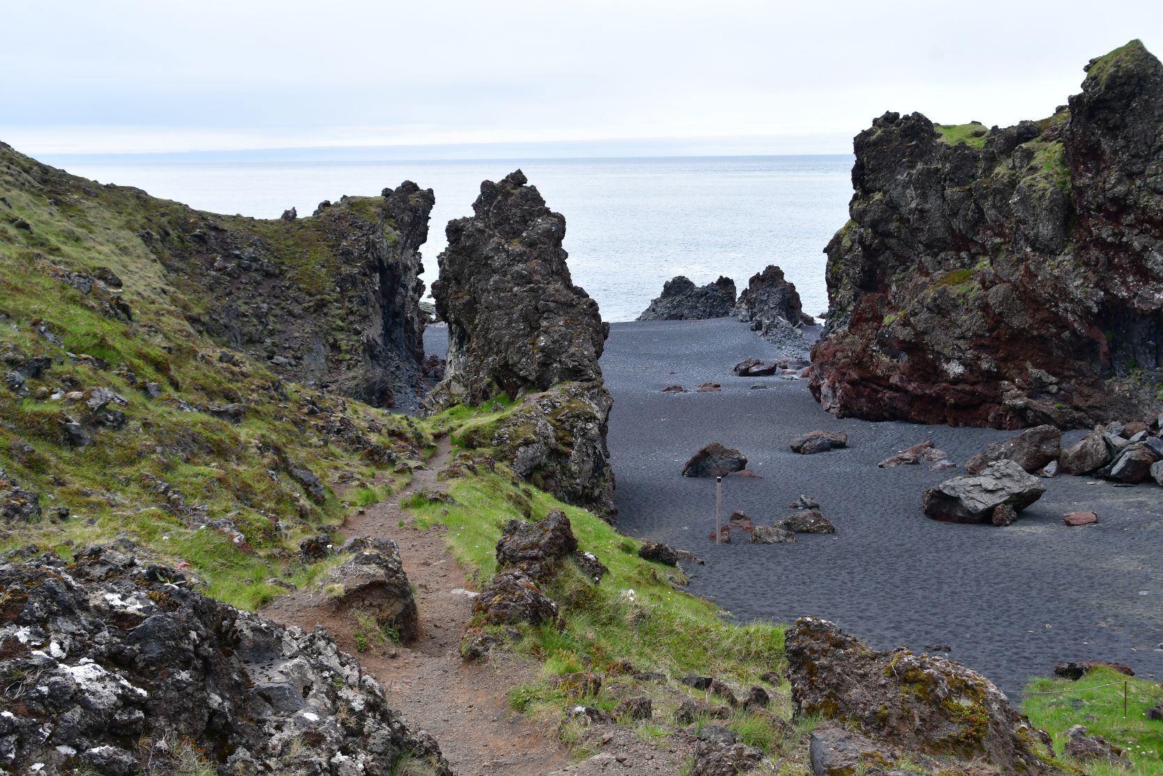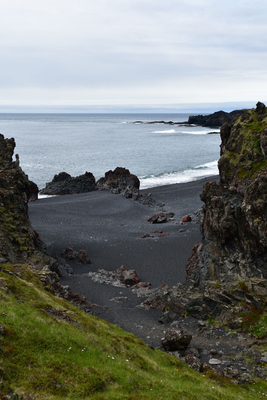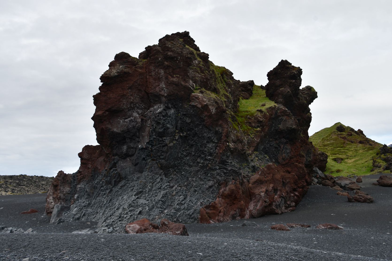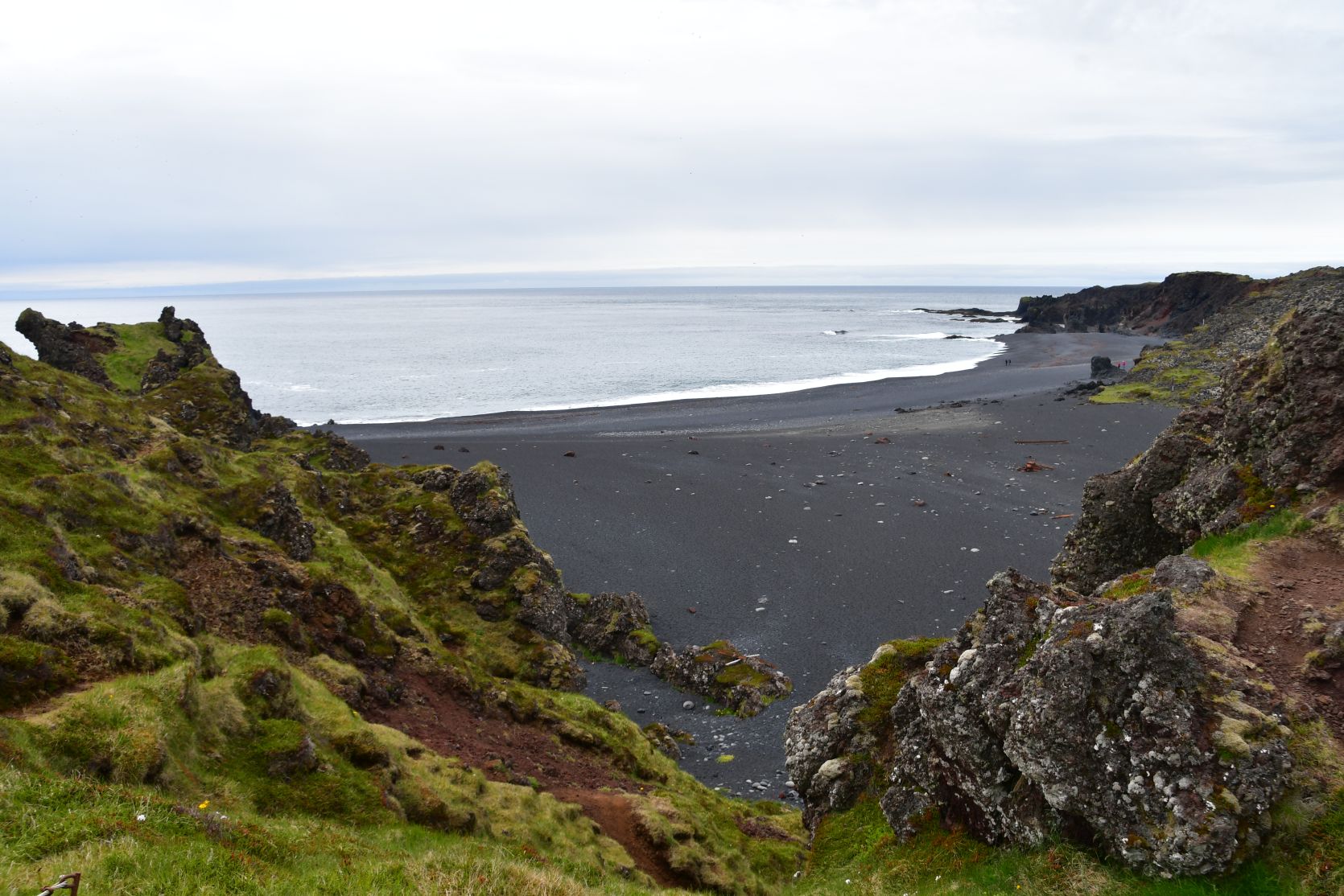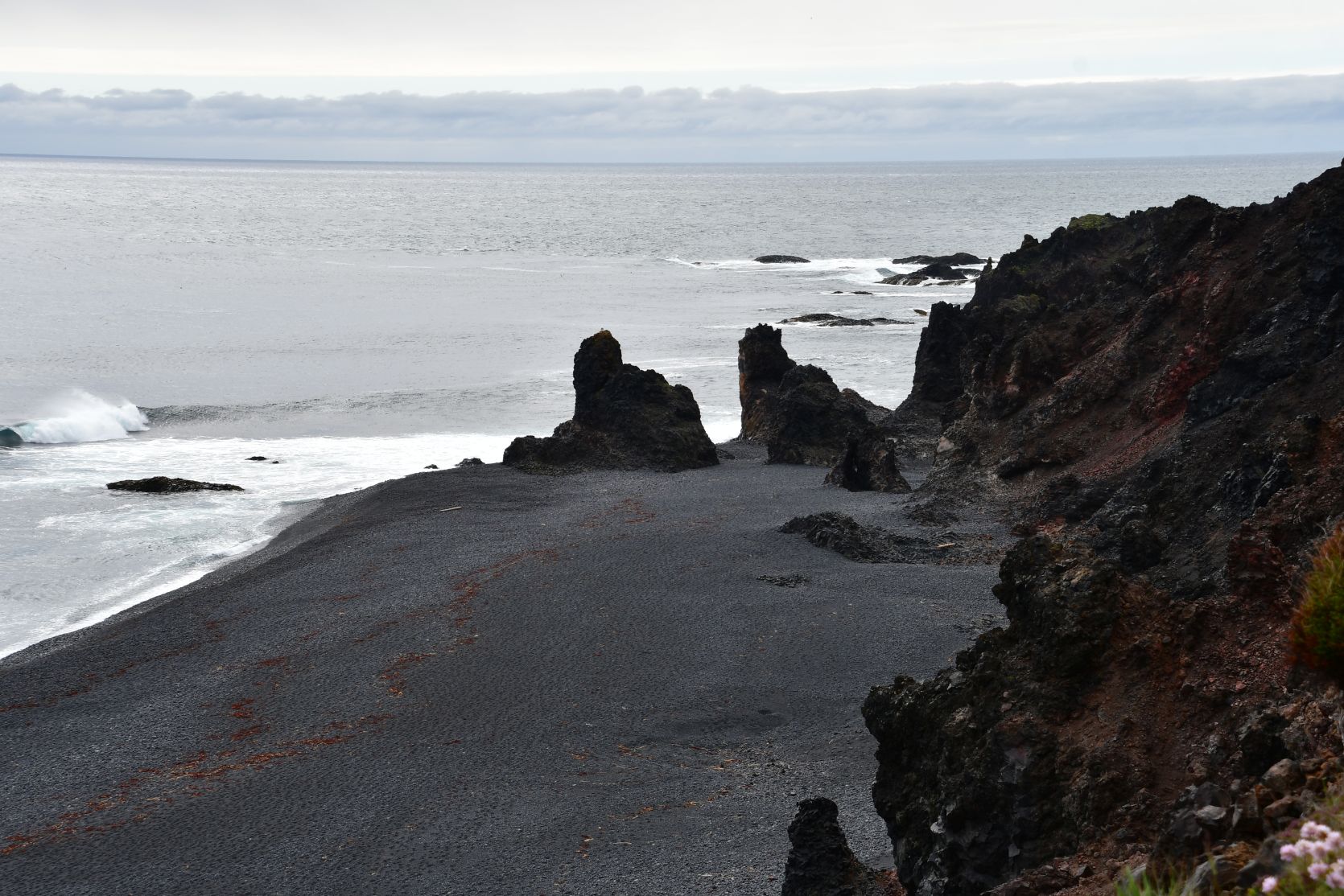 Djúpalónssandur, a black beach with lots of rusty metal pieces from a shipwreck lying around.