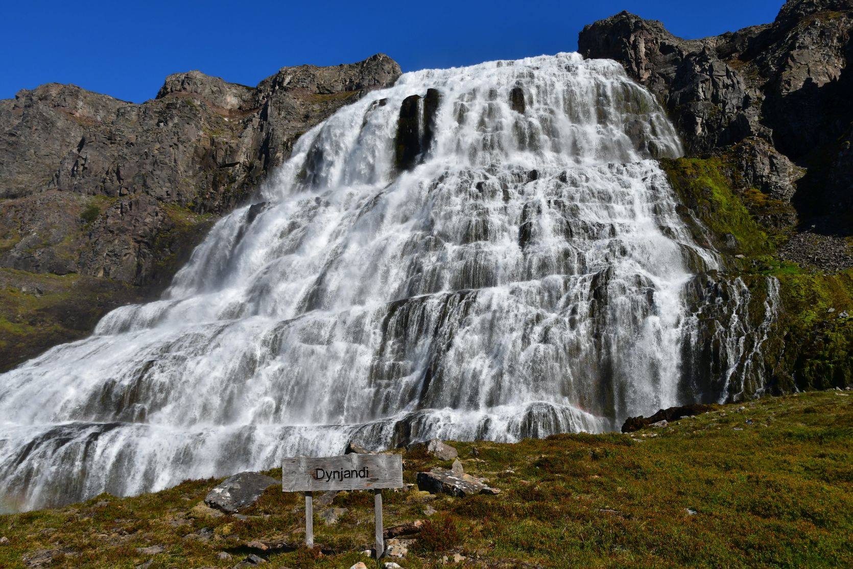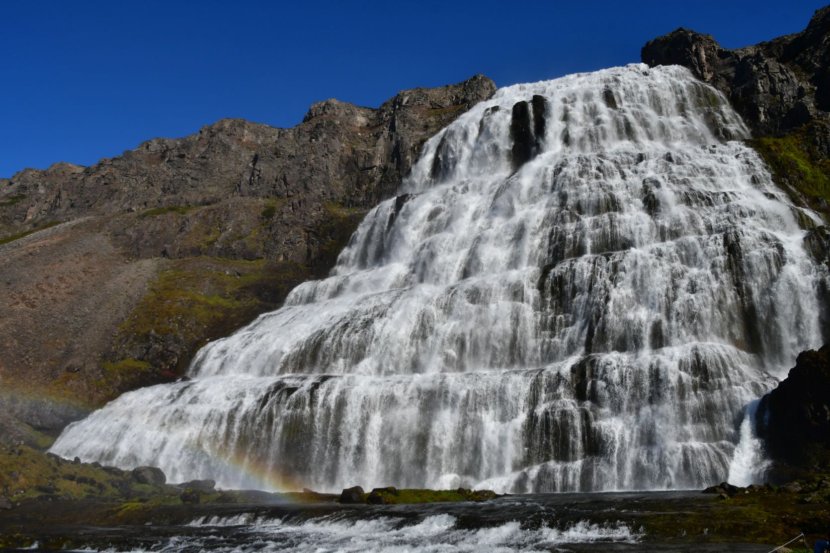 Dynjandi is about 100 metres high, 30 metres broad at the top and 60 metres at the bottom.