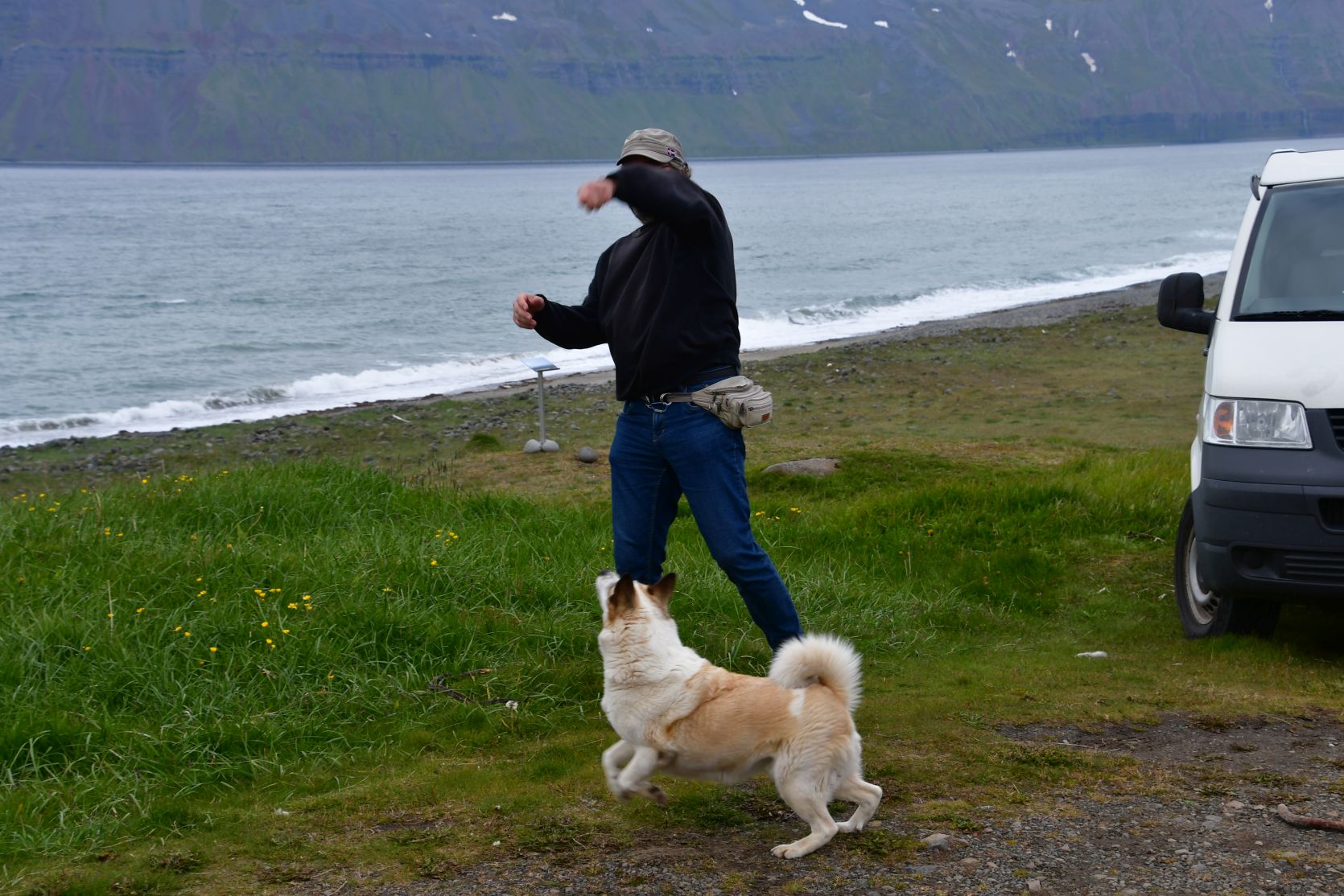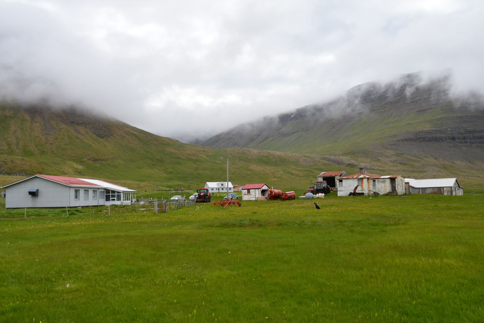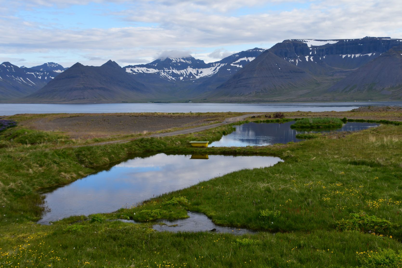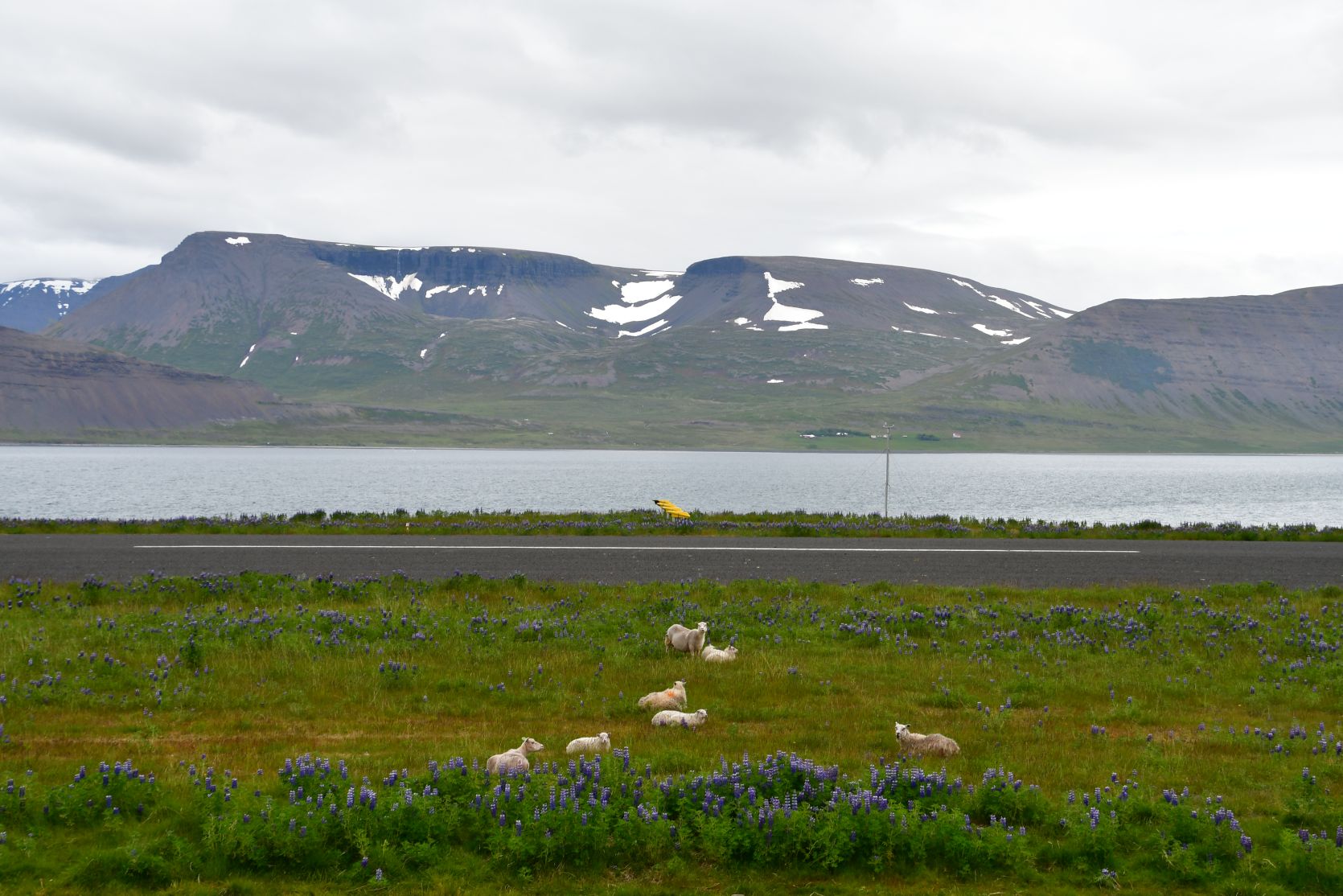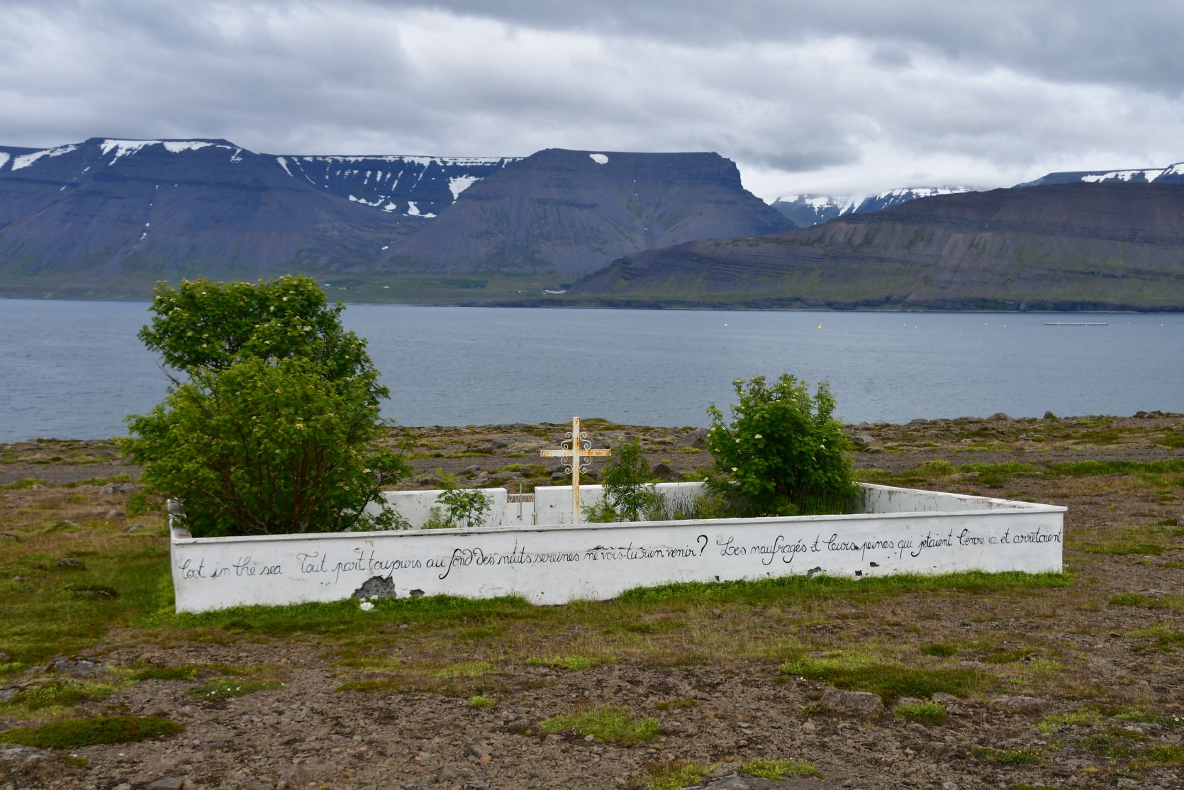 The next day, along the fjord. Sheep are even on the airfield ! There are lots of little airports all over Iceland. We saw a French cemetery. The road soon turned into an F-street (only for real 4×4 cars).