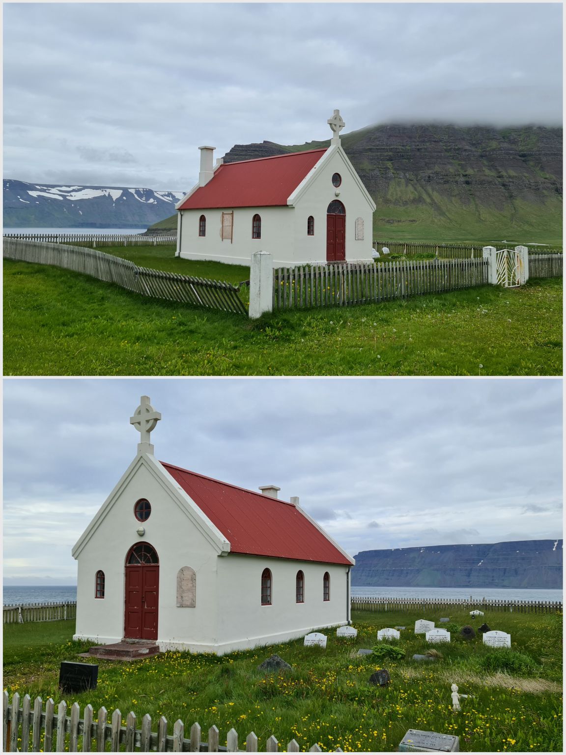 Am nächsten Tag, dem Fjord entlang. Schafe sind sogar auf dem Rollfeld ! Es hat viele kleine Flughäfen überall in Island. Wir sahen einen französischen Friedhof. Die Strasse wurde bald zu einer F-Strasse (nur für richtige 4×4 Autos).
