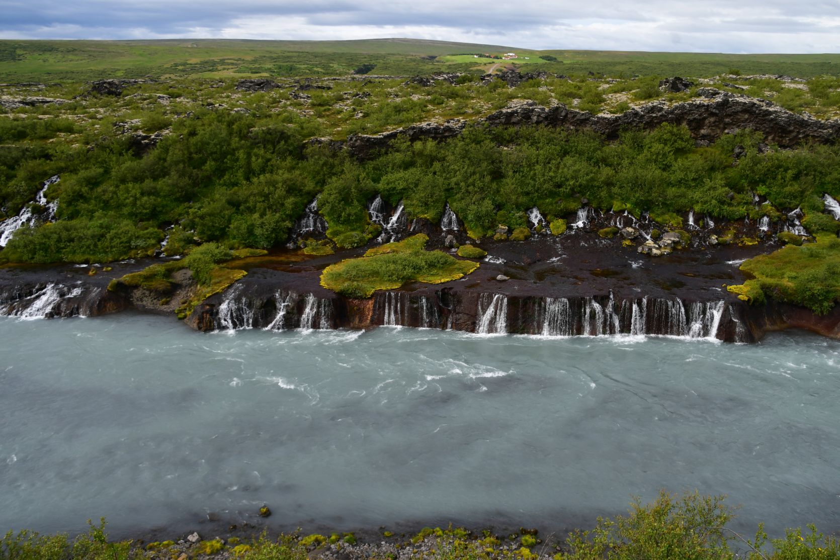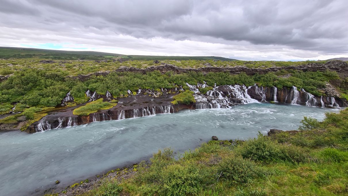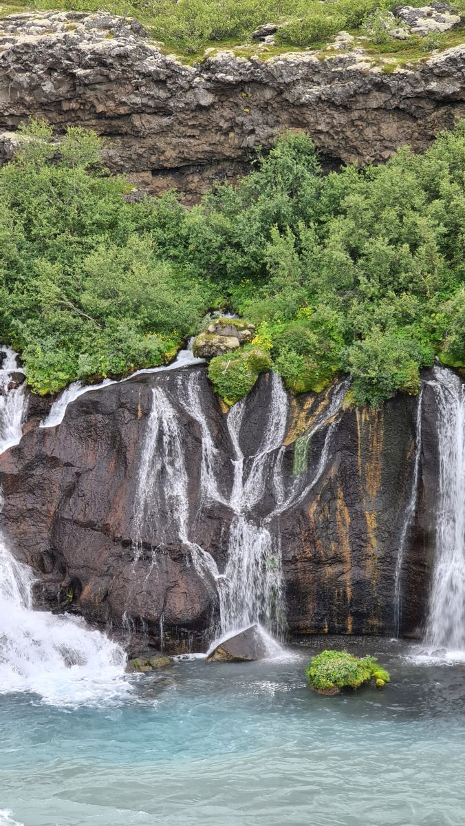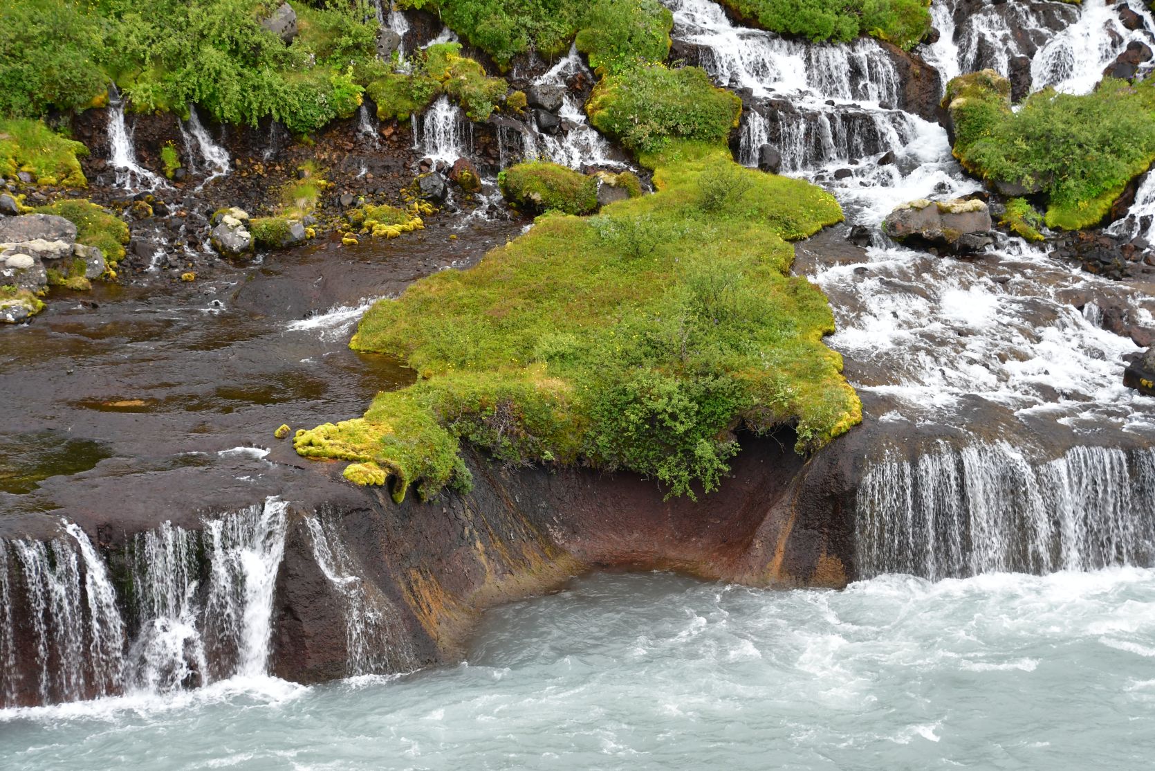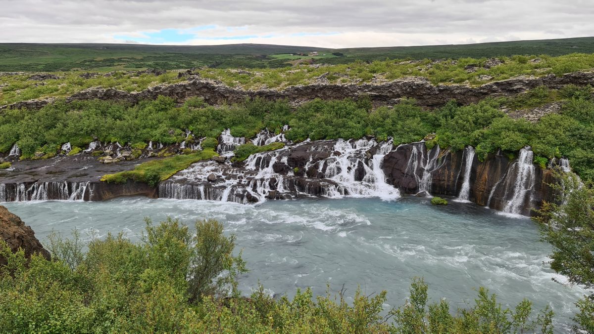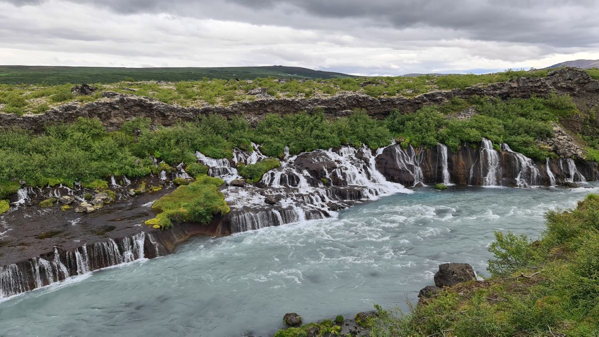 The main reason we drove that far south again was the Hraunfossar (= lava falls). It is fascinating how the water streams through layers of lava. Over a distance of more than 700 metres the water pours out of the lava, in over a hundred little waterfalls.