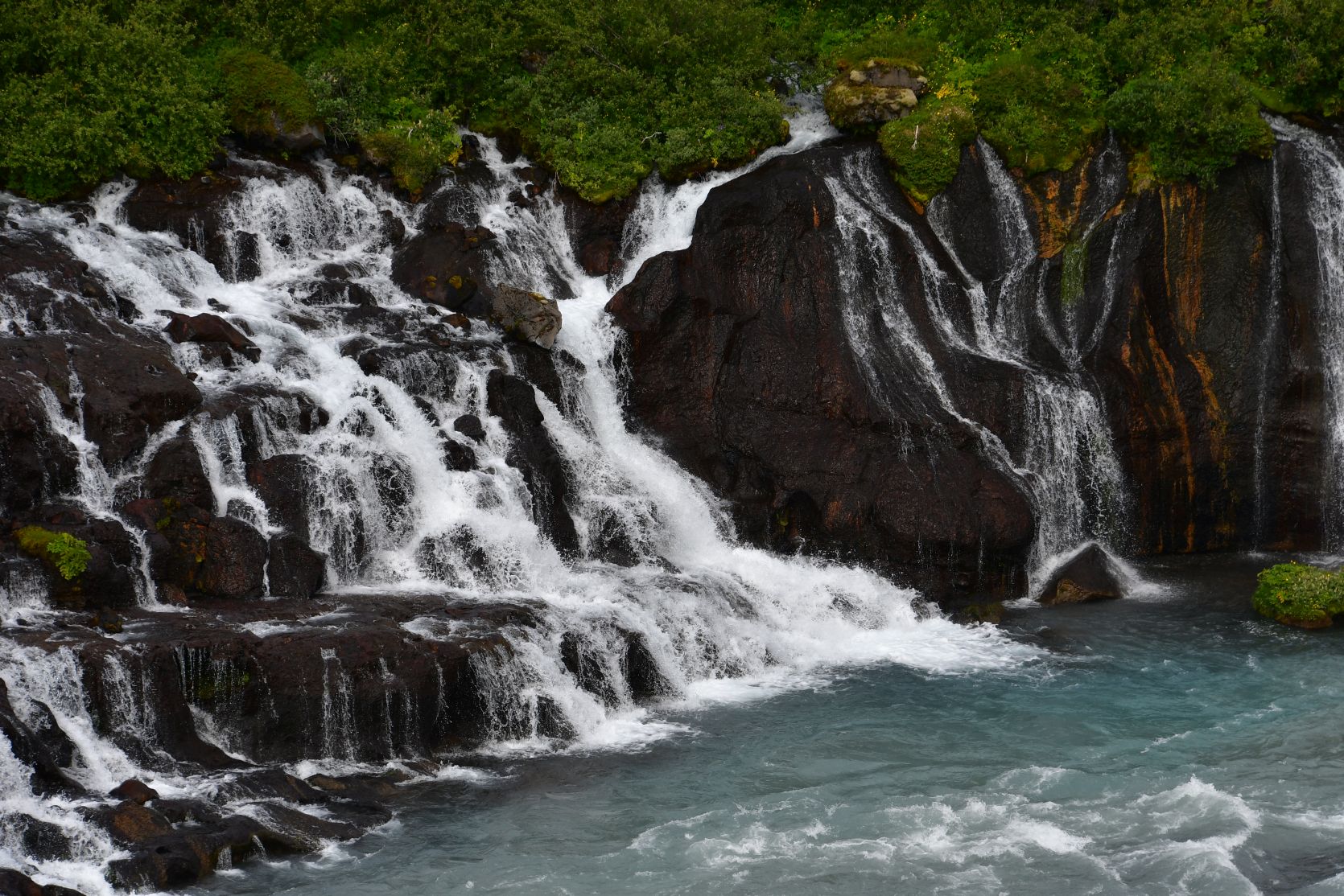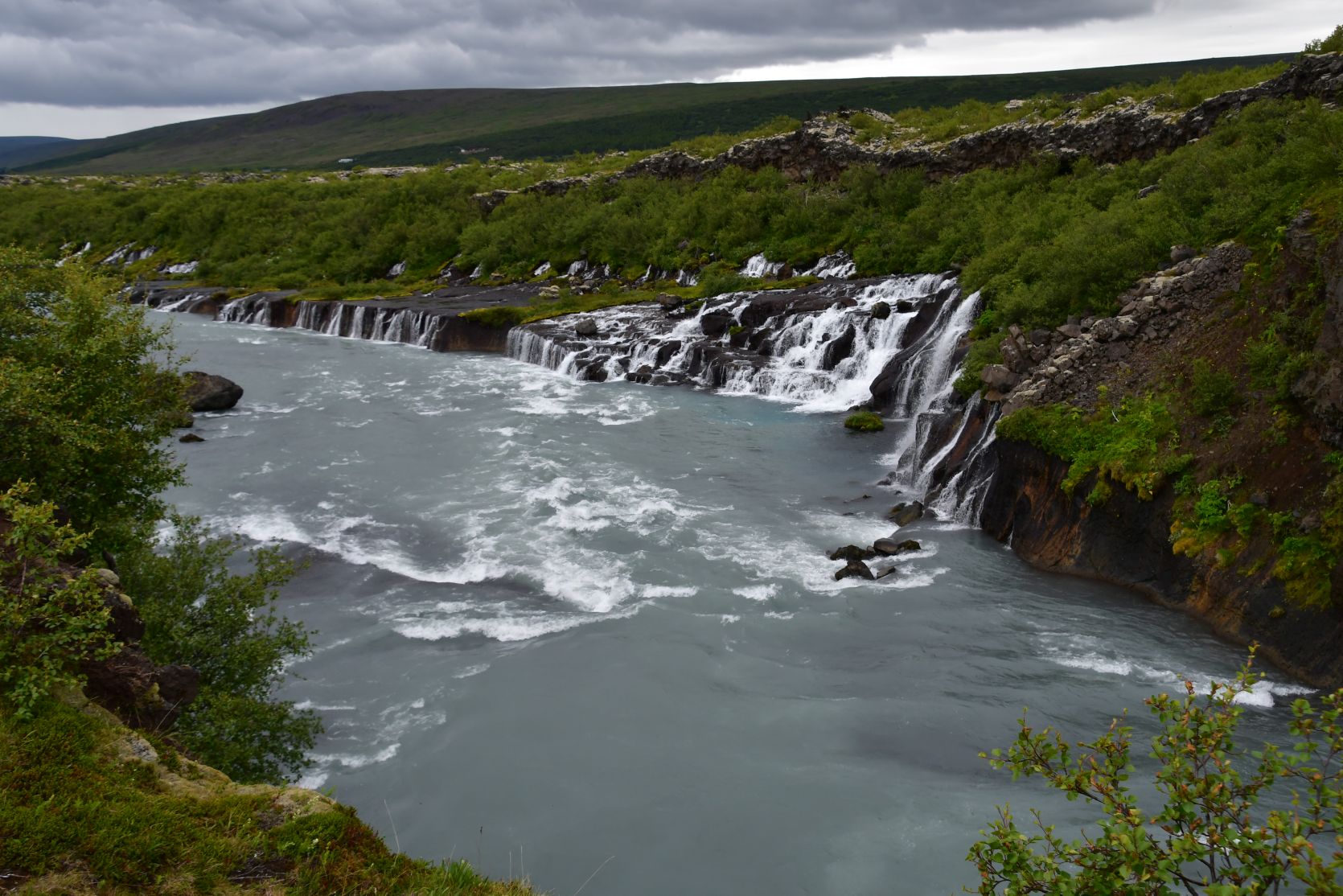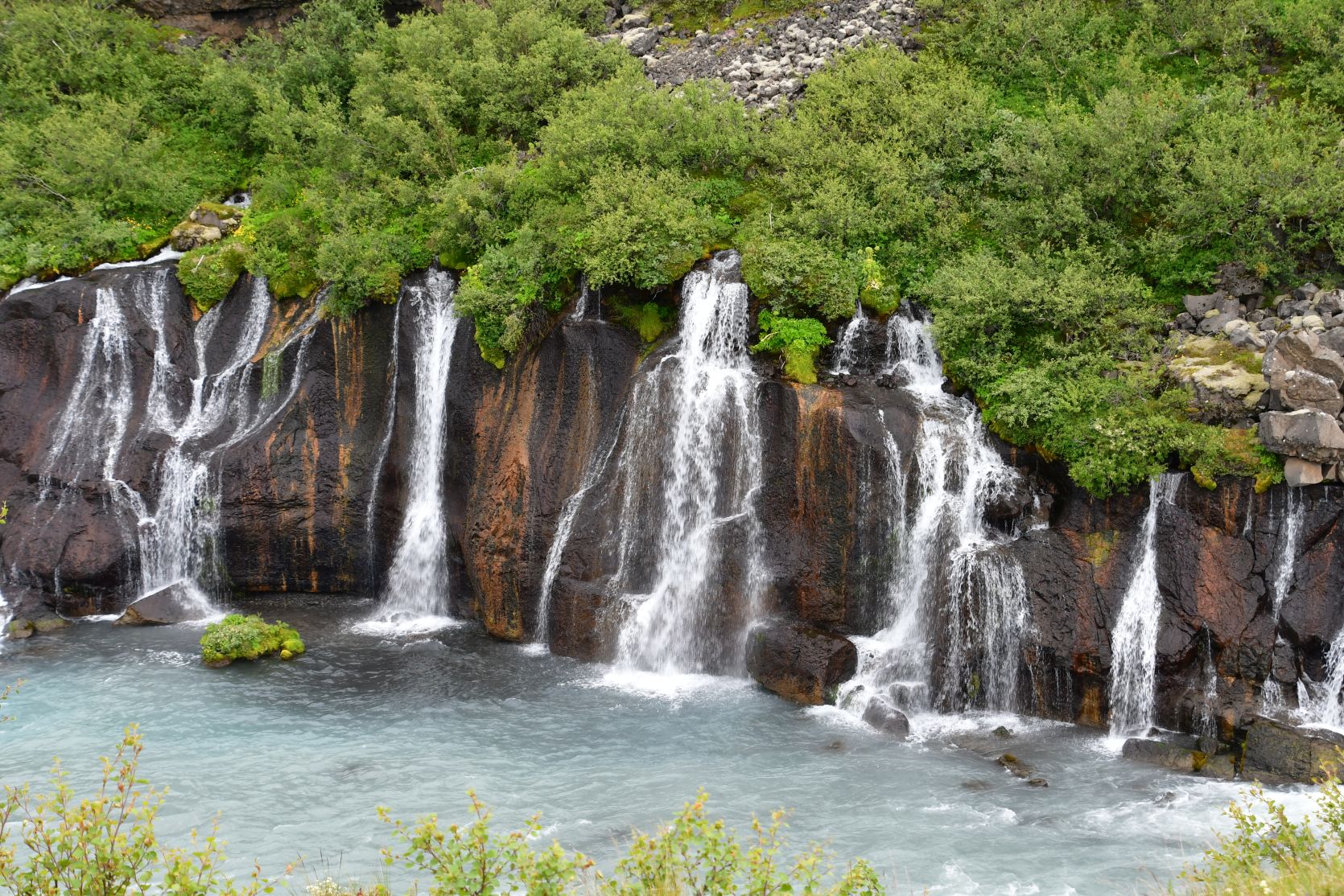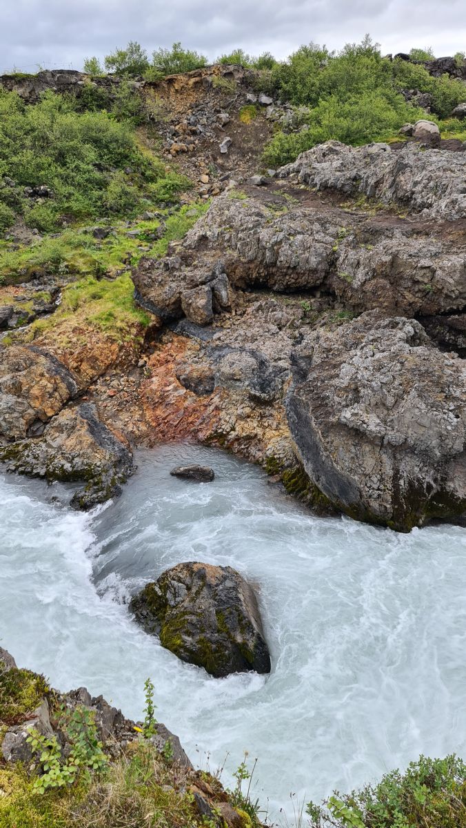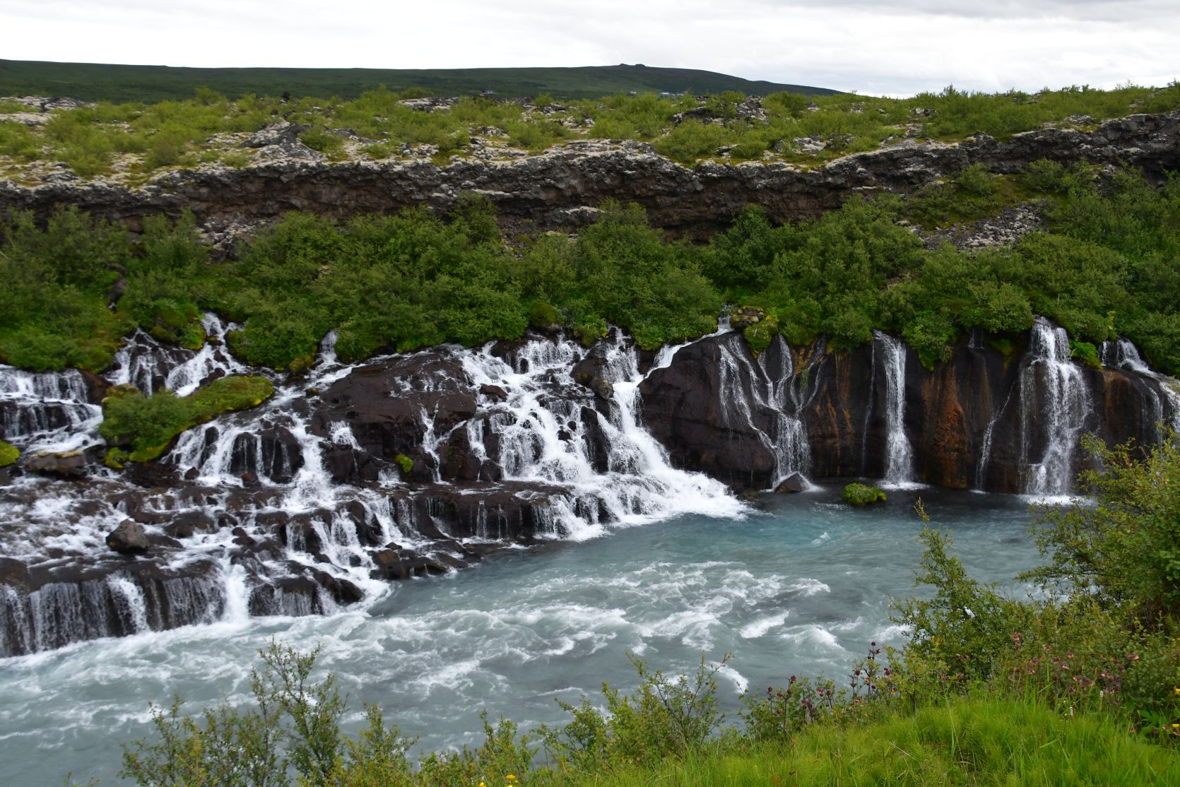 The main reason we drove that far south again was the Hraunfossar (= lava falls). It is fascinating how the water streams through layers of lava. Over a distance of more than 700 metres the water pours out of the lava, in over a hundred little waterfalls.