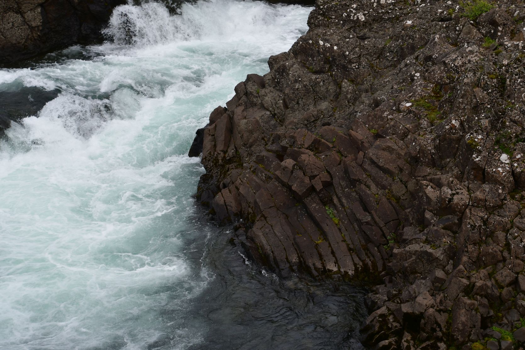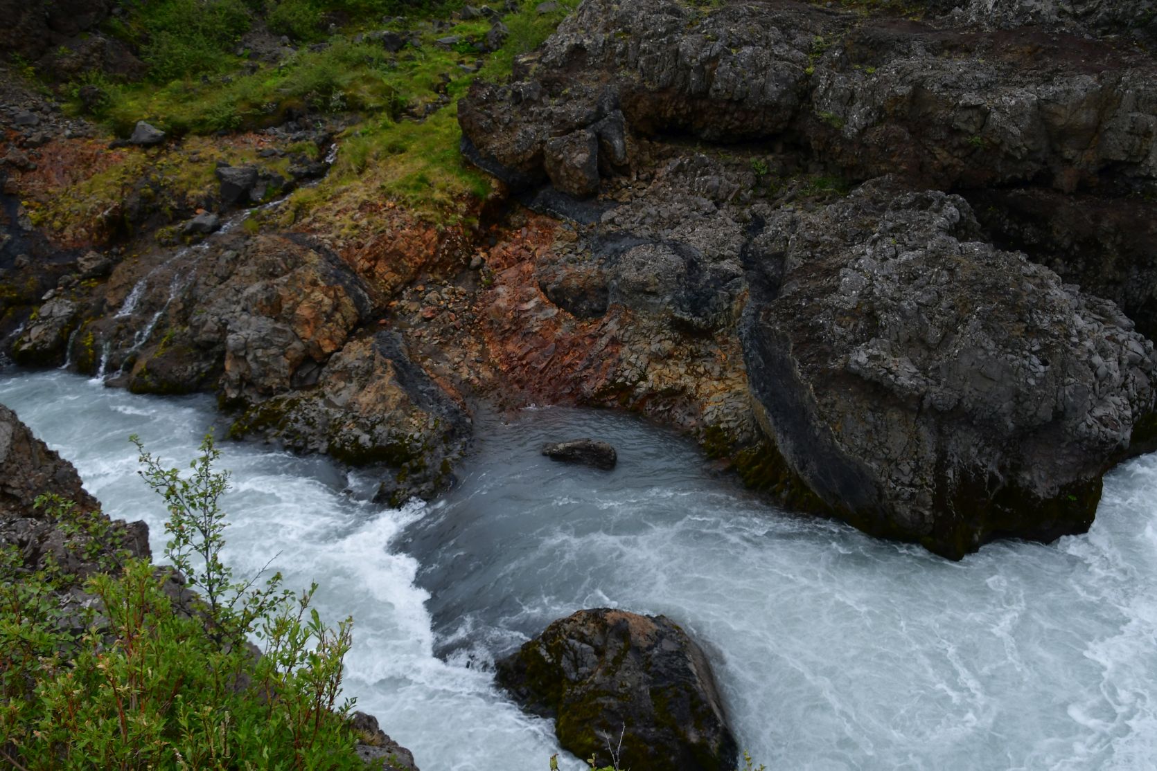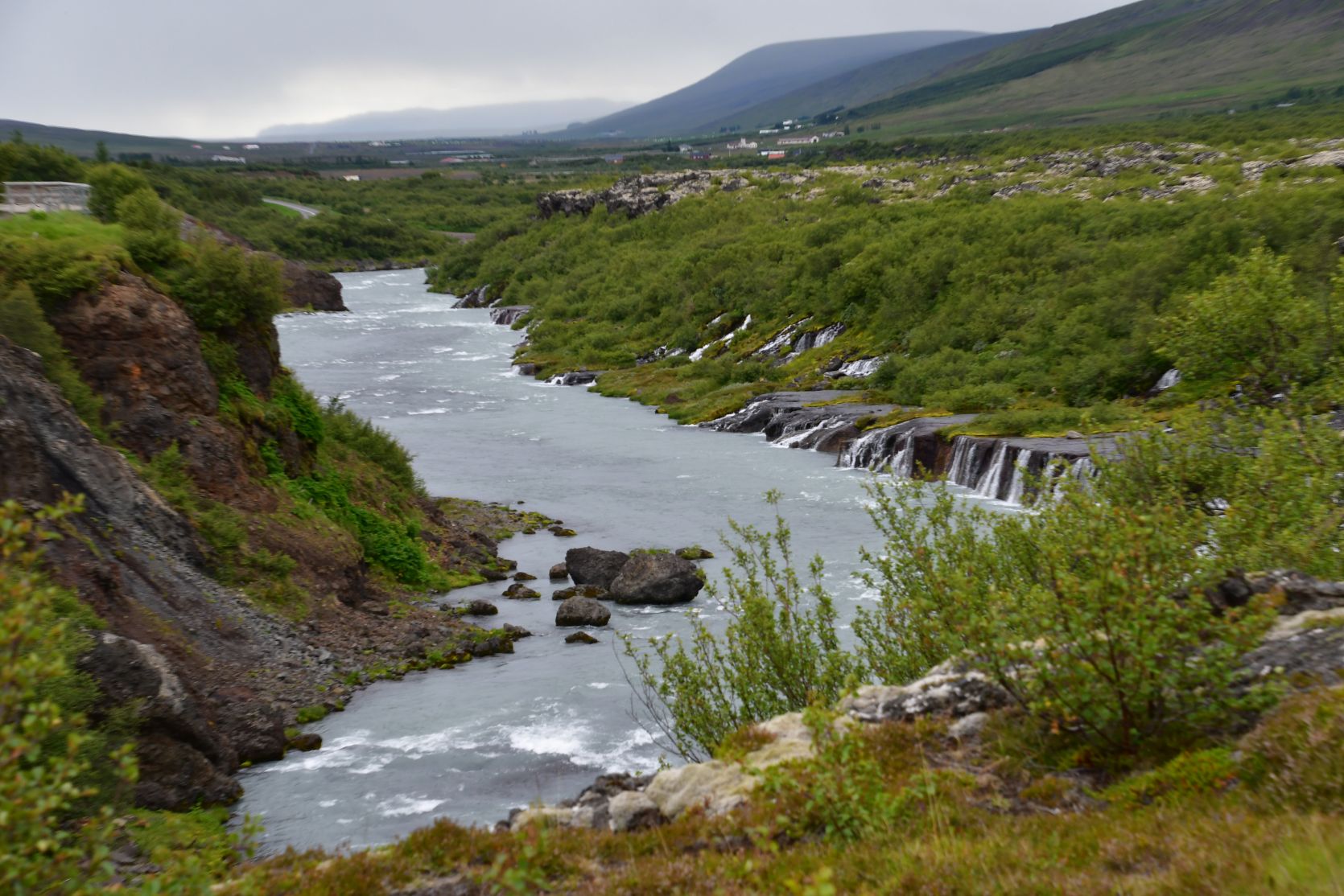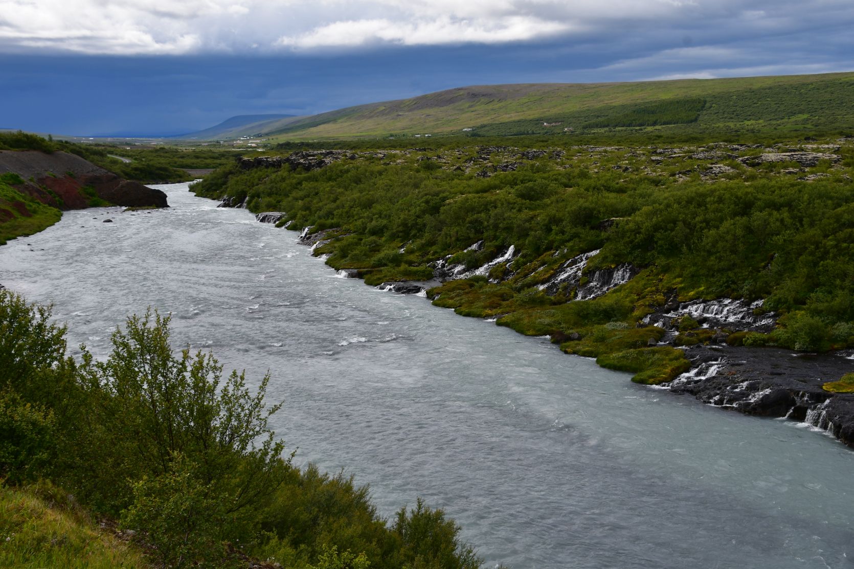 The main reason we drove that far south again was the Hraunfossar (= lava falls). It is fascinating how the water streams through layers of lava. Over a distance of more than 700 metres the water pours out of the lava, in over a hundred little waterfalls.
