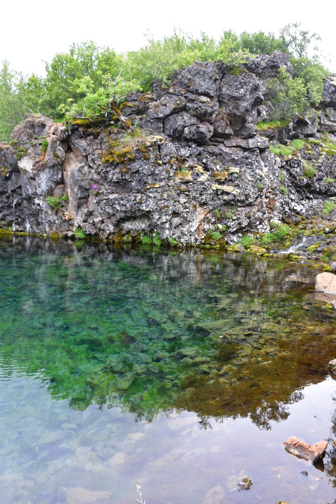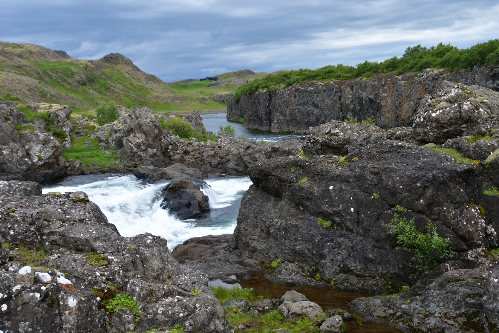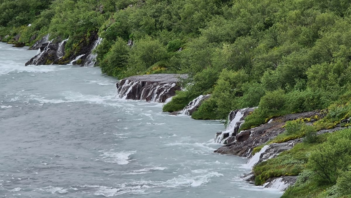 Der Hauptgrund, dass wir wieder gegen Süden gefahren sind, war der Hraunfossar (= Lava-Wasserfälle). Es ist faszinierend, wie das Wasser unter einer Lavaschicht hervortritt. Auf einer Länge von mehr als 700 Metern strömt das Wasser in über hundert Wasserfällen aus der Lava.