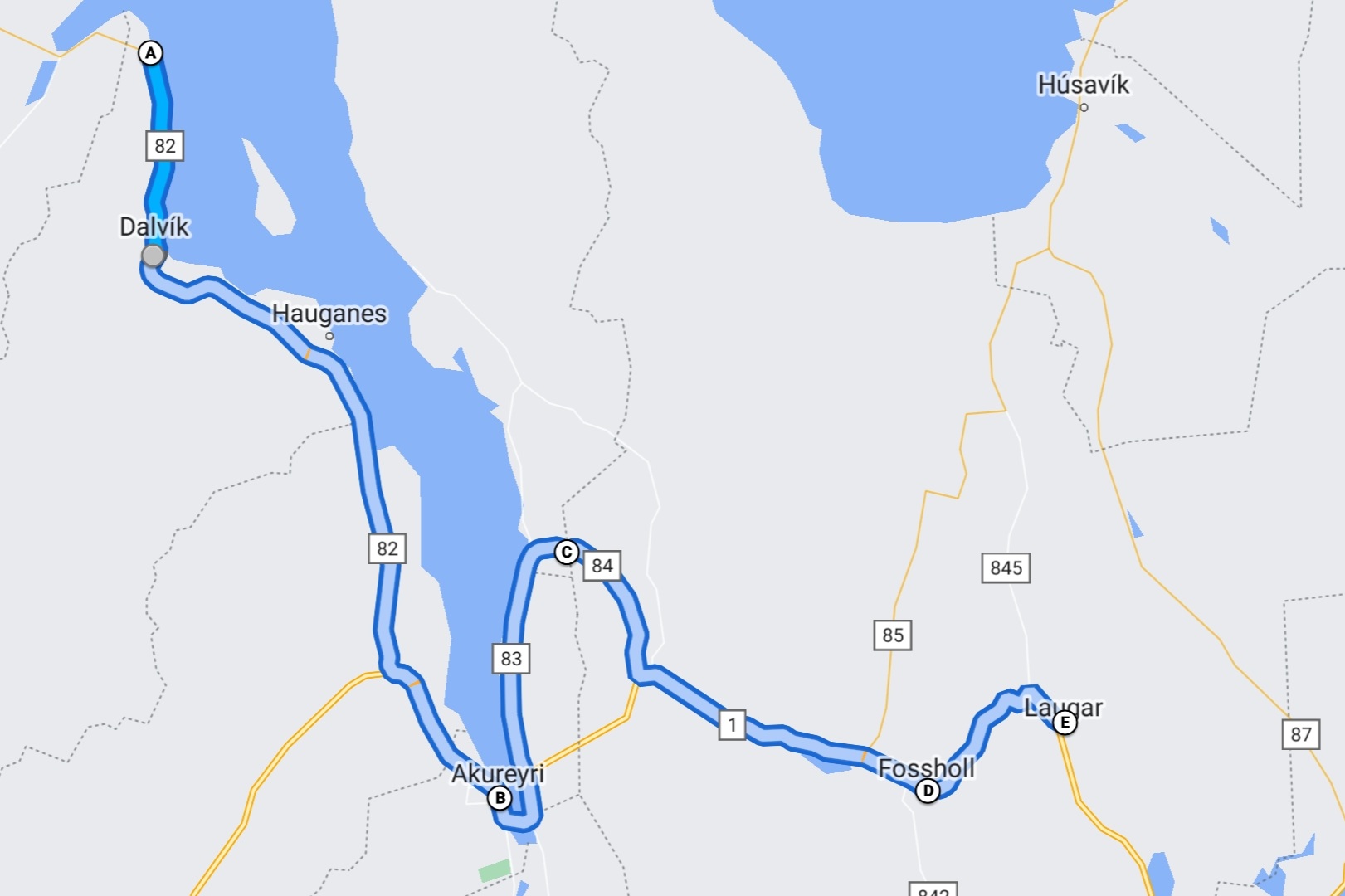 Our route that day. Goðafoss is on spot D, by Fossholl.