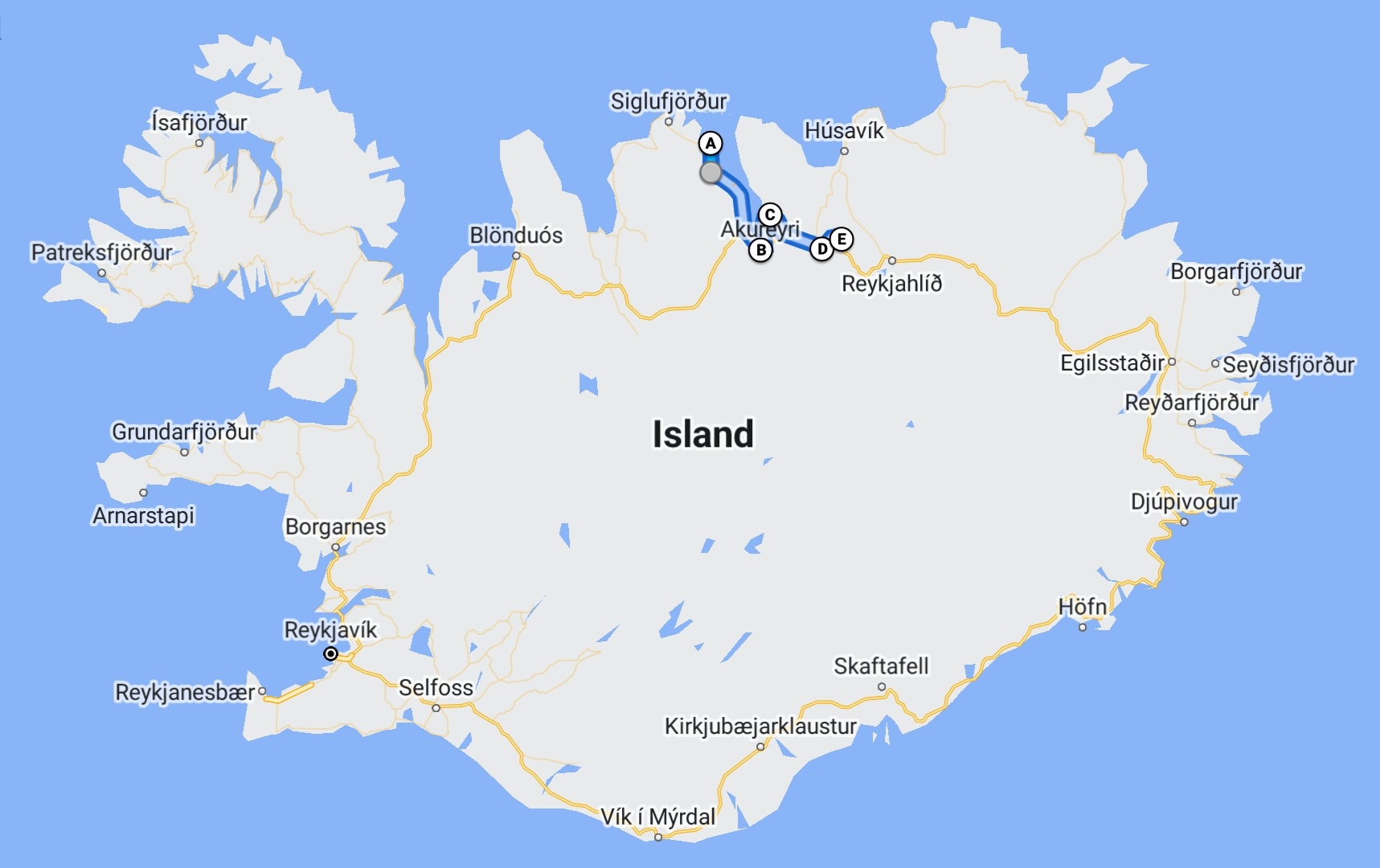 Unsere Strecke an diesem Tag. Goðafoss ist beim Punkt D, bei Fossholl.