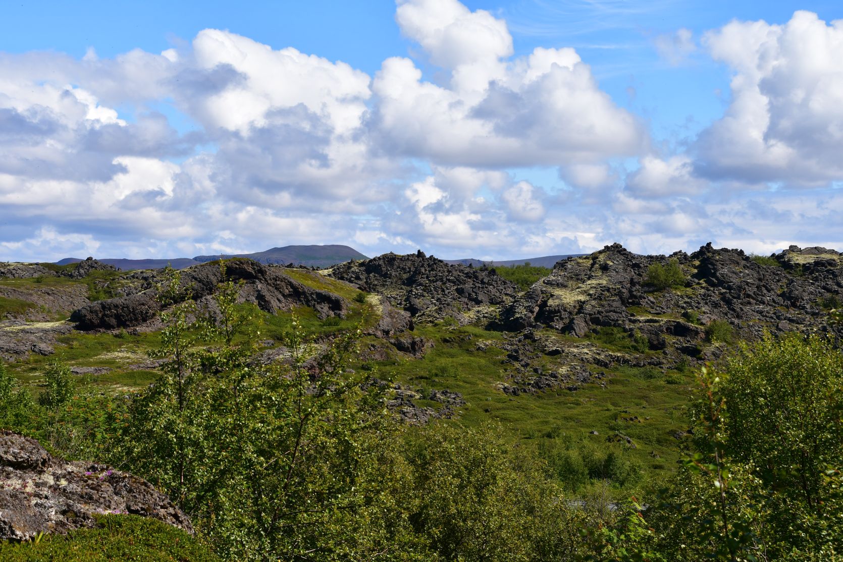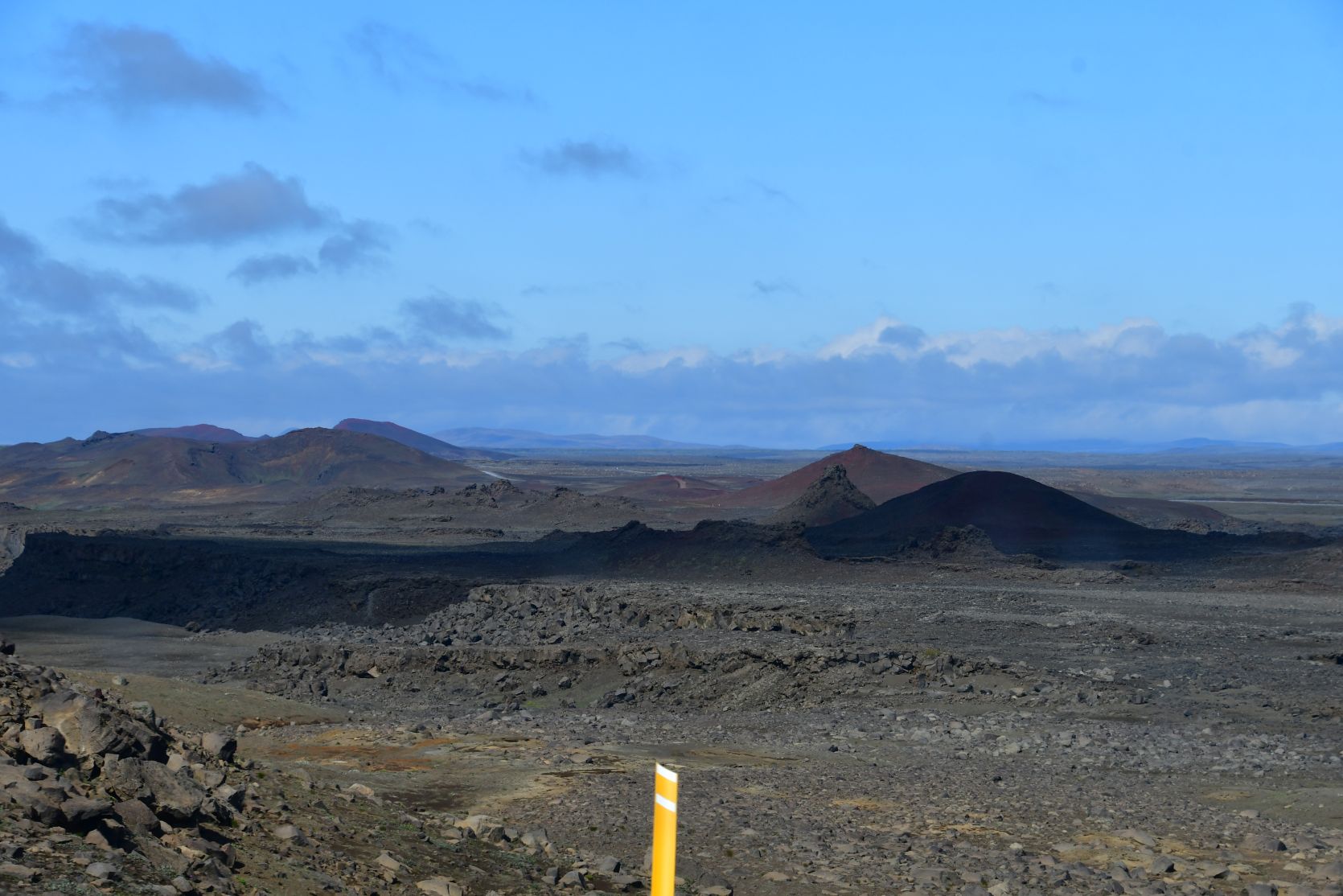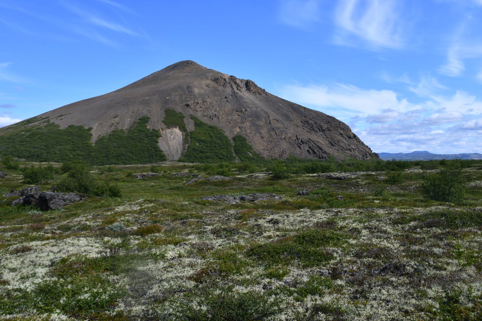 Lava ist allgegenwärtig. Der Hügel (unten rechts) ist der Vindbelgjarfjall, den wir vorher bestiegen hatten.