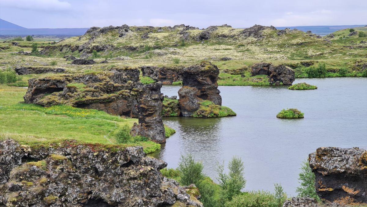 Auch Dimmuborgir, die Pseudokrater, viele dampfende Quellen und den ganzen Mývatn sieht man! Leider hatte es tausende von kleinen Fliegen…