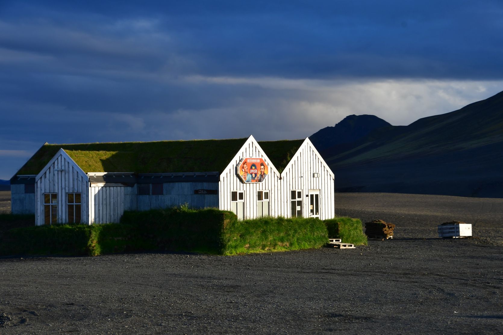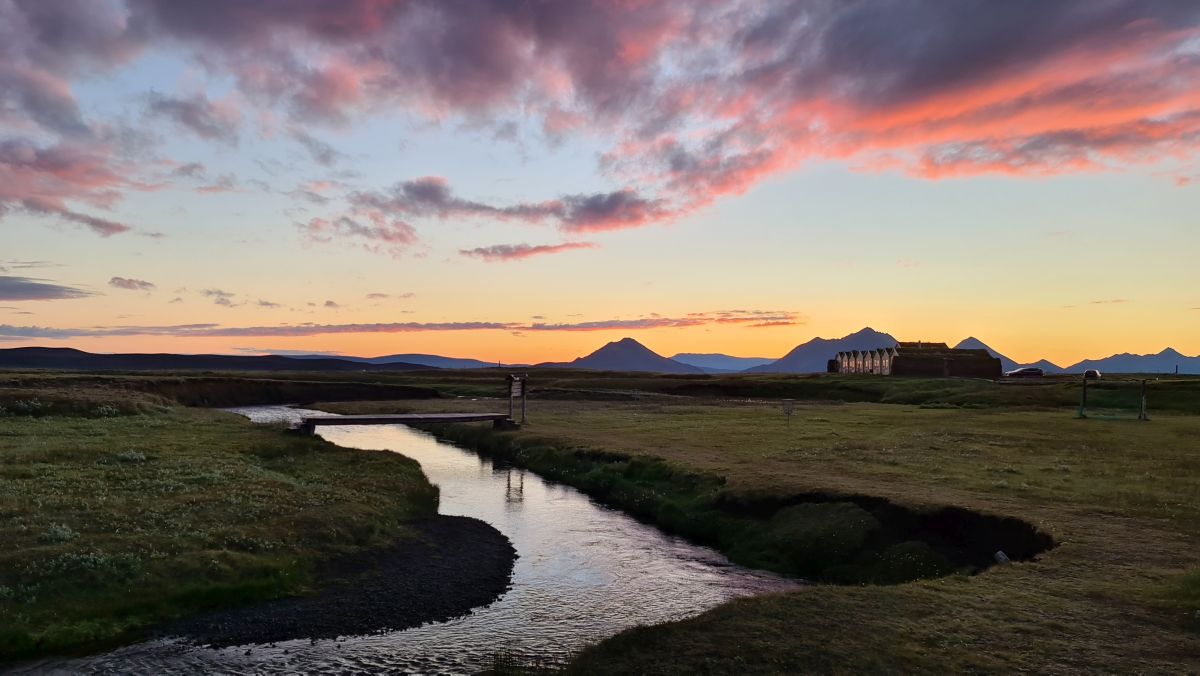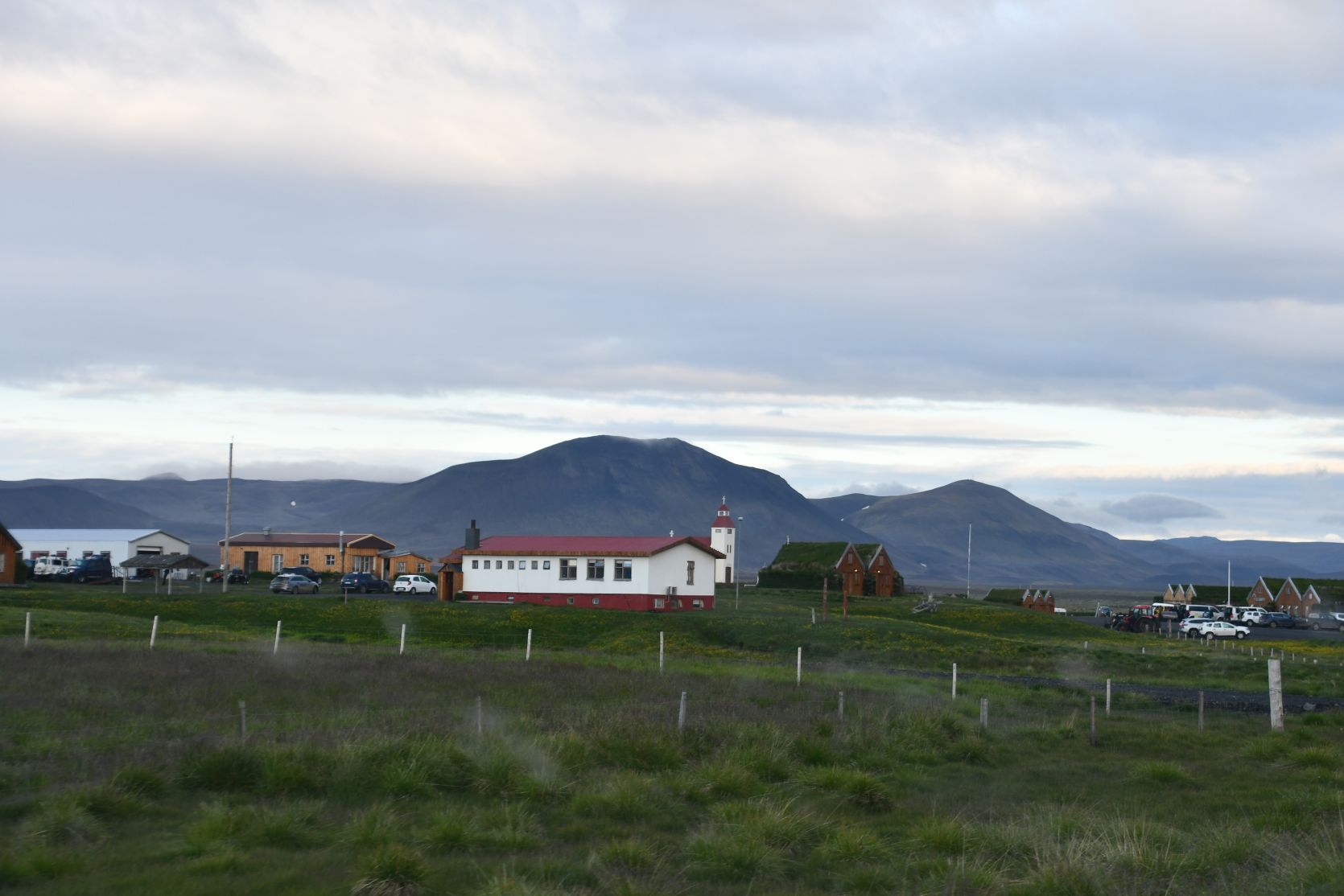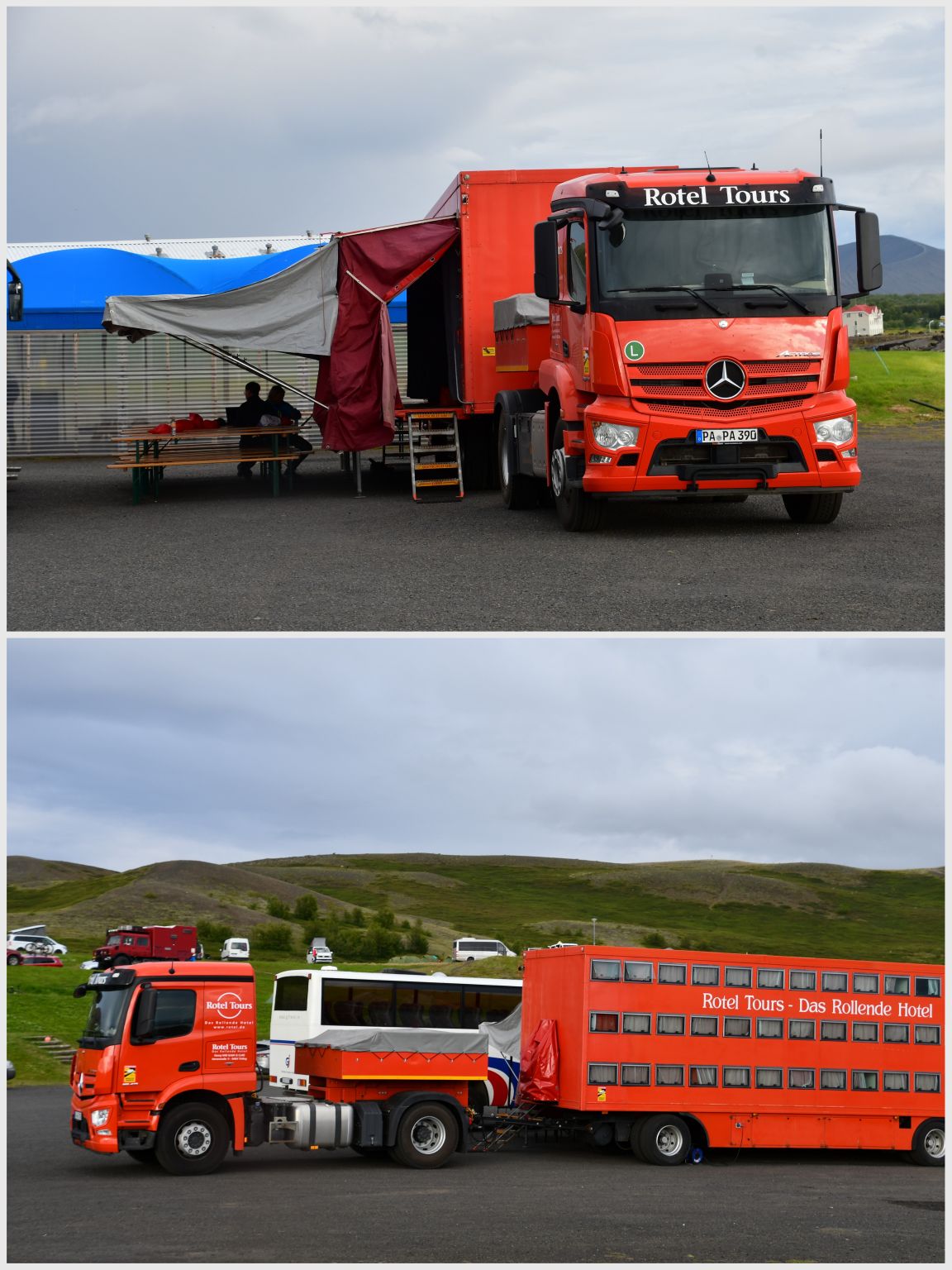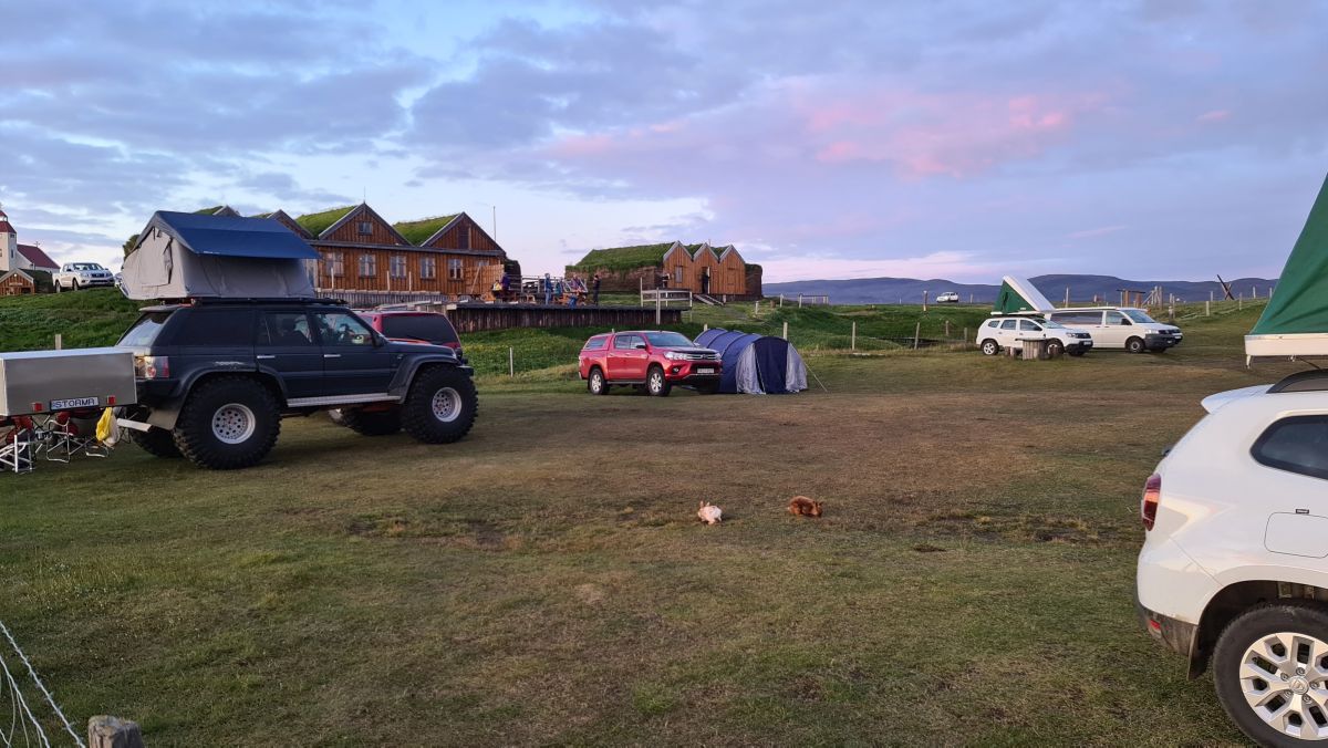 The campsite, in the middle of a lava field. The red monster is an interesting hotel 😉