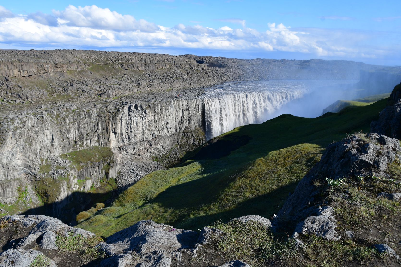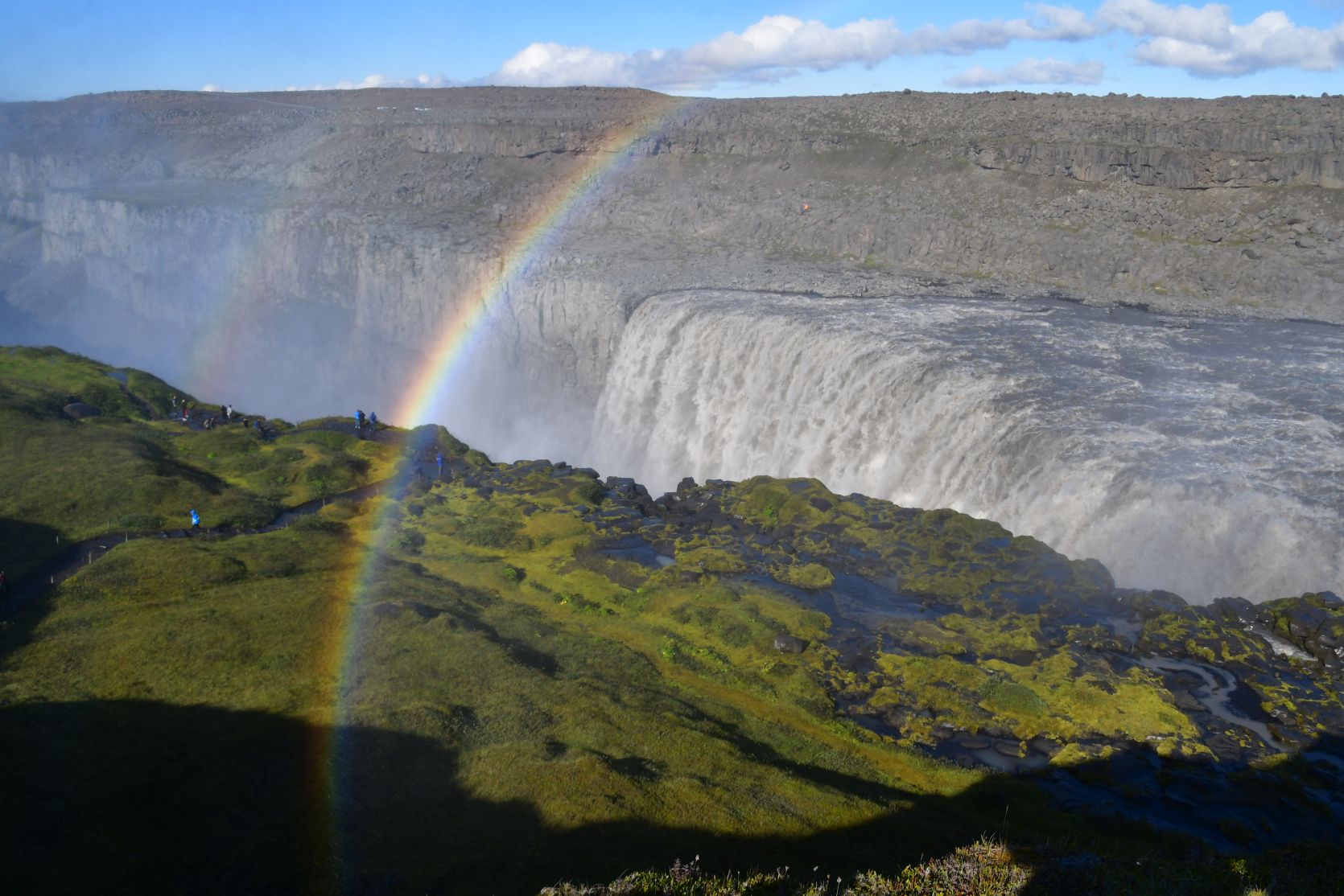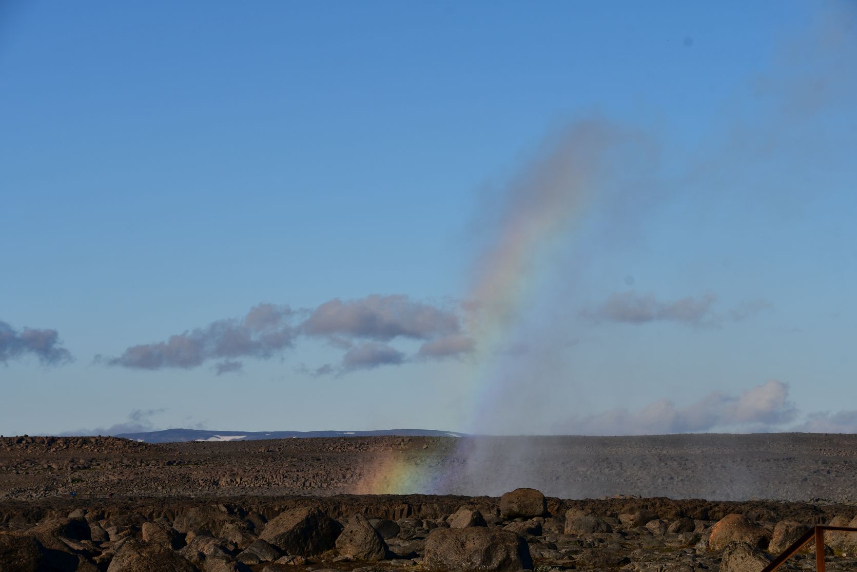 Dettifoss. The spray could be seen from far away. We approached the waterfall from the west. Last year we were on the east side, and went to see the Hafragilsfoss (about 2 km further down) first.