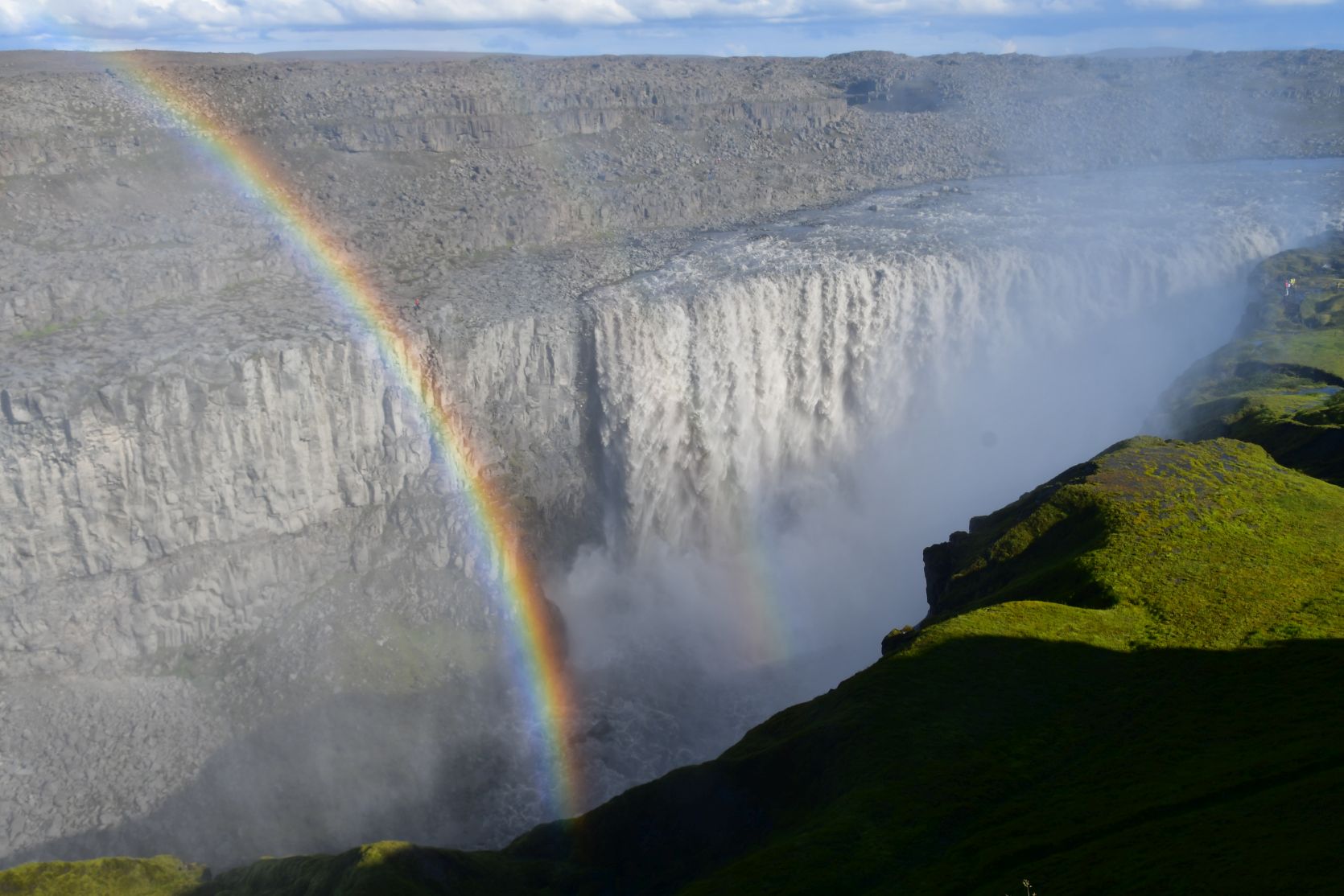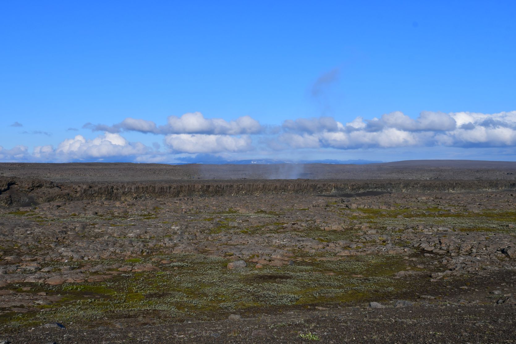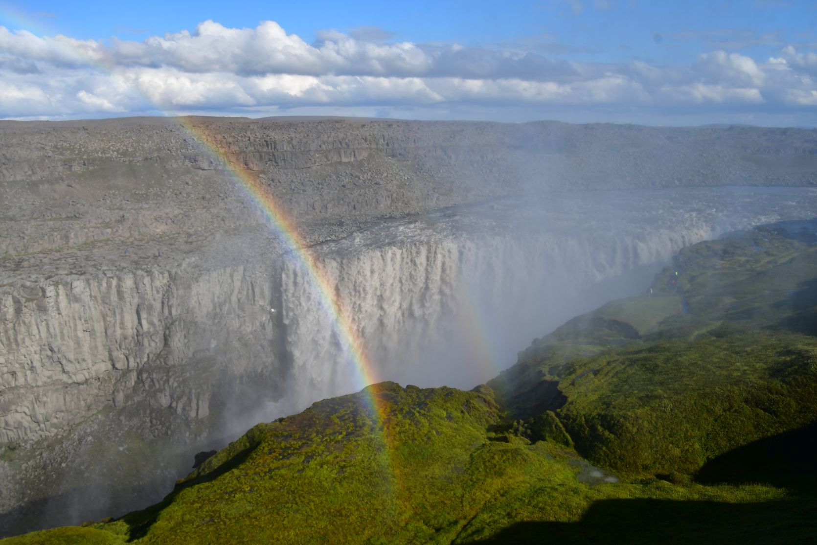Dettifoss. The spray could be seen from far away. We approached the waterfall from the west. Last year we were on the east side, and went to see the Hafragilsfoss (about 2 km further down) first.