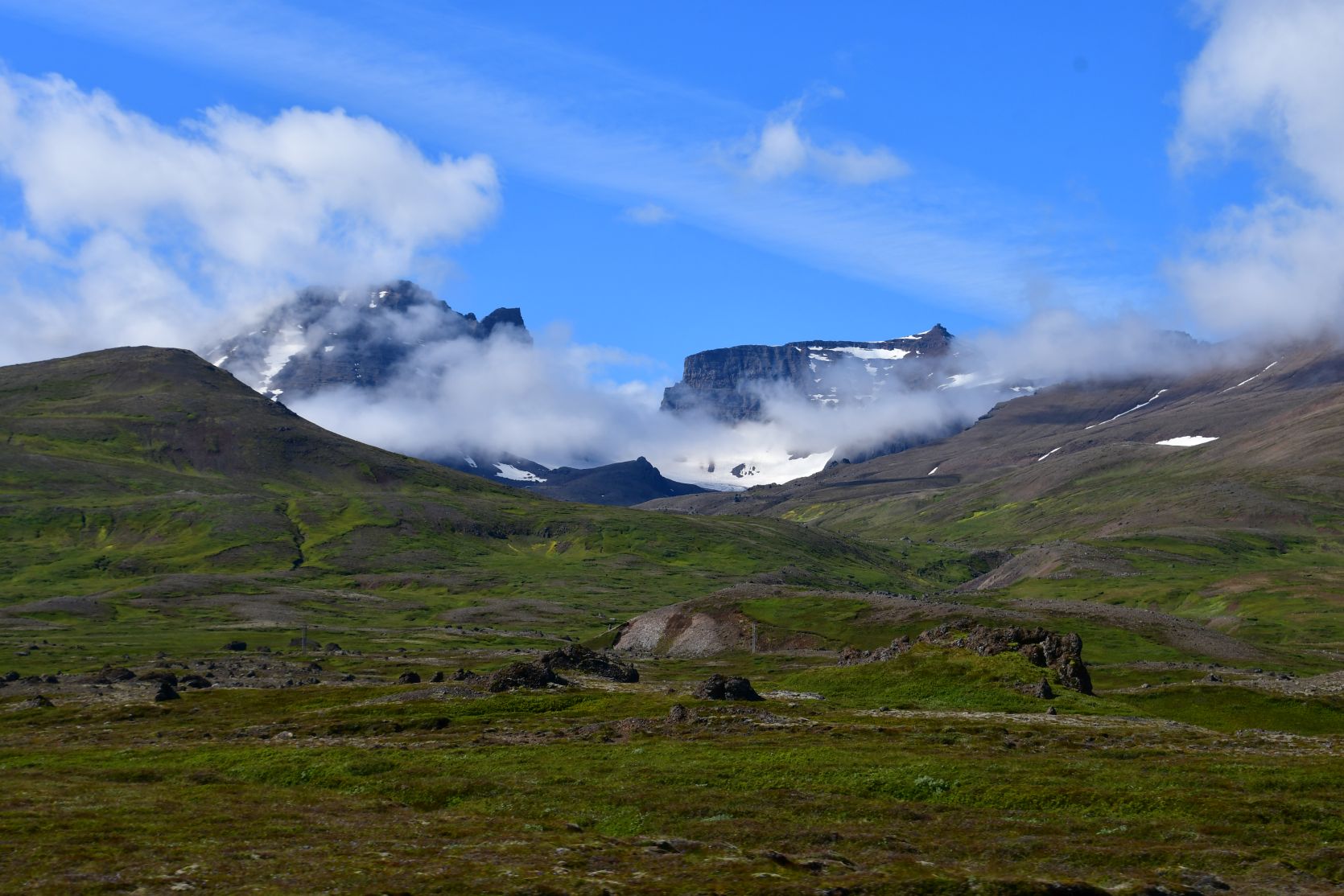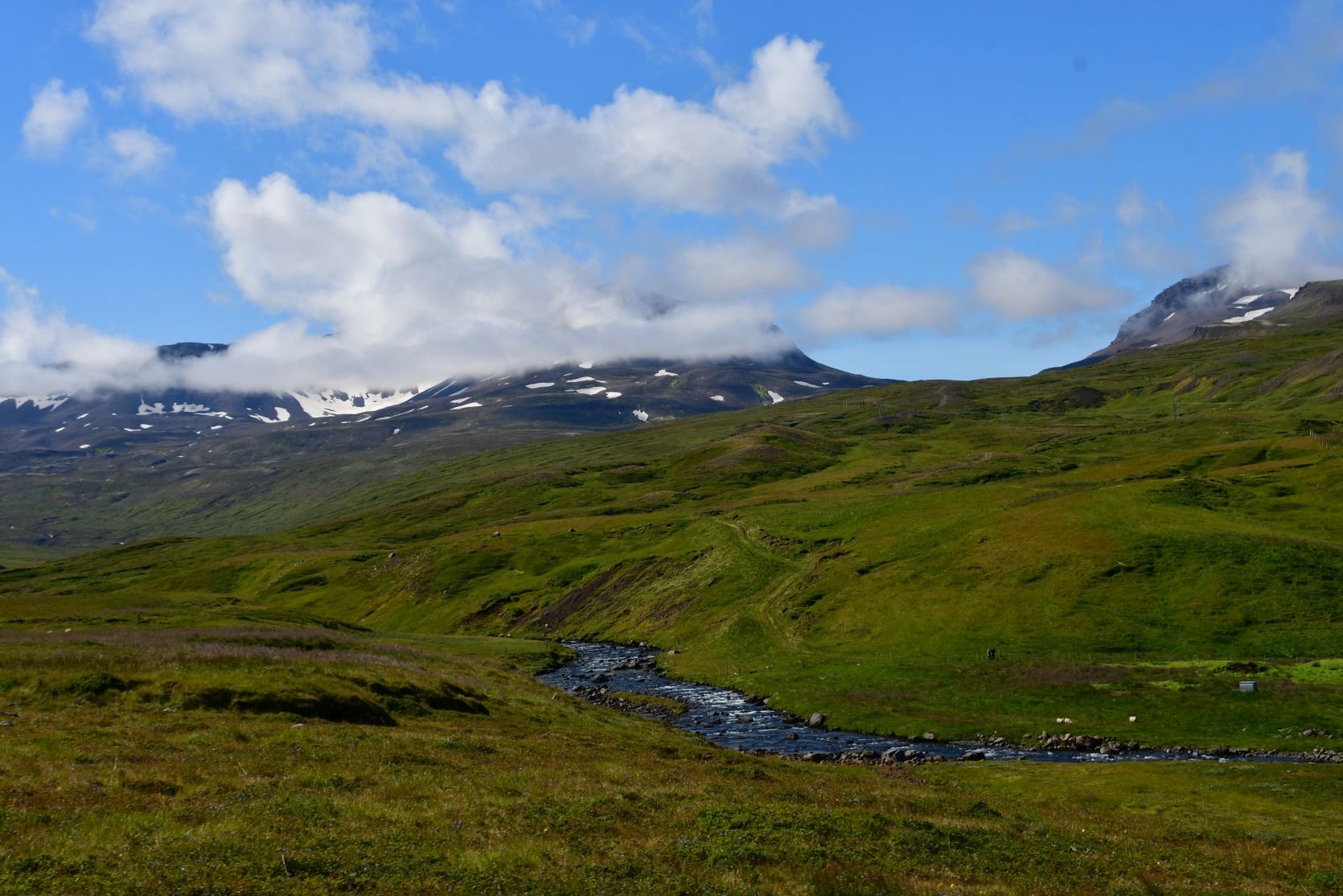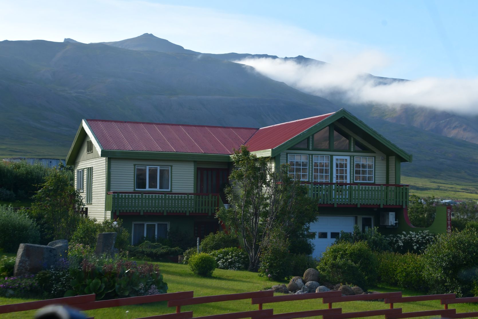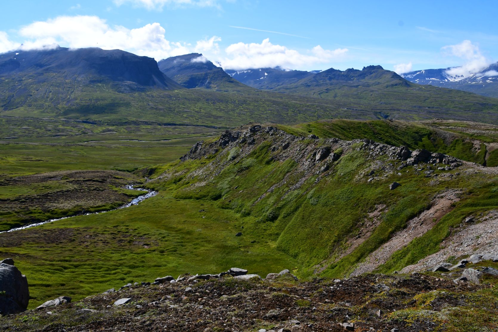 Das Dorf liegt in einem wunderschönen Tal. Die Berge ringsum sind sehr speziell gefärbt, und sie ändern ihr Erscheinungsbild je nach Licht. Wir waren schon ein paarmal dort, und haben verschiedene Wanderungen unternommen. Letztes Jahr wanderten wir über einen Pass nach Brúnavík, und zurück über einen anderen Pass.