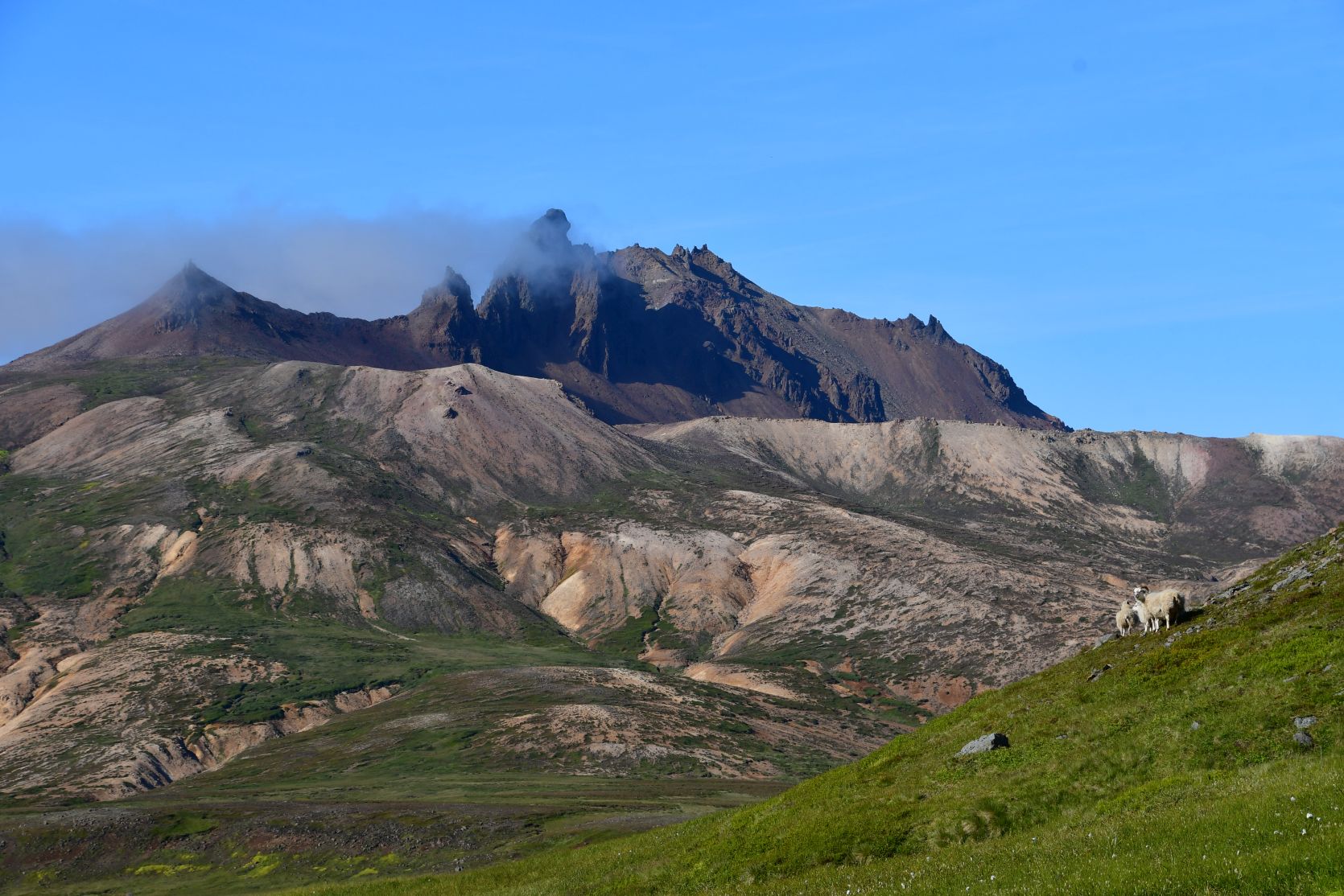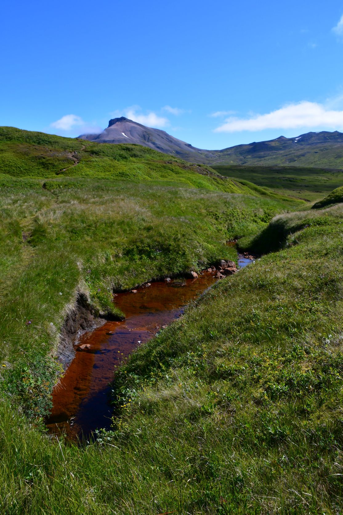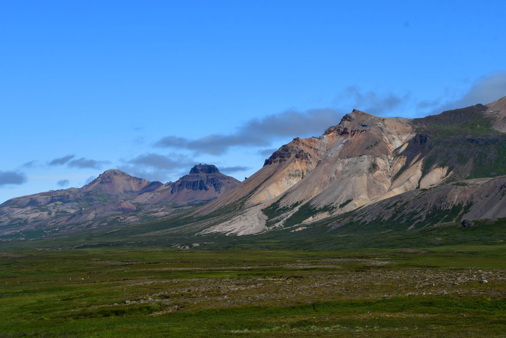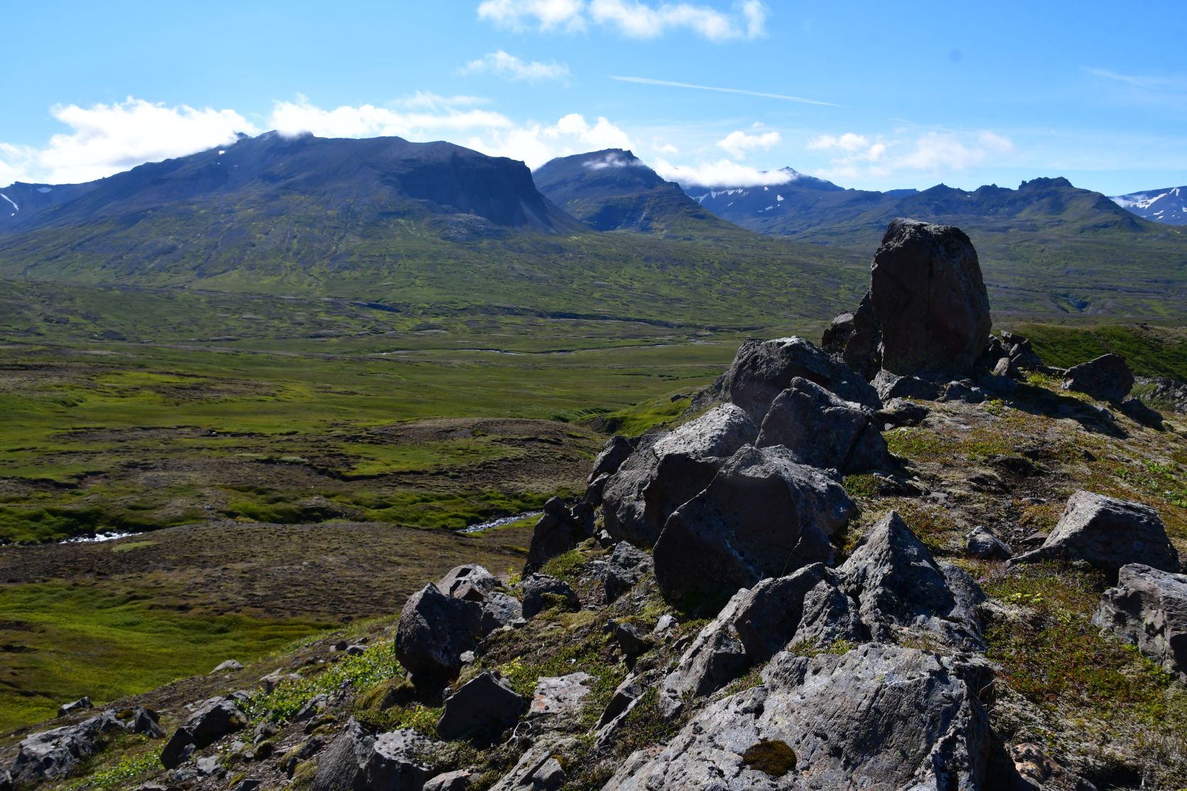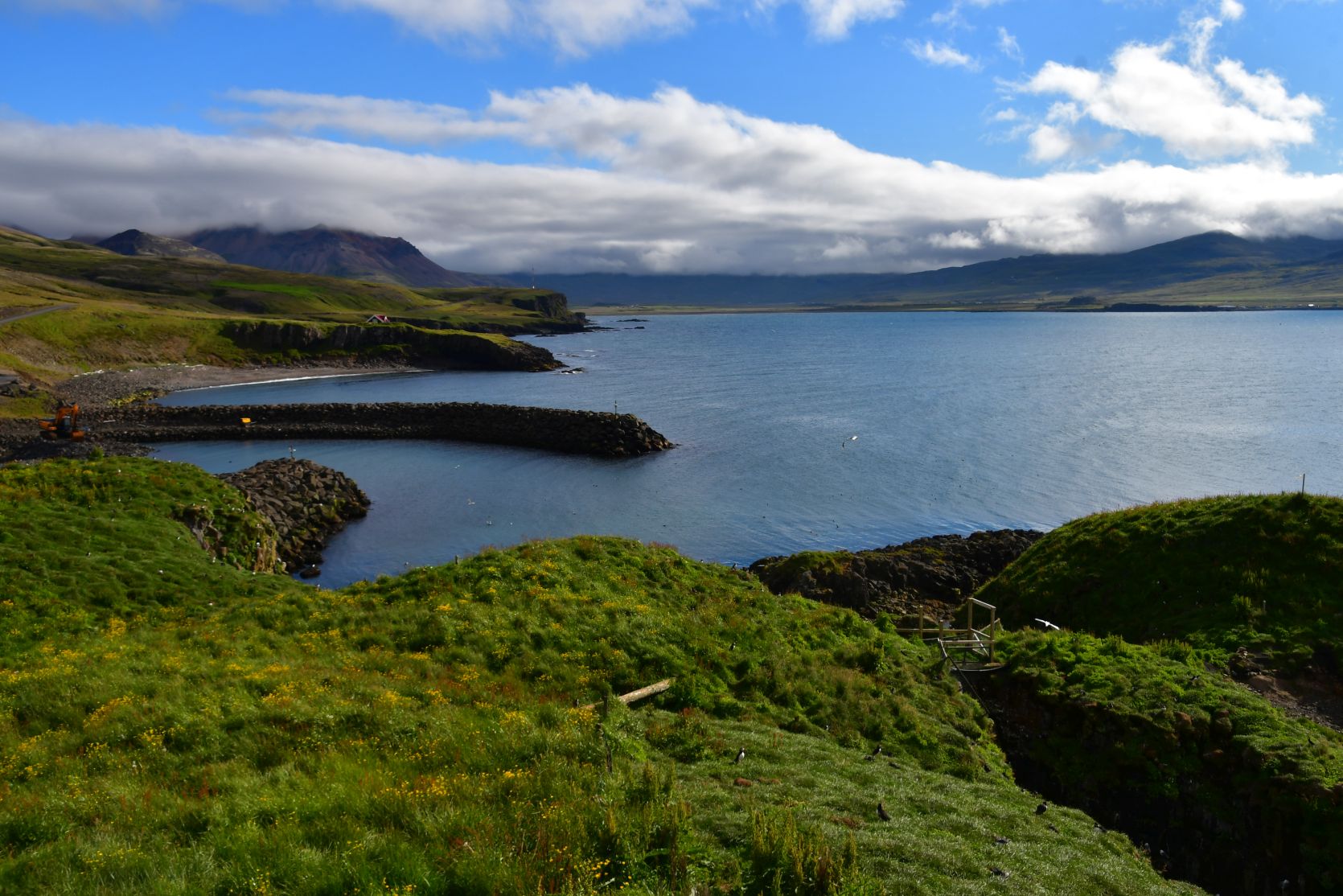 Das Dorf liegt in einem wunderschönen Tal. Die Berge ringsum sind sehr speziell gefärbt, und sie ändern ihr Erscheinungsbild je nach Licht. Wir waren schon ein paarmal dort, und haben verschiedene Wanderungen unternommen. Letztes Jahr wanderten wir über einen Pass nach Brúnavík, und zurück über einen anderen Pass.