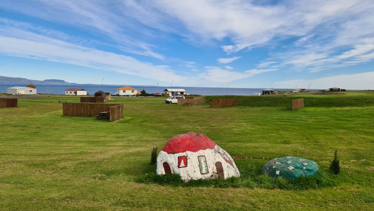 Der Campingplatz ist sehr einfach. Offenbar war kürzlich ein Festival, und das hübsche, neu erstellte Dusch-Häuschen wurde von Betrunkenen zerstört! Gibt’s das doch auch in Island…