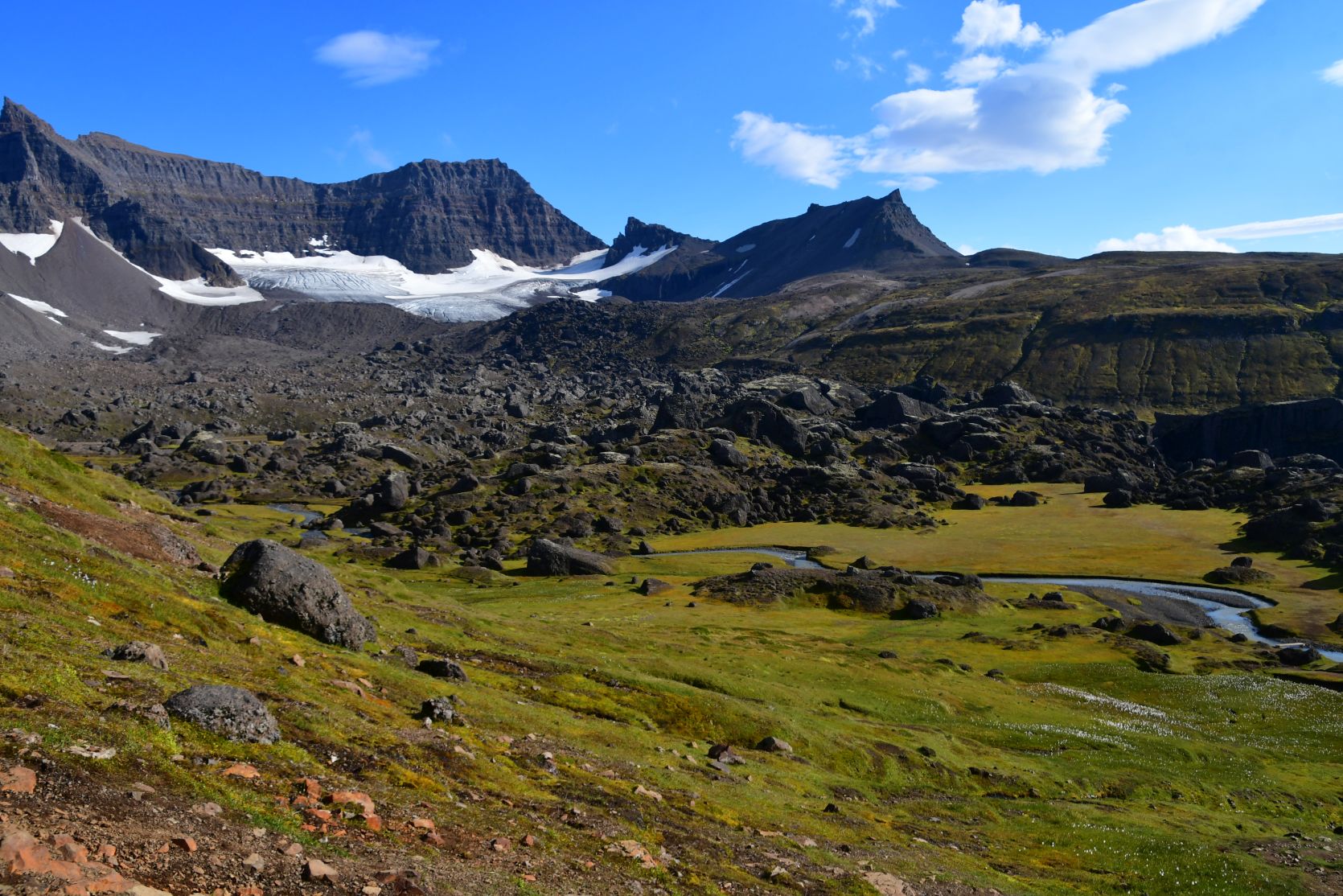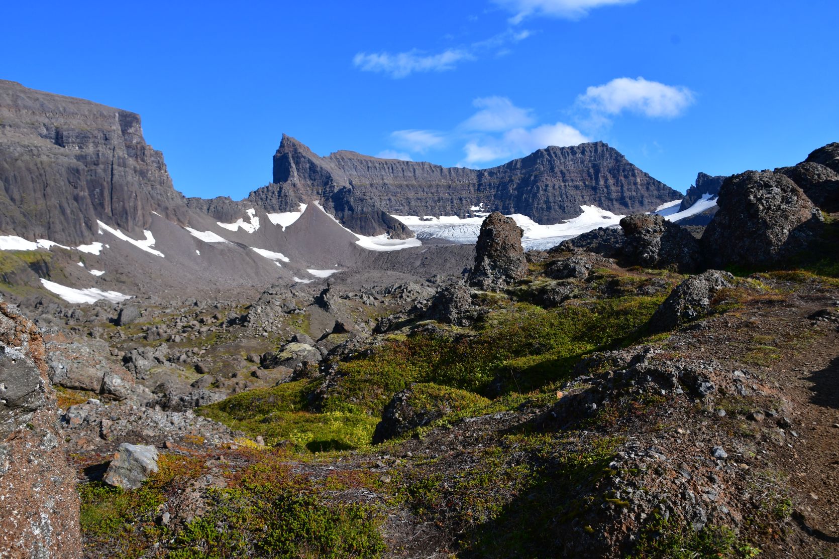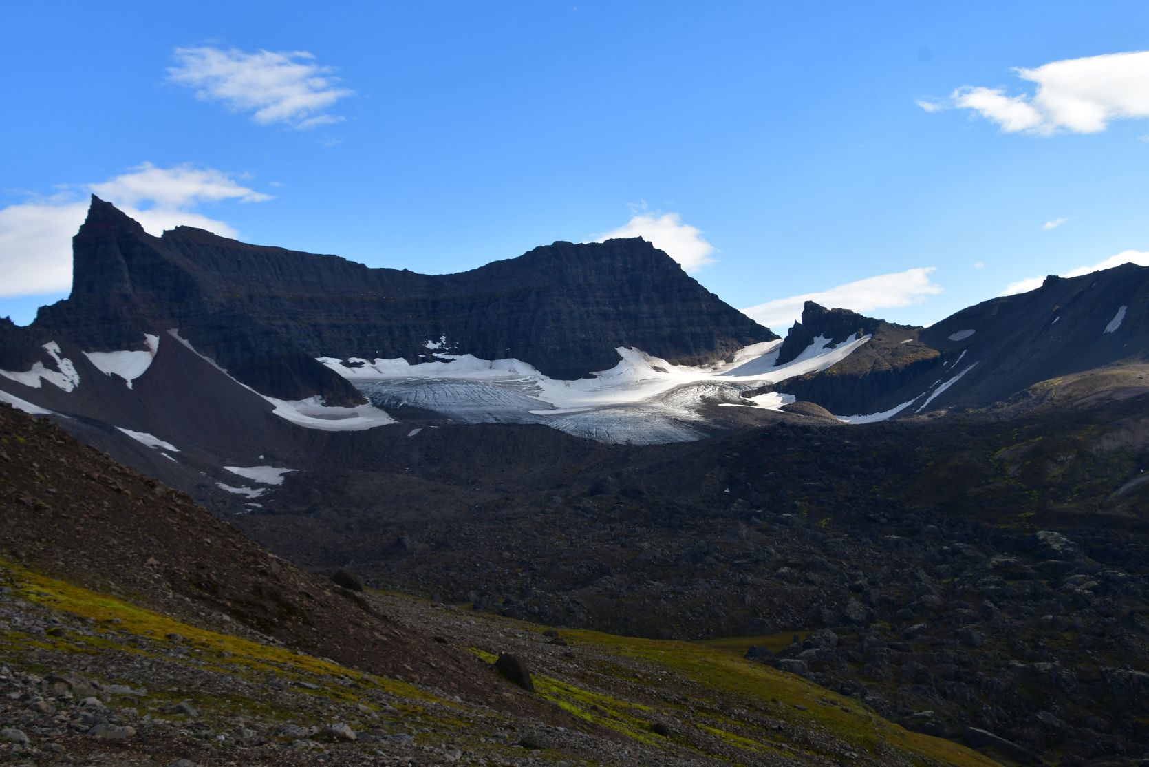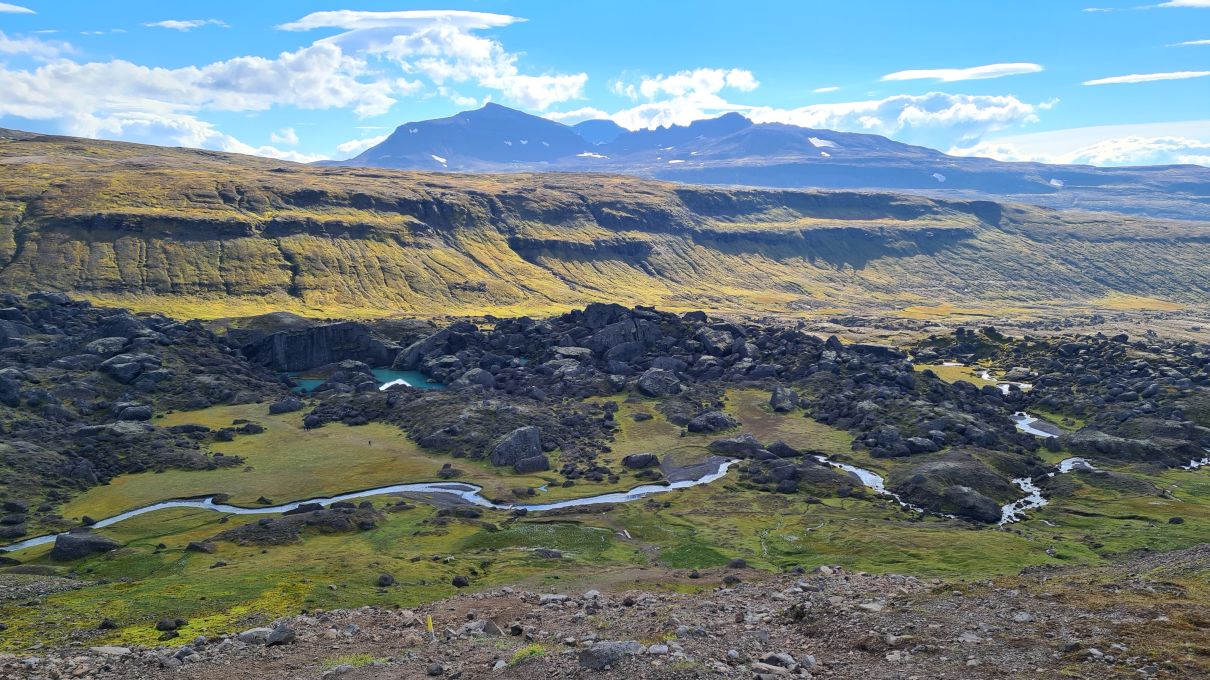 We could see Stórurð from far away, below the snowfields.