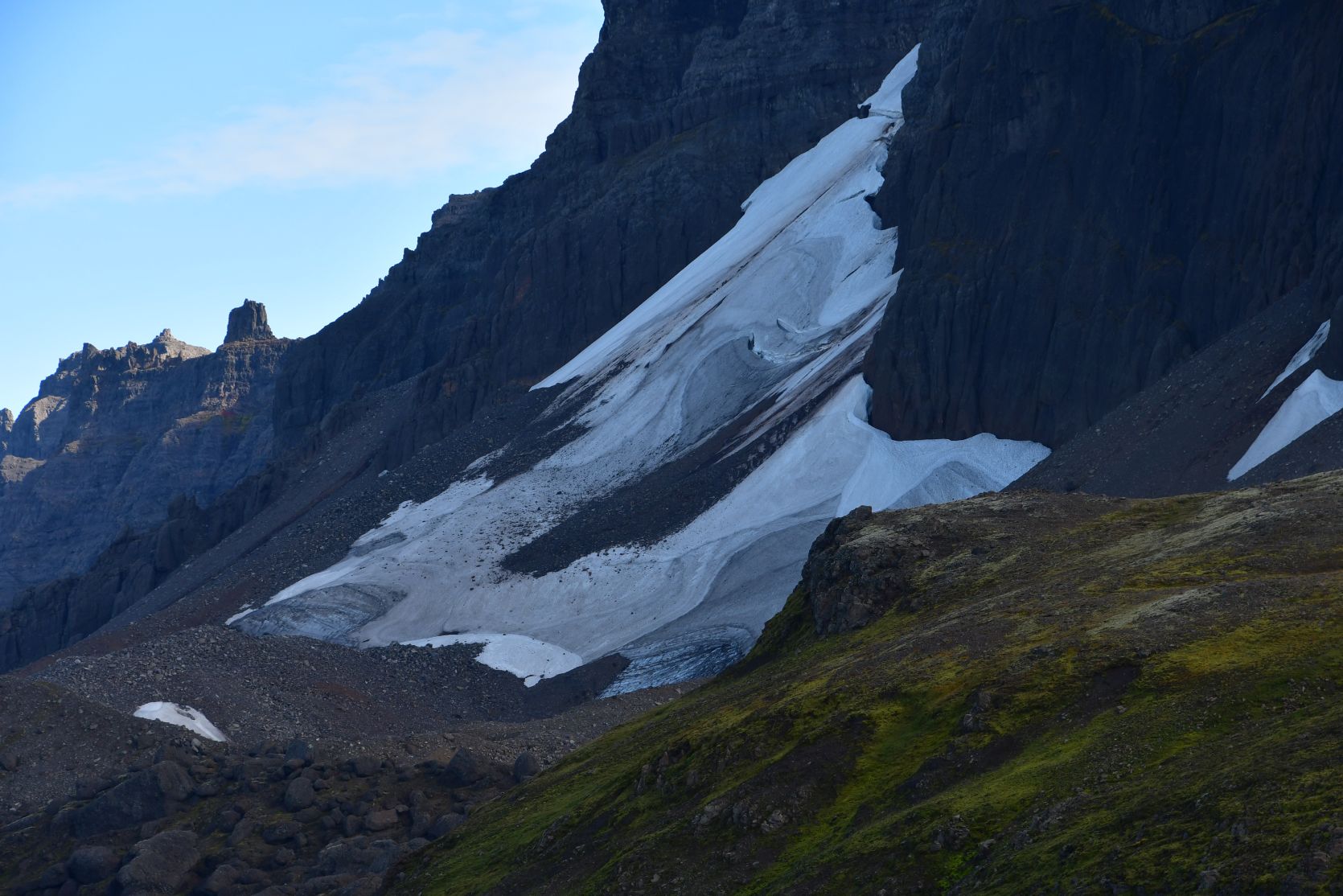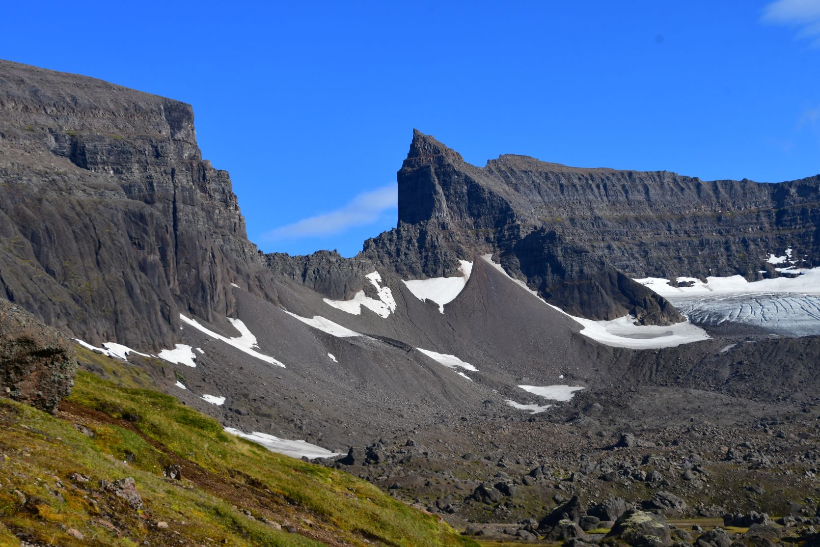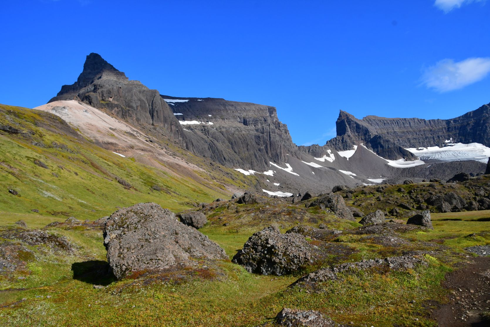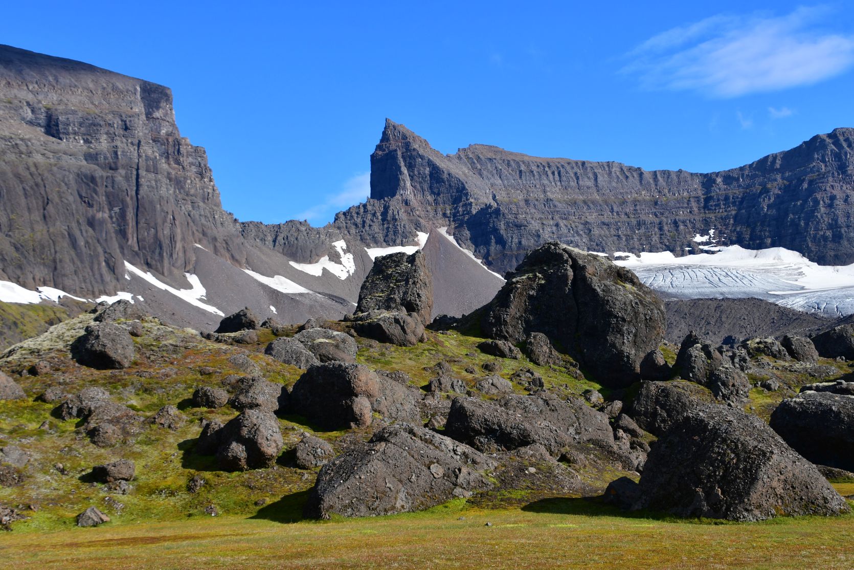 Wir konnten Stórurð schon von weitem sehen, unterhalb der Schneefelder.