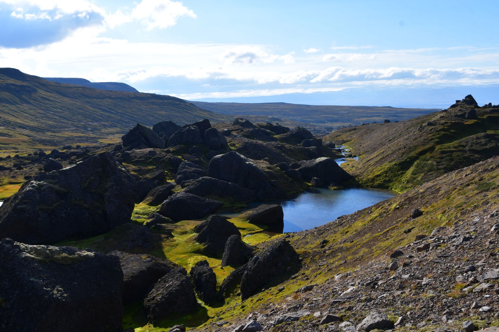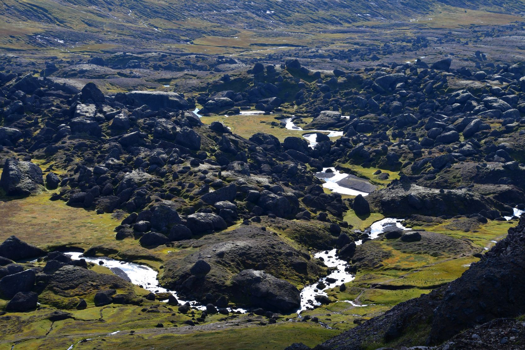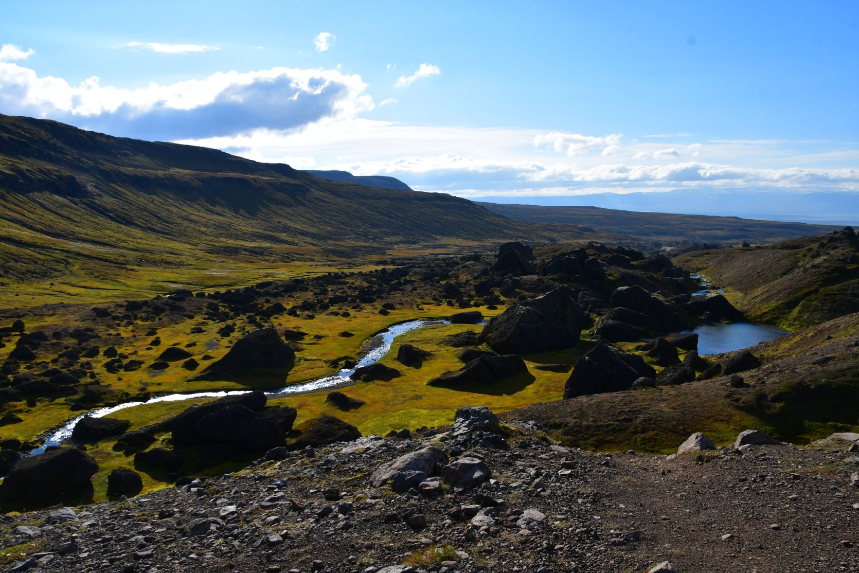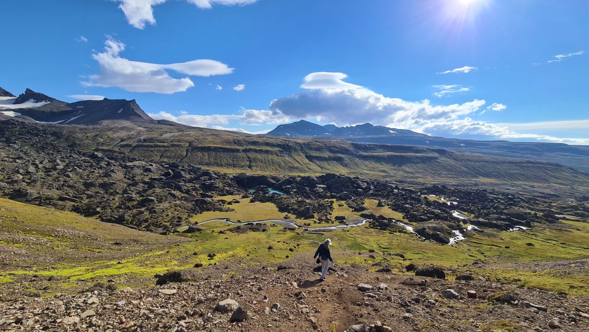 At one point we were above Stórurð, and we overlooked the whole area. Stórurð translates to „the giant boulders“.