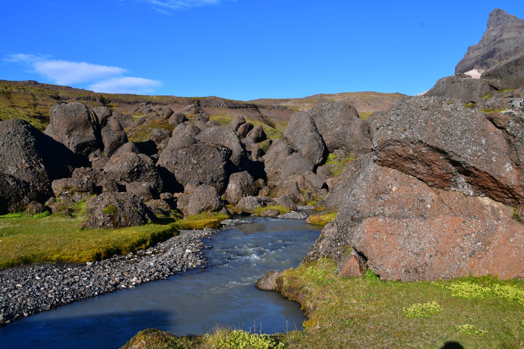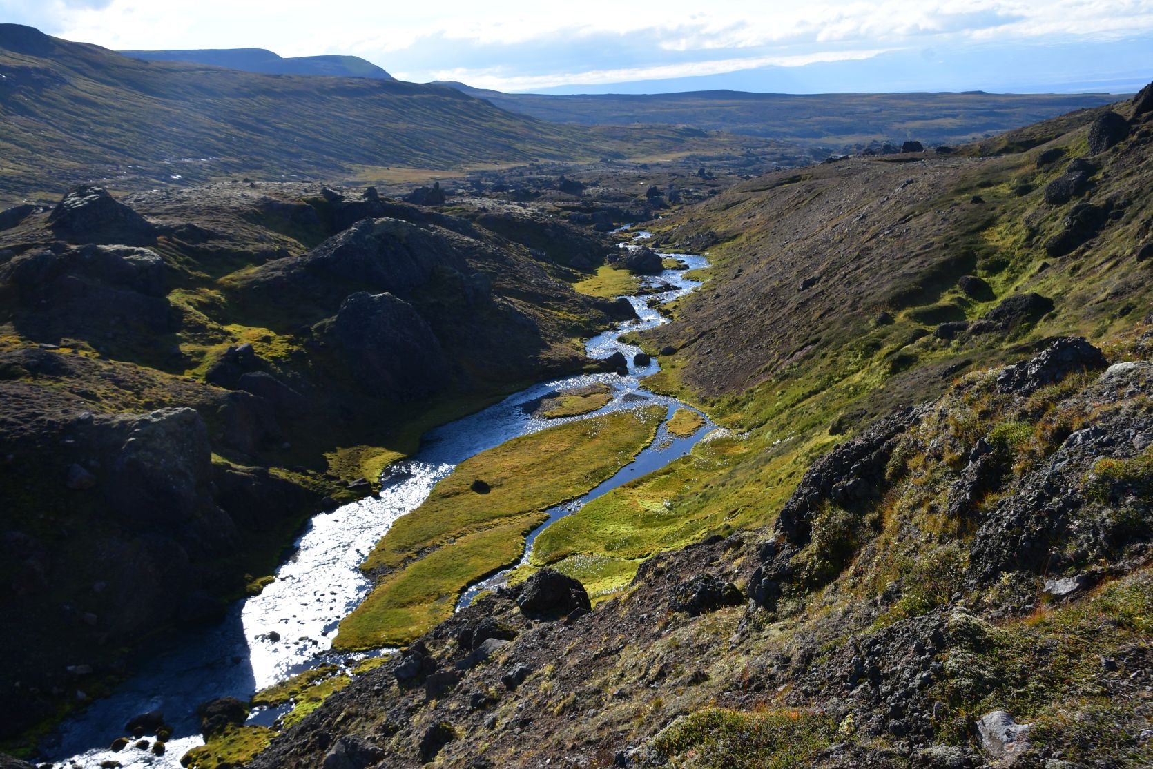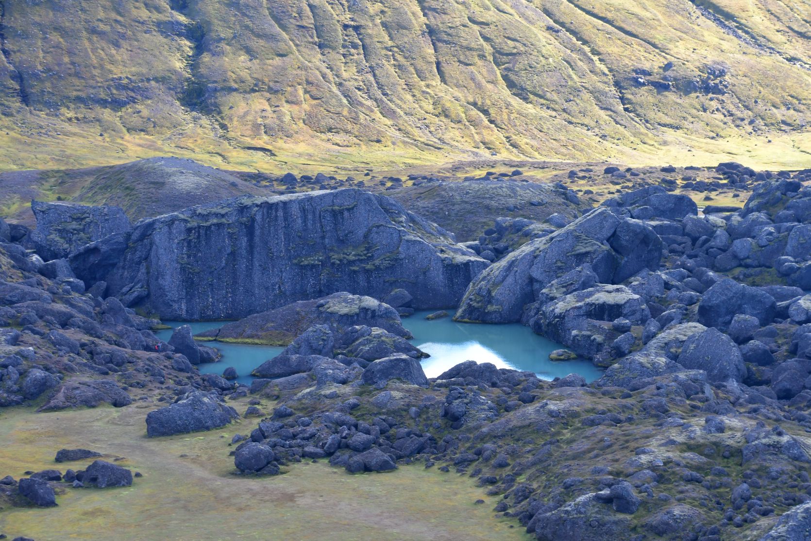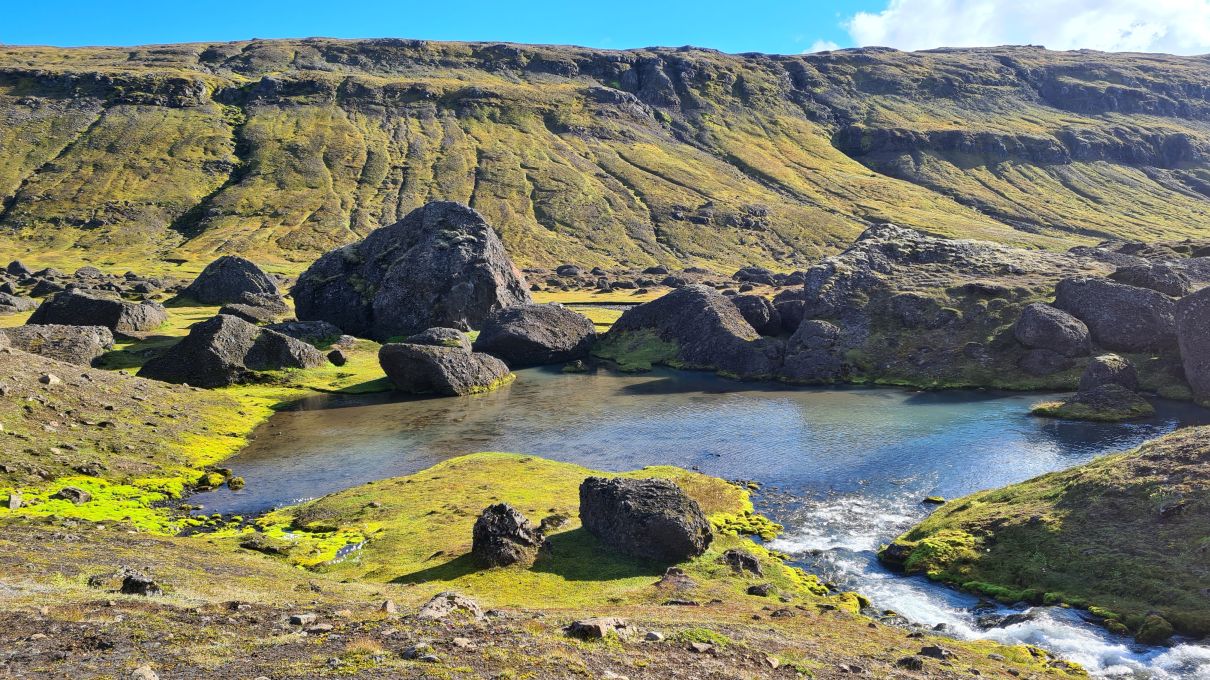 At one point we were above Stórurð, and we overlooked the whole area. Stórurð translates to „the giant boulders“.