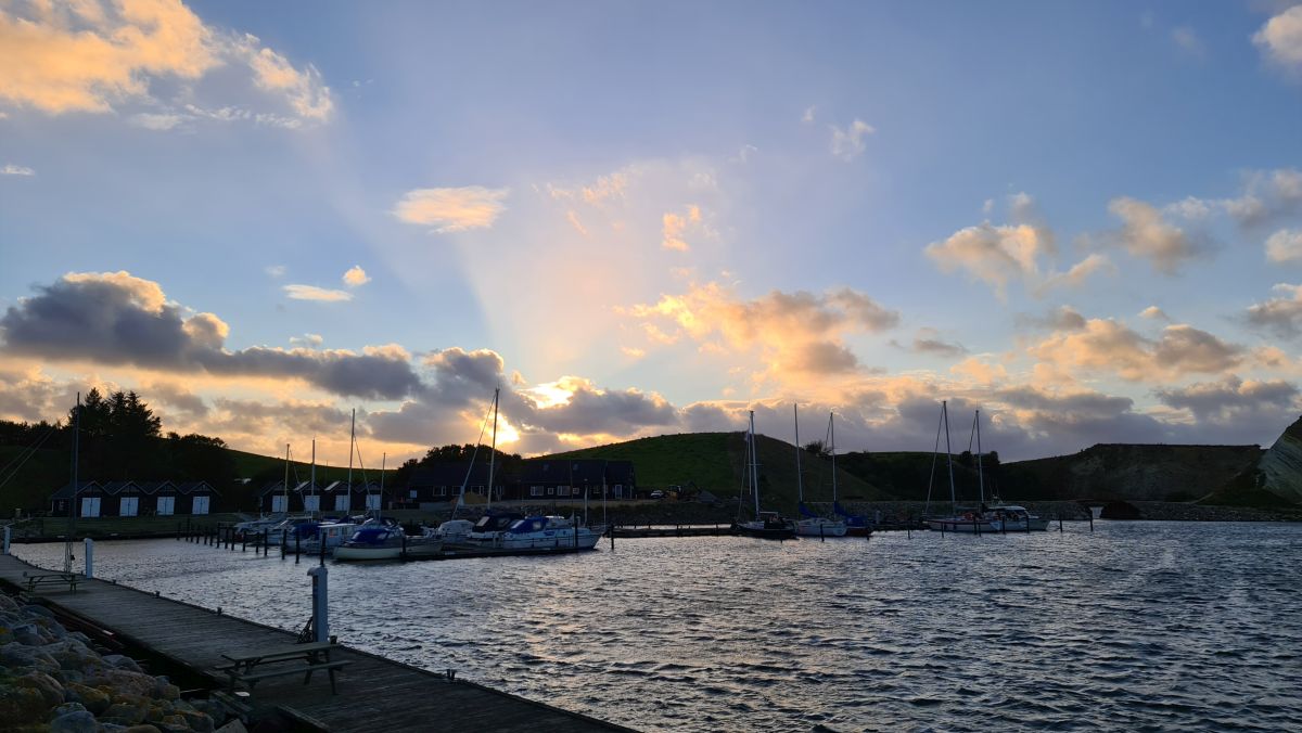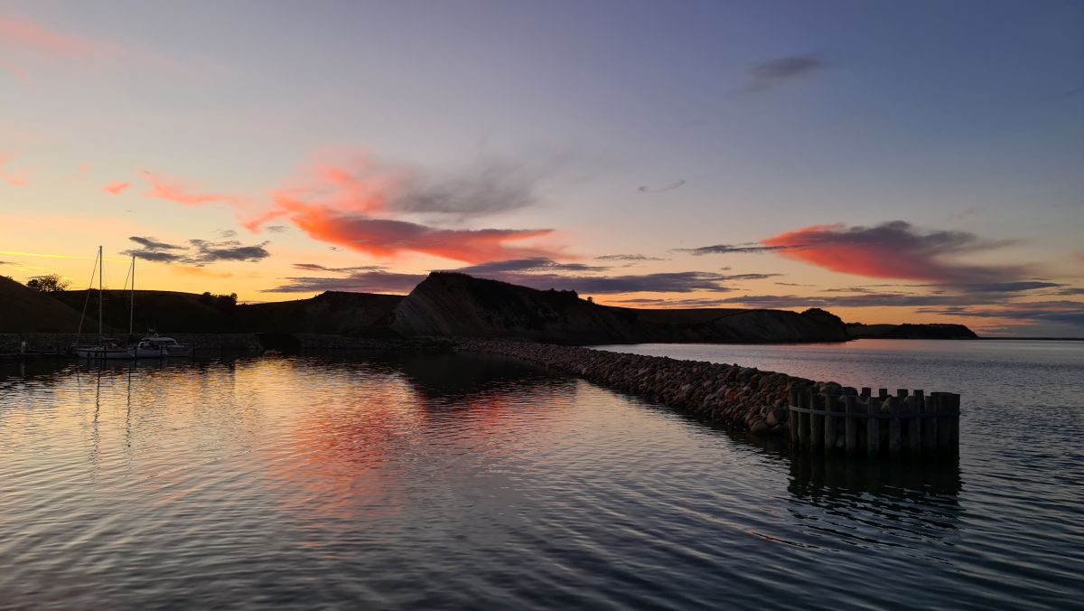 Unser Abendspaziergang zum Hafen und den Moler Klippen. Moler ist ein Sedimentgestein aus Kieselalgen und Tonmineralen, mit Vulkanasche dazwischen. Es ist reich an Pflanzen- und Tierfossilien.