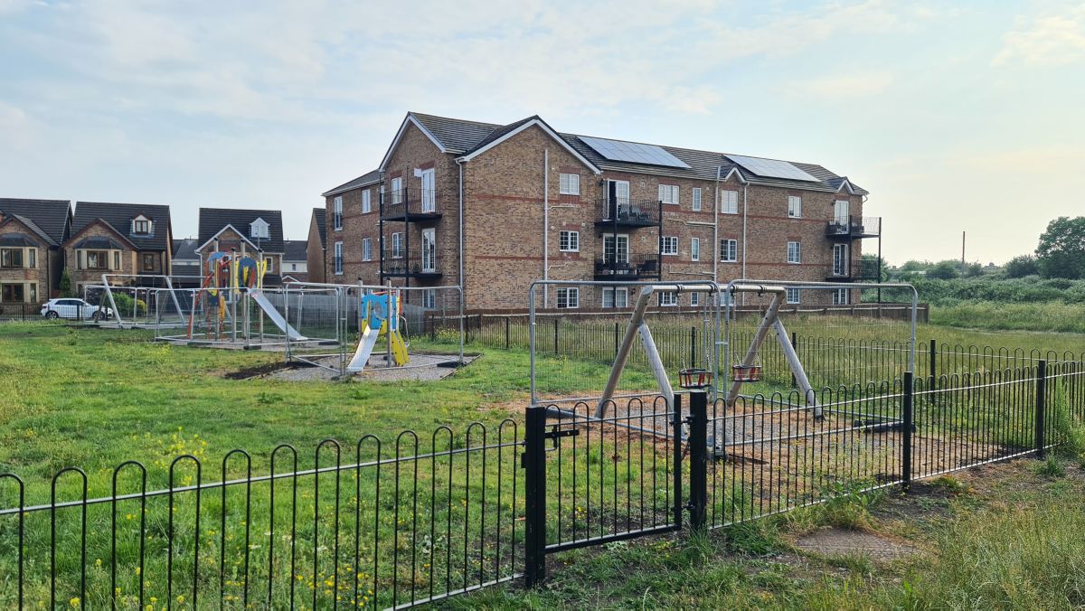 Im Norden scheinen Züge oft keinen Führerstand zu haben ! Ein anderes Detail: im Vereinigten Königreich sind „Gesundheit und Sicherheit“ Vorschriften sehr wichtig. Dieser Spielplatz zum Beispiel musste gebaut werden, als die Überbauung gemacht wurde. Die Baufirma will den Spielplatz aber nicht instand halten, deshalb hat die Gemeinde die einzelnen Geräte abgesperrt – aus Sicherheitsgründen…