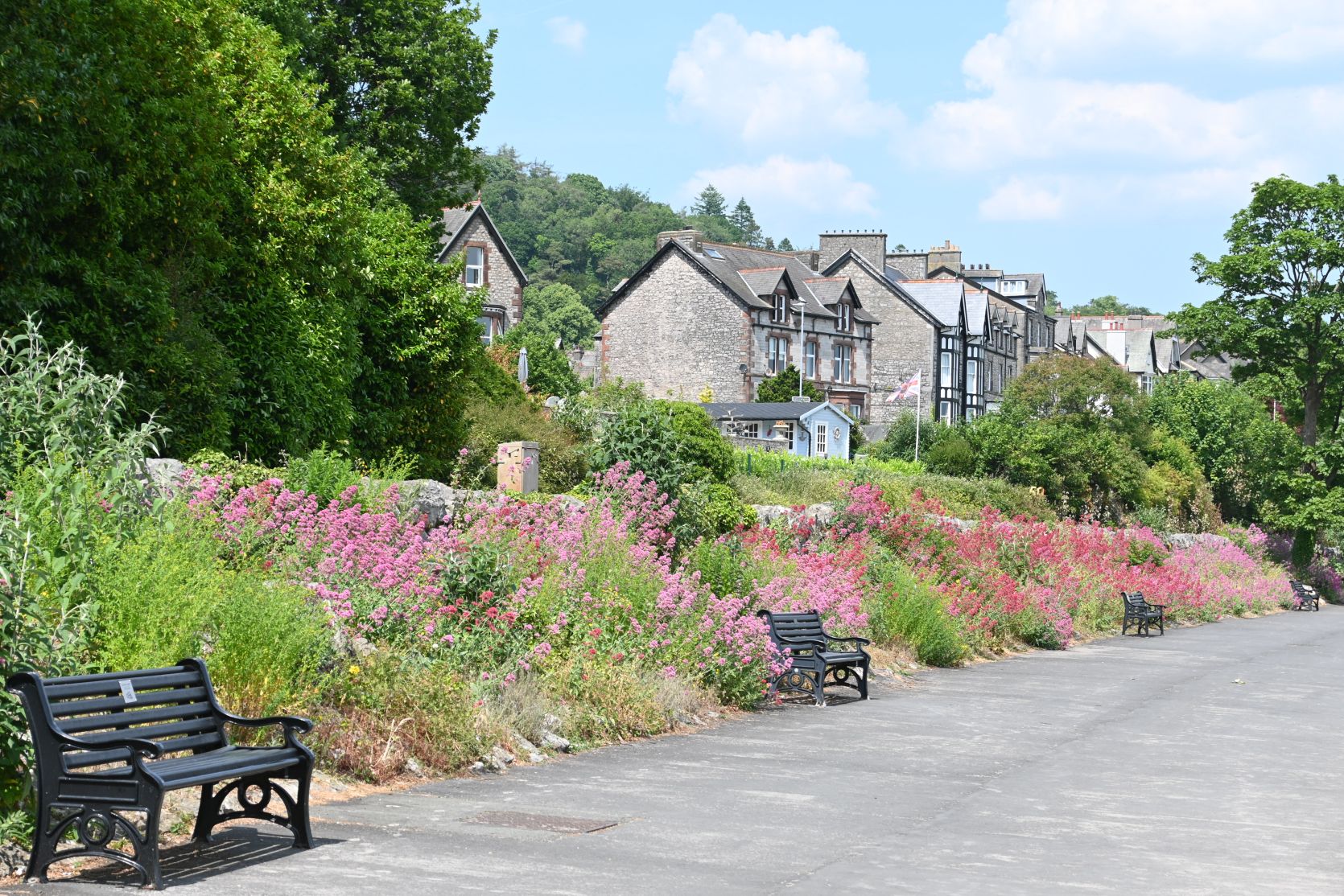There is a nice promenade with lots of flowers.