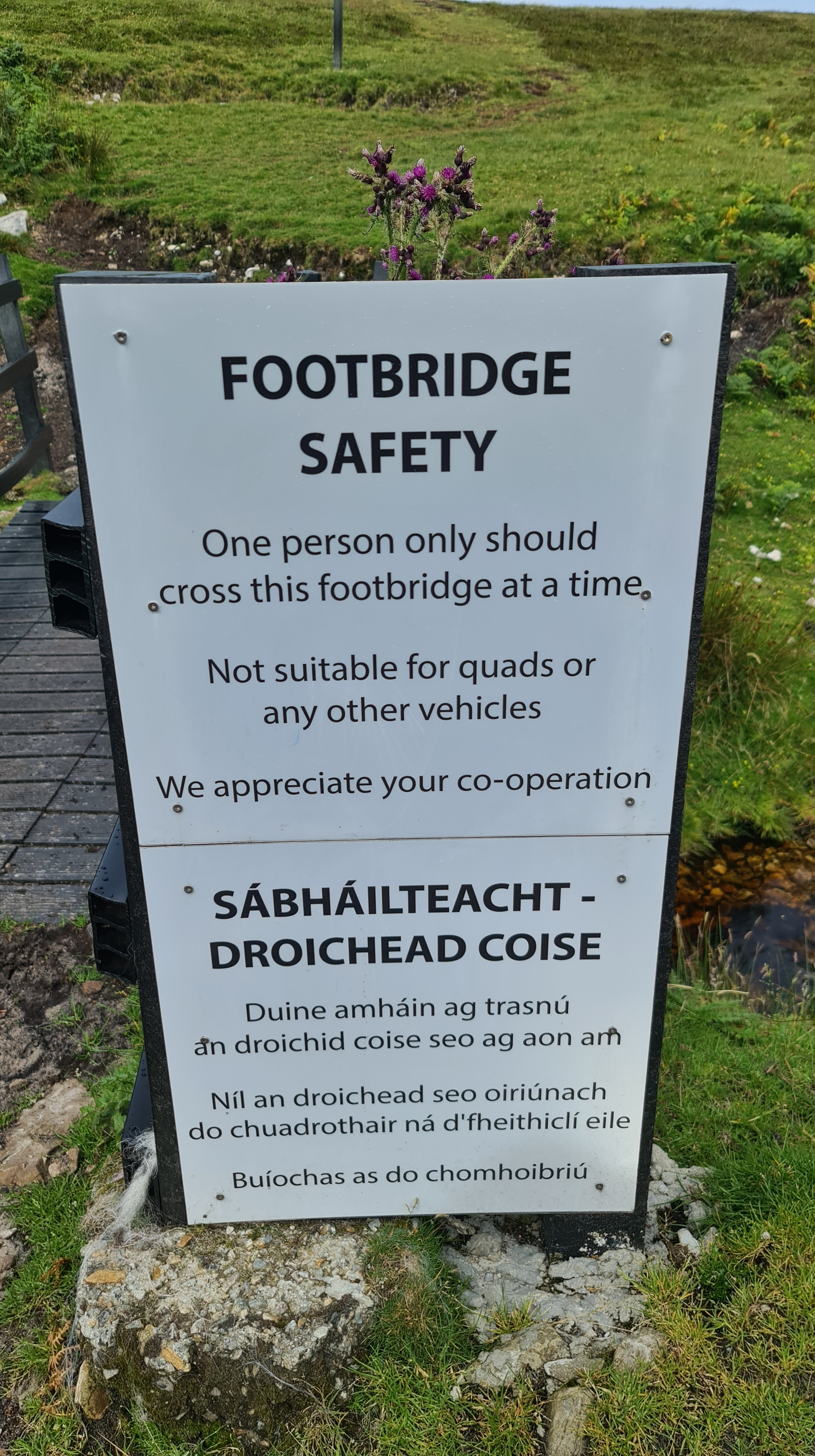 Deshalb gab’s nur einen kleinen Spaziergang am Strand. Manchmal sind die Schilder nur in Gälisch geschrieben.