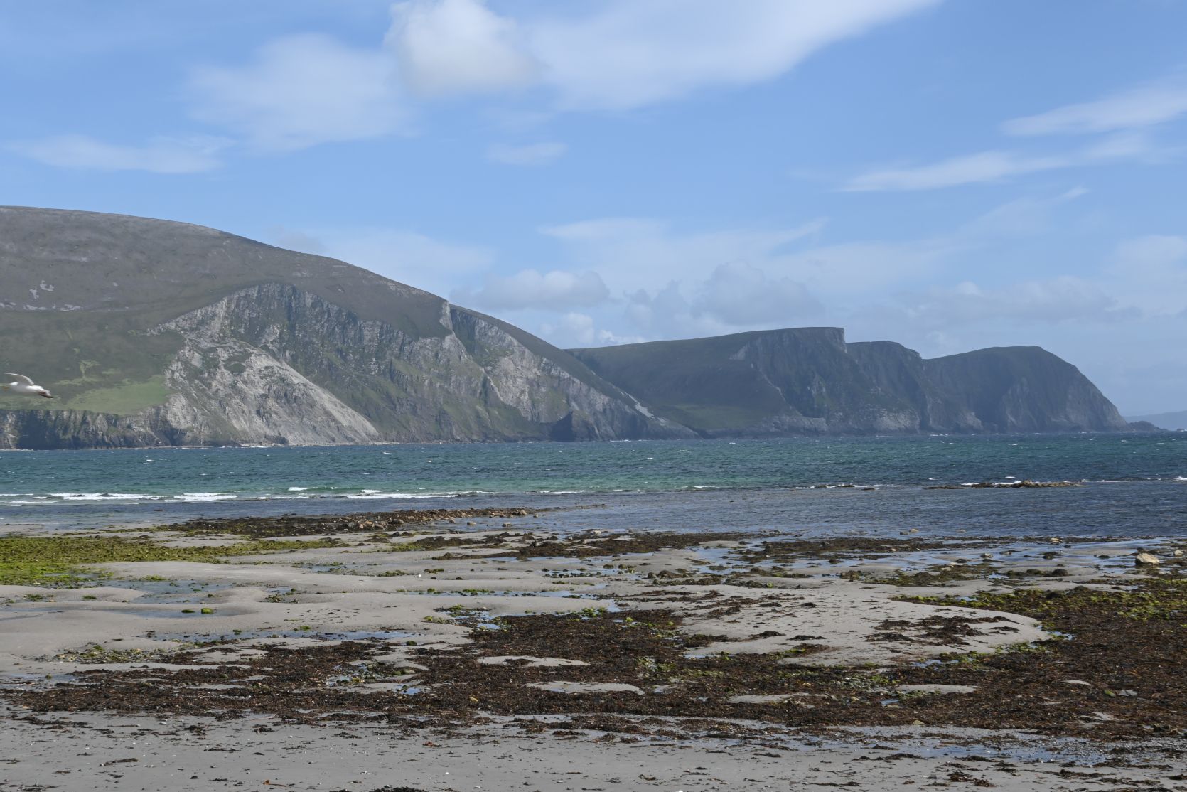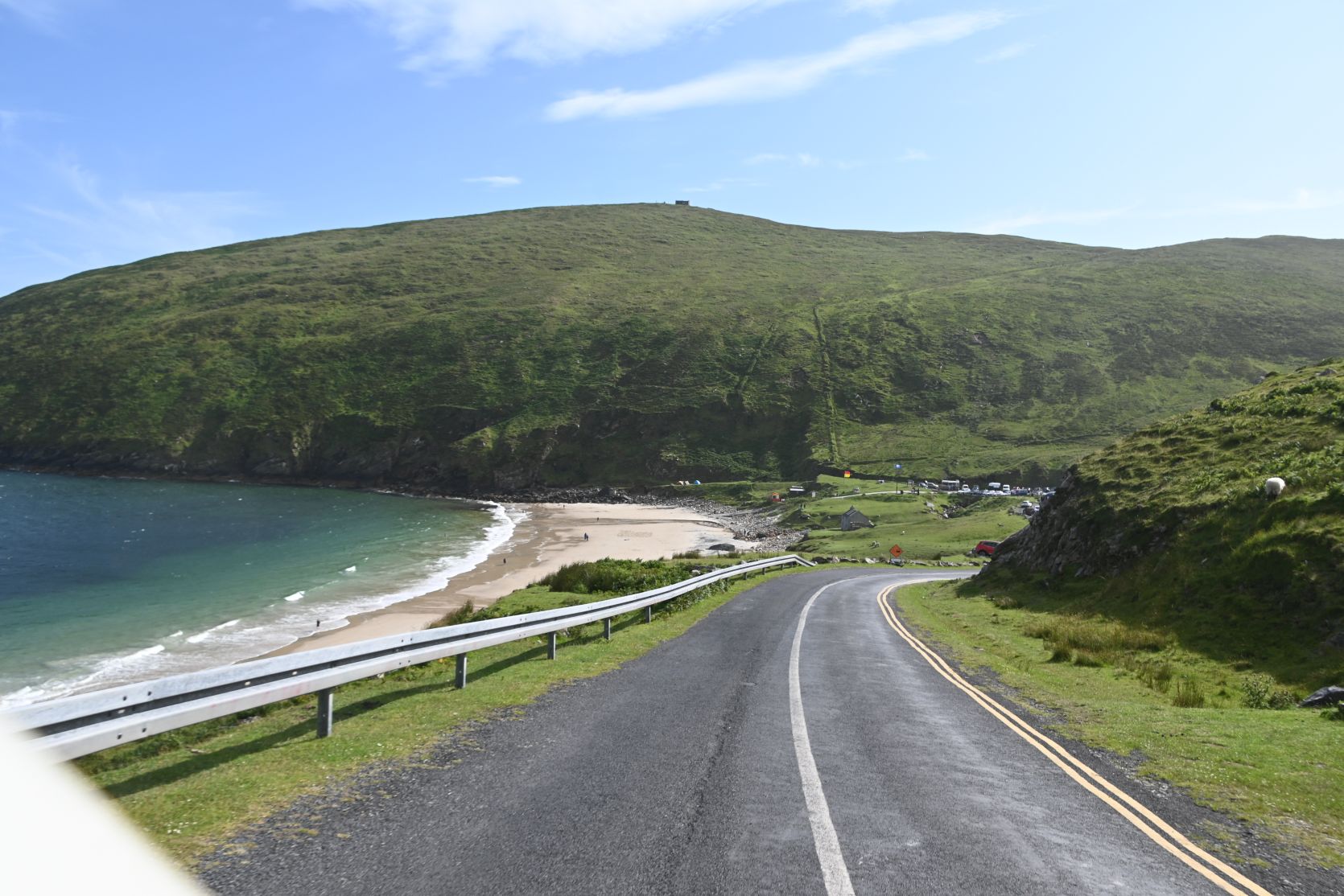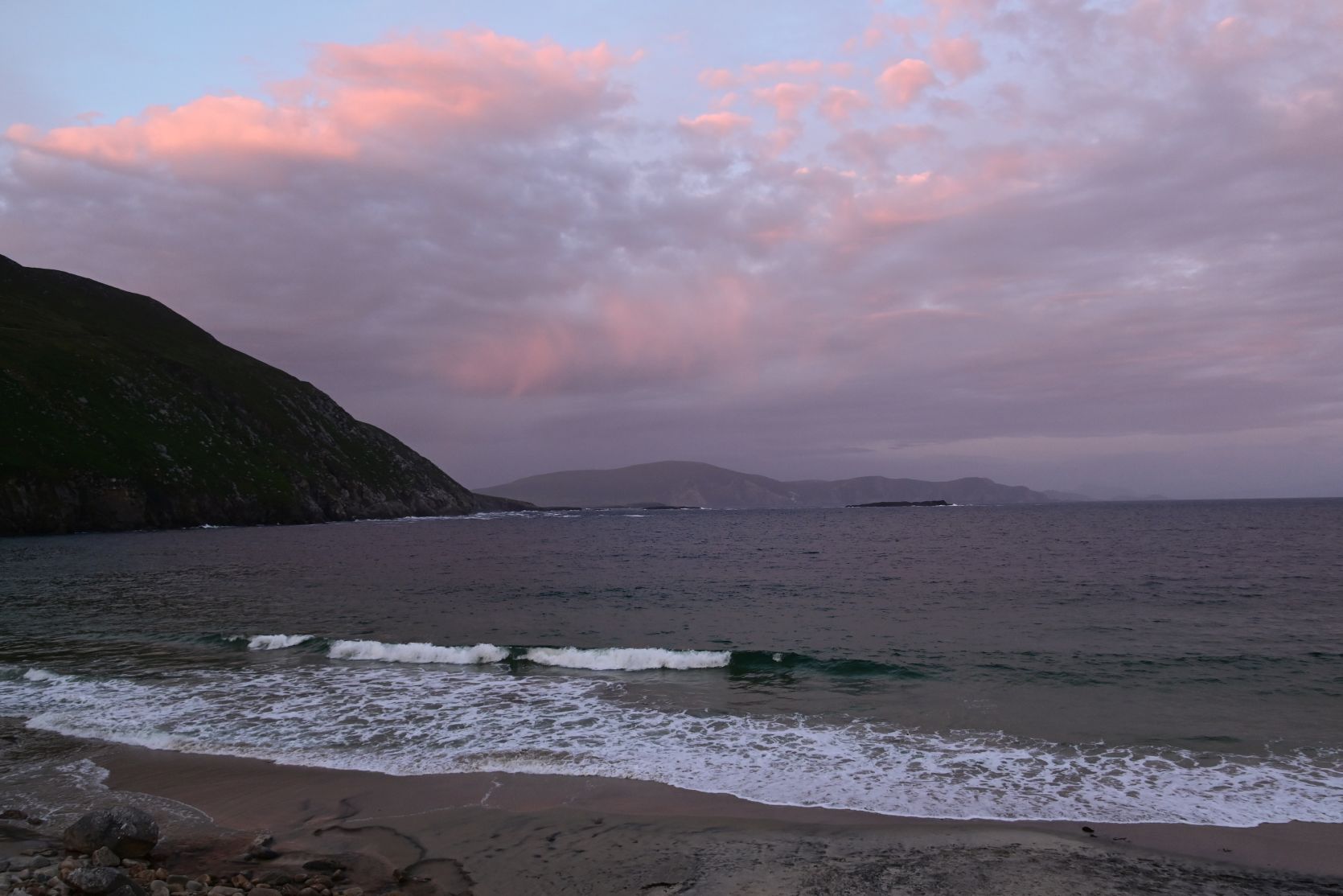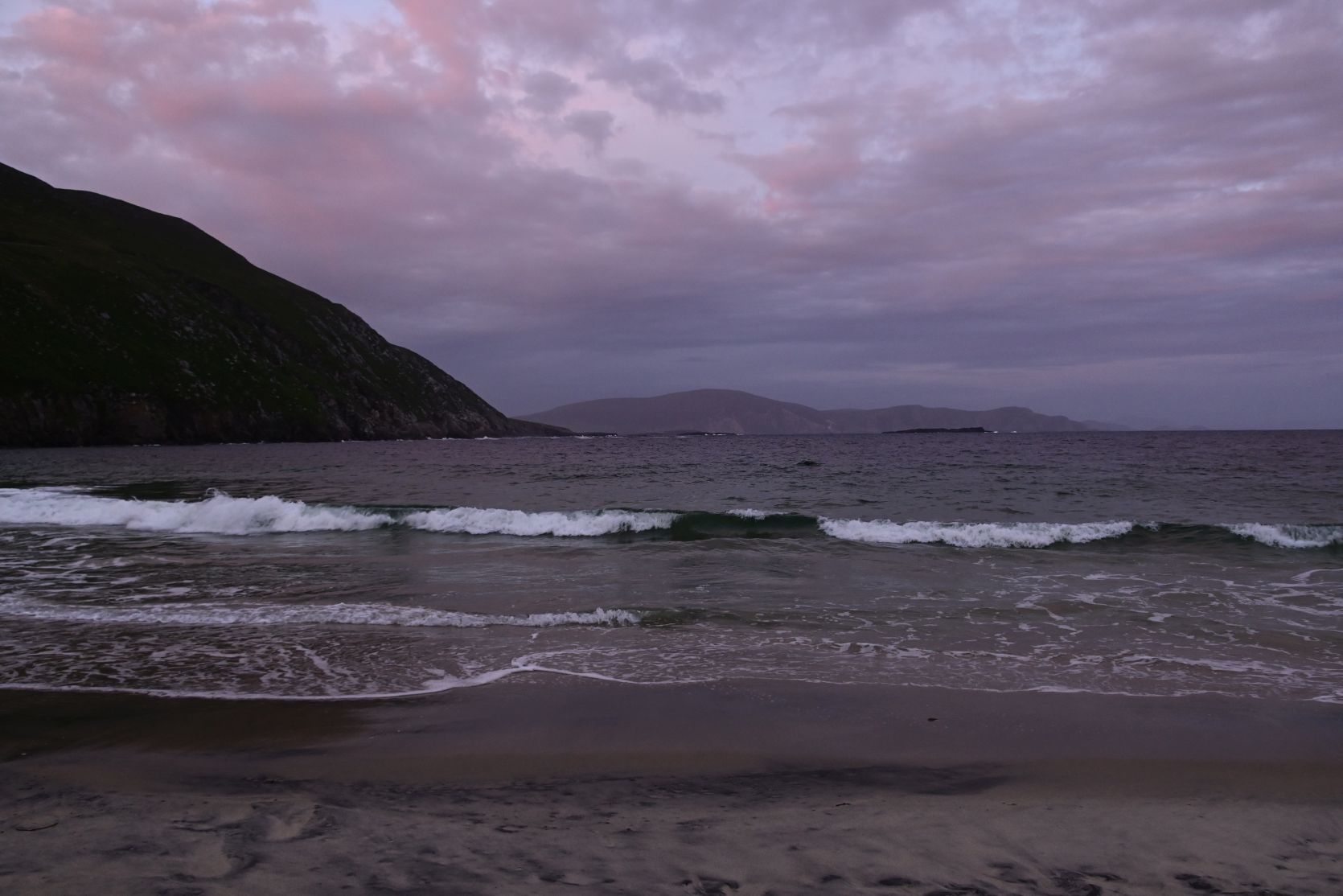 A quick stop on the huge beach, on Keel Strand, after driving past Keel Lough. Minaun Heights can be seen in the background.