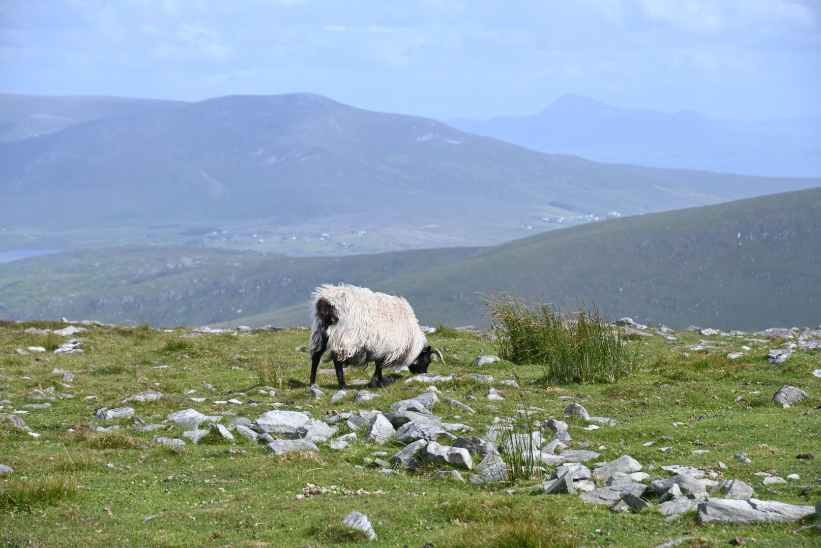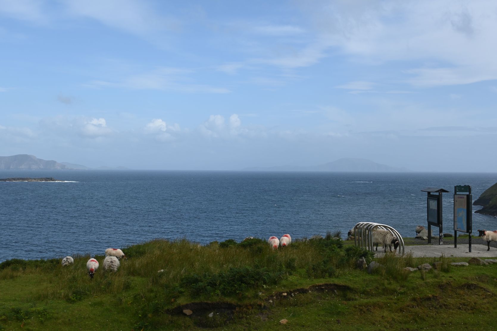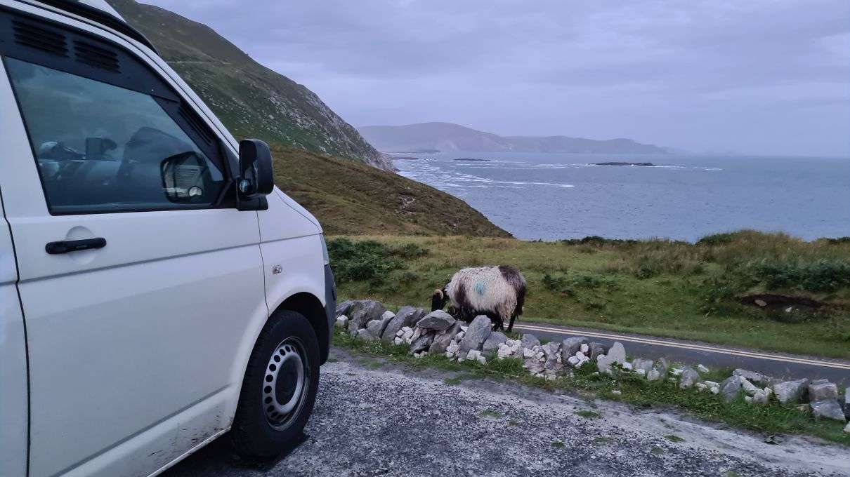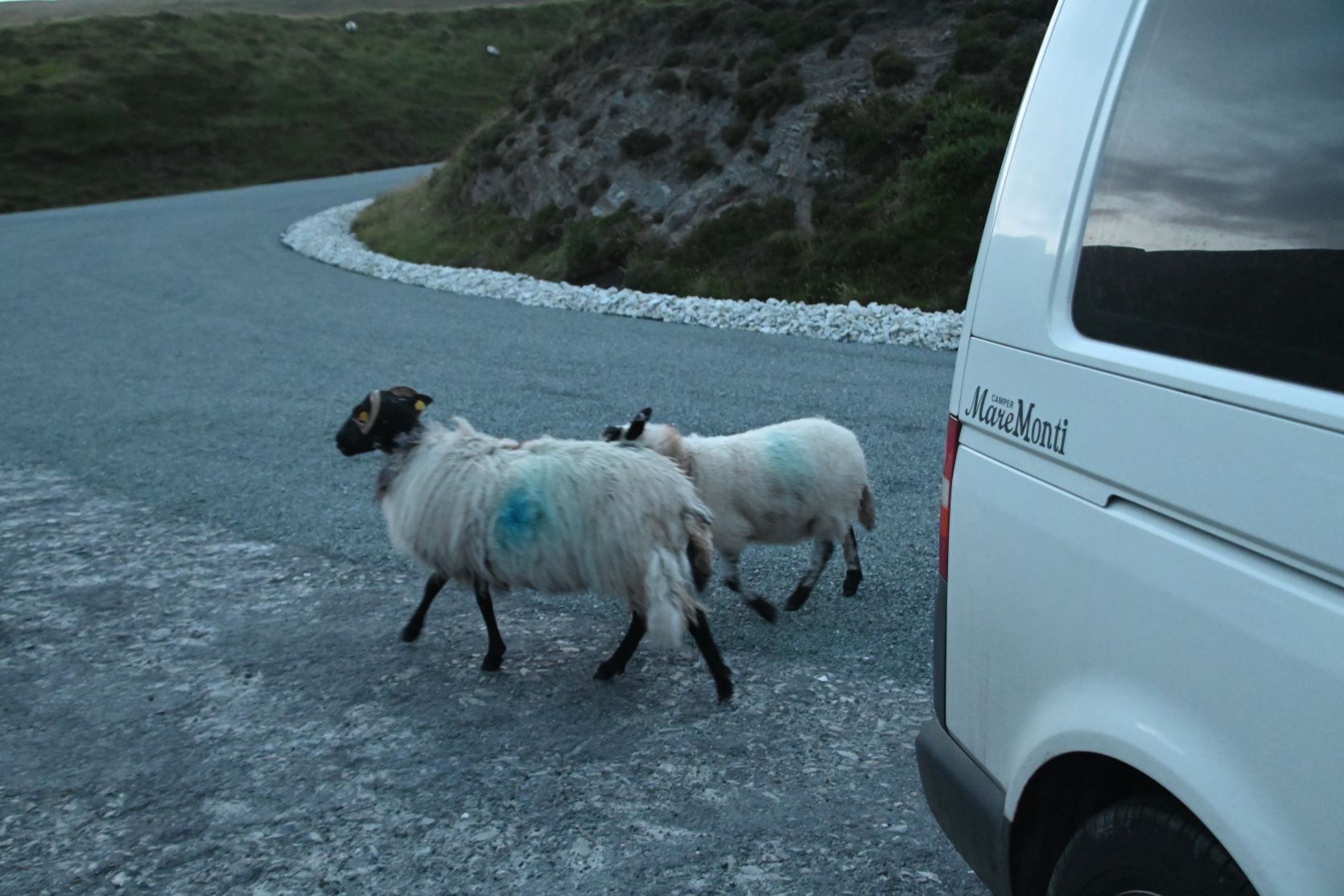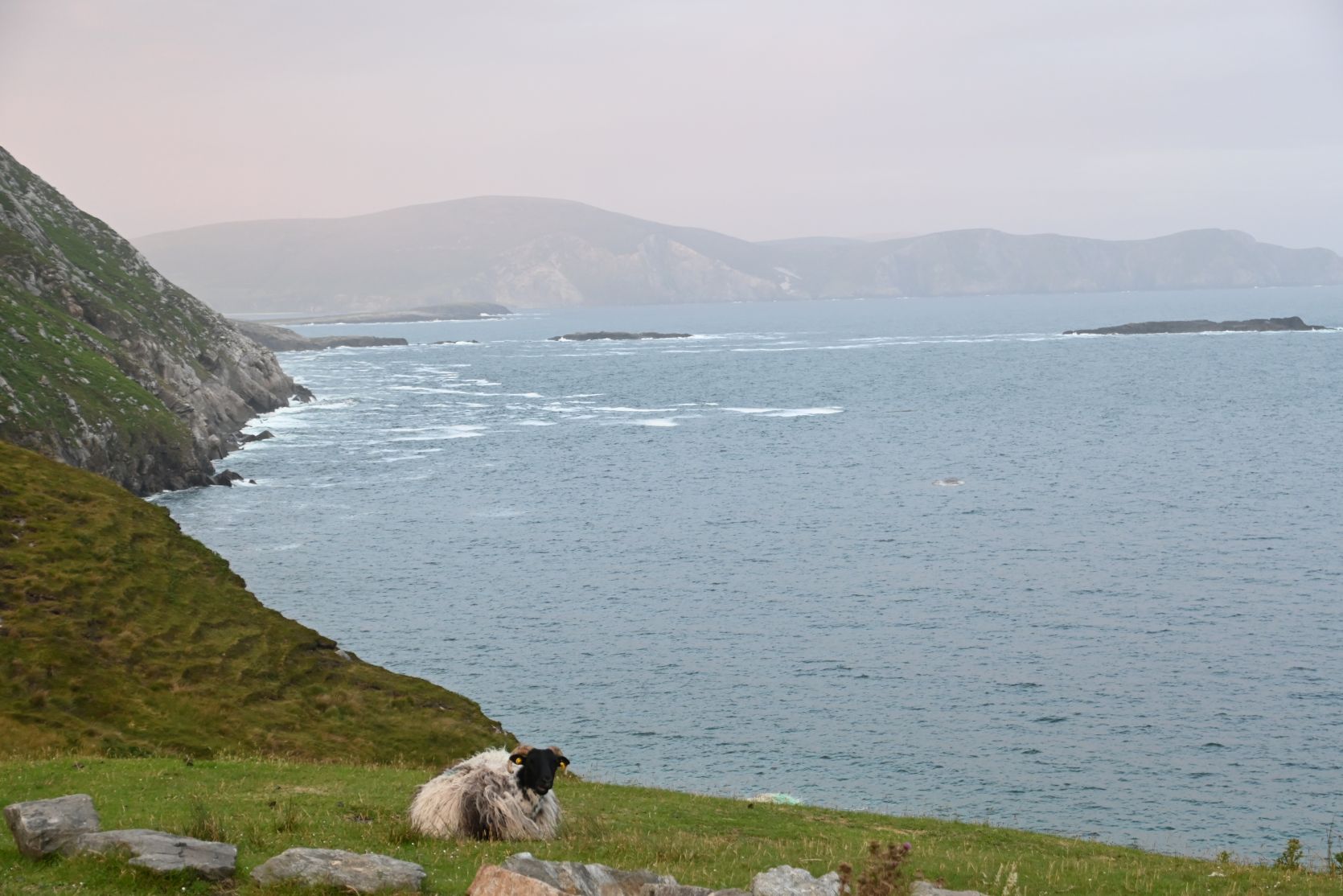 Since the weather turned out nice, we decided to drive onto Minaun Heights. It’s the third highest hill on Achill with 466 metres. We’ve never seen THAT many sheep on a road 😉