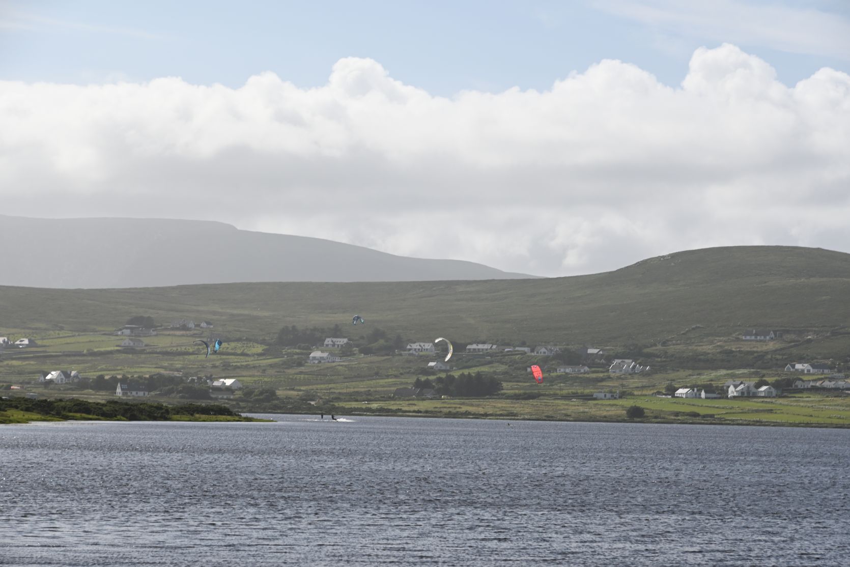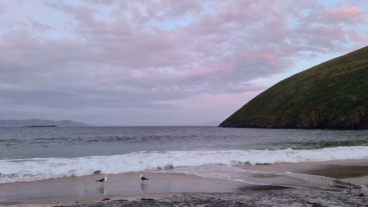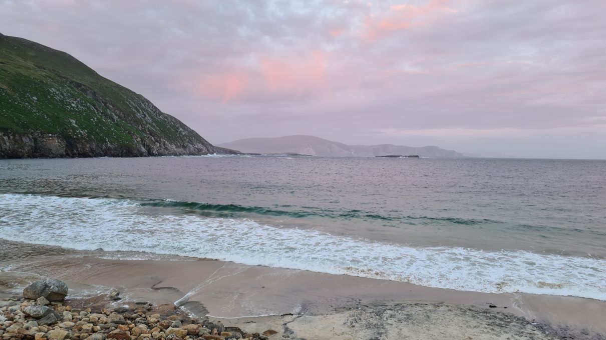 Beim Keel Lough vorbei und zum riesigen Keel Strand. Im Hintergrund sieht man Minaun Heights.