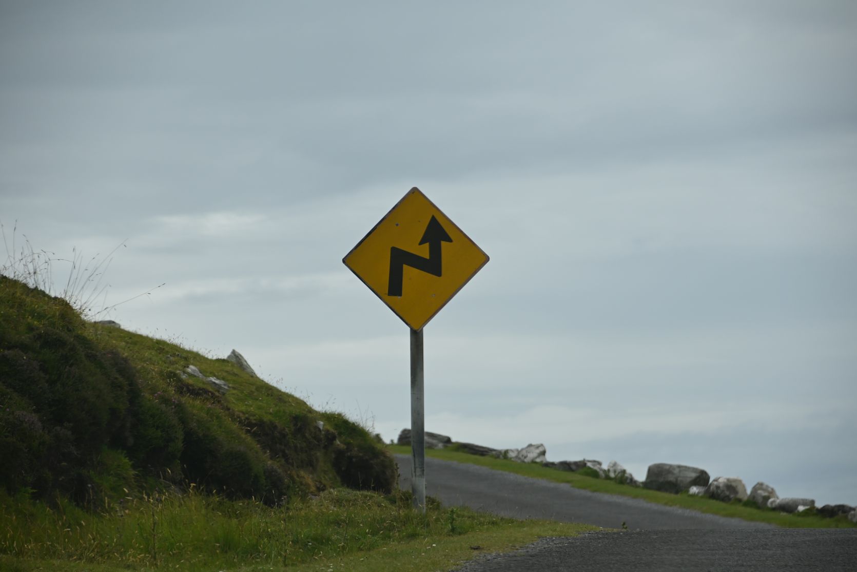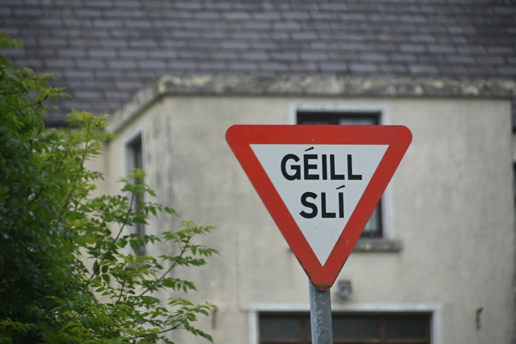 Back on the little roads. Obviously „géill slí“ means „yield“ (to give way). Signs are quite often only written in Gaelic.