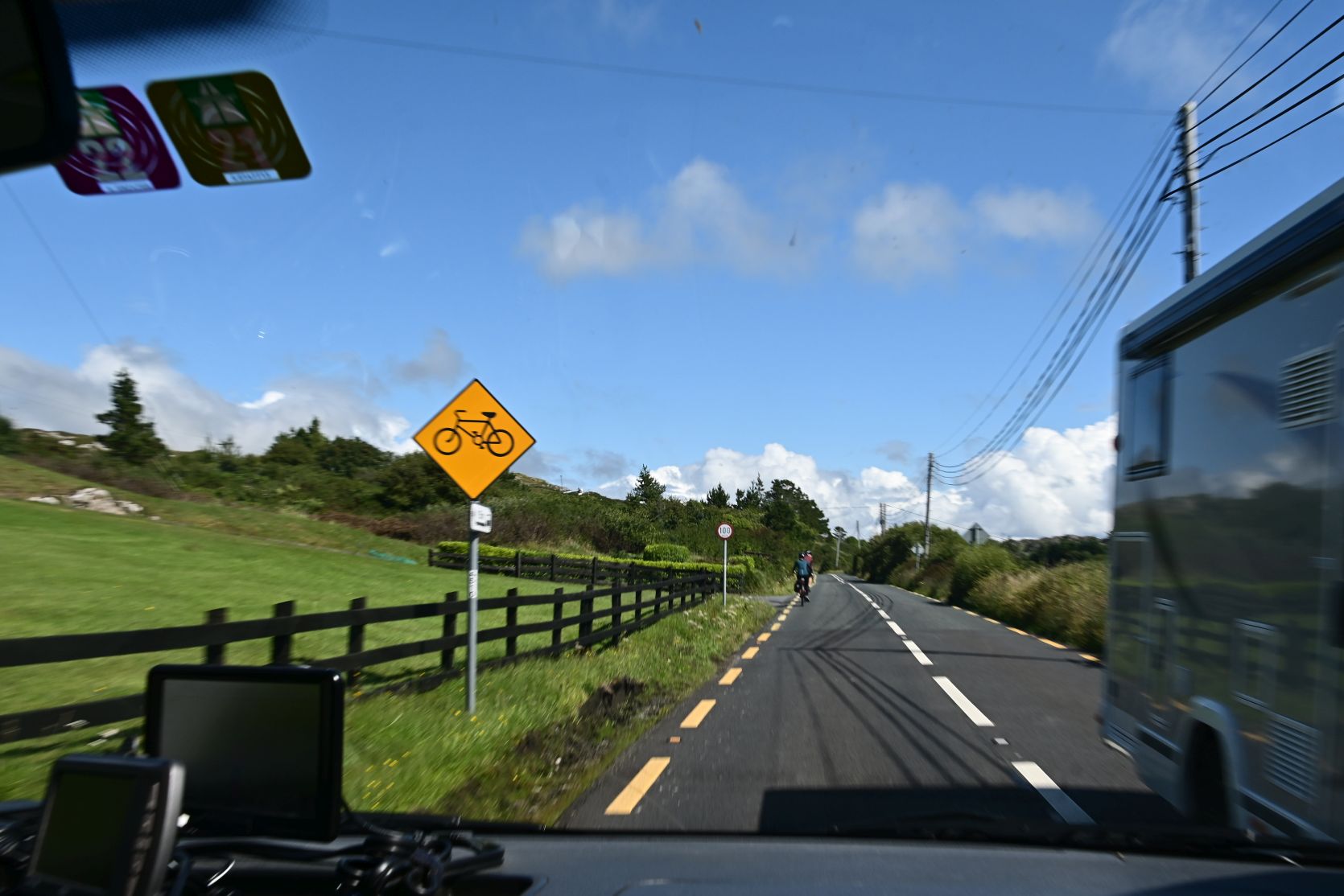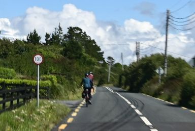 We then drove to Clifden, a place we’d been to quite a few times by now. The first photo shows the nullifying of speed limits and at the same time tells you to slow down… The road with the cyclists shows a speed limit of 100 km/h !