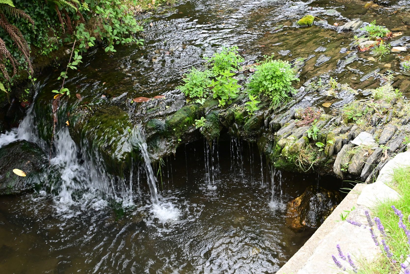 Neben dem Friedhof hat es ein kleines Bächlein. Der Wanderweg führt dort weiter, durch den Garten eines Hauses.