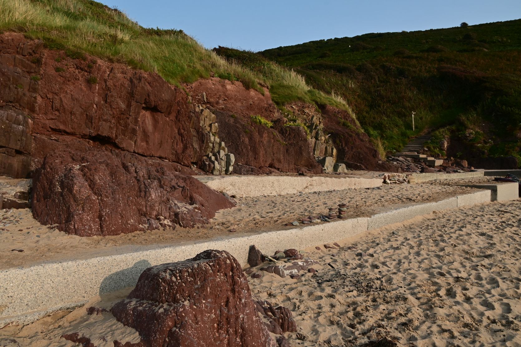 Direkt unterhalb des Schlosses befindet sich der Sandstrand mit wunderschönen roten Felsen.