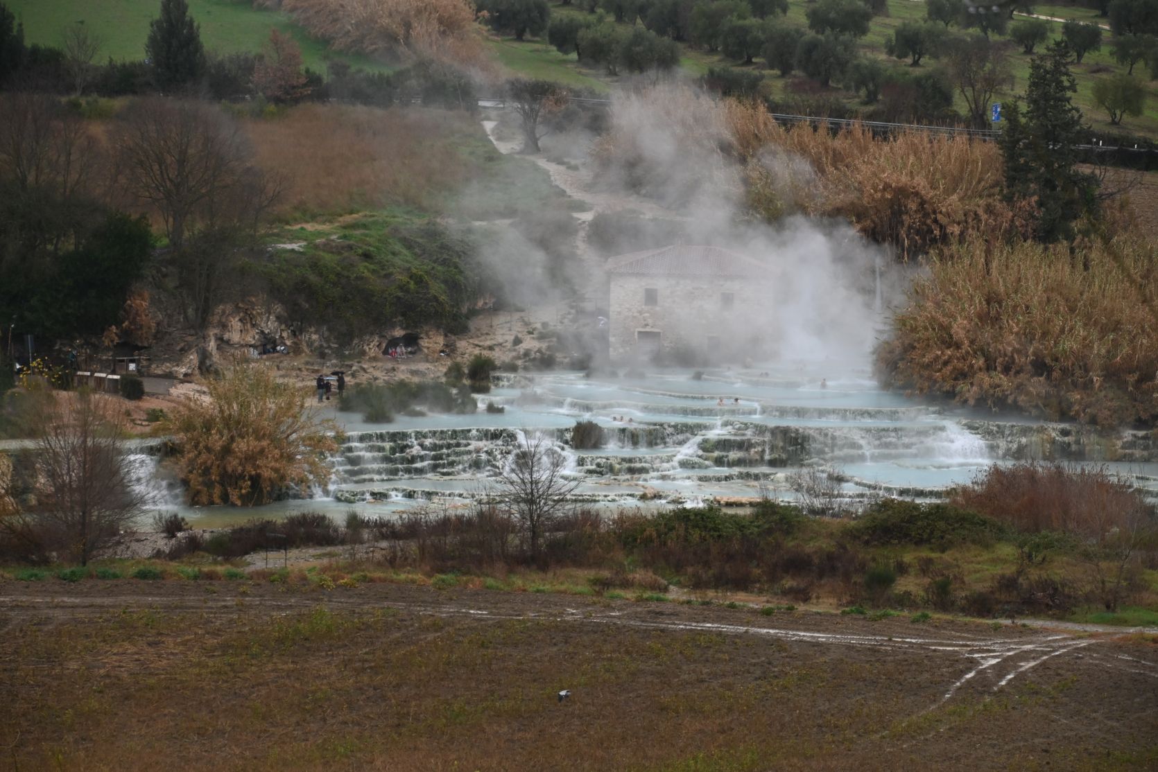 Due to the weather forecast we decided to drive eastward. We spent the night in Saturnia. It was still raining, so we didn’t go to the hot springs, or rather the warm cascades at the mill (Cascate del Mulino).