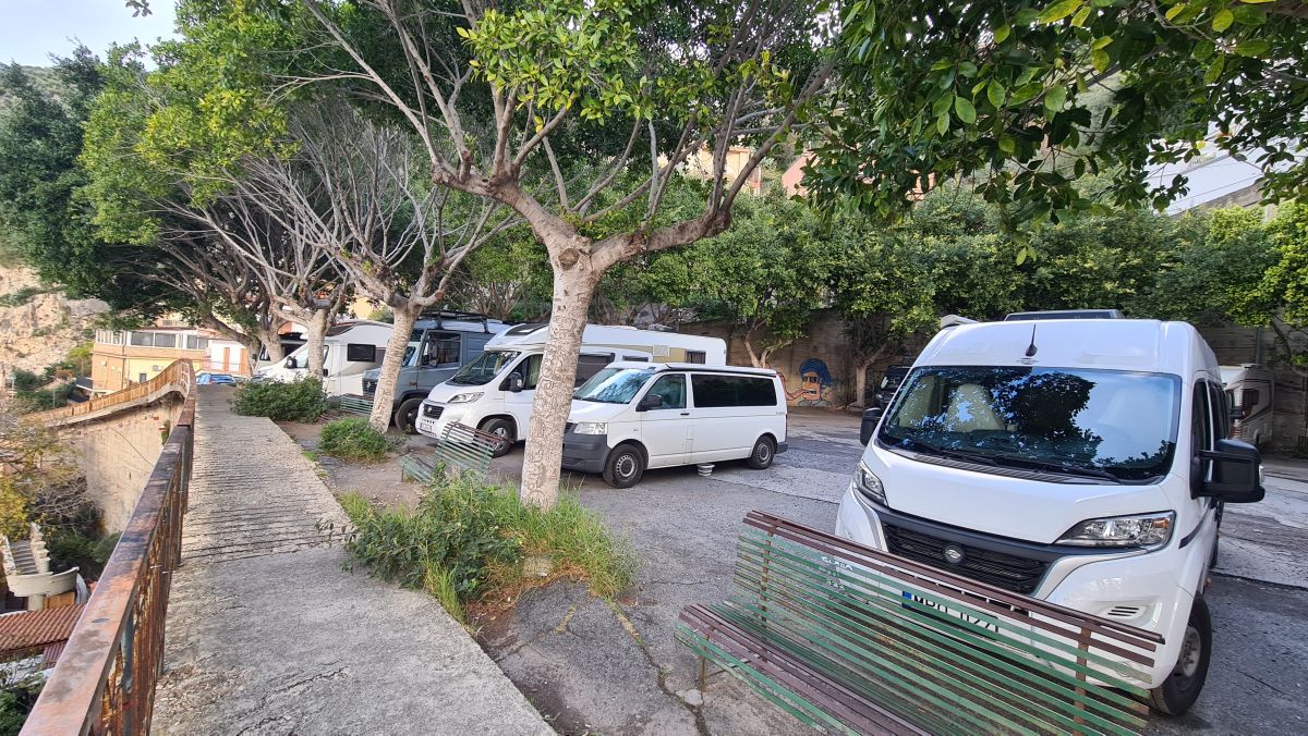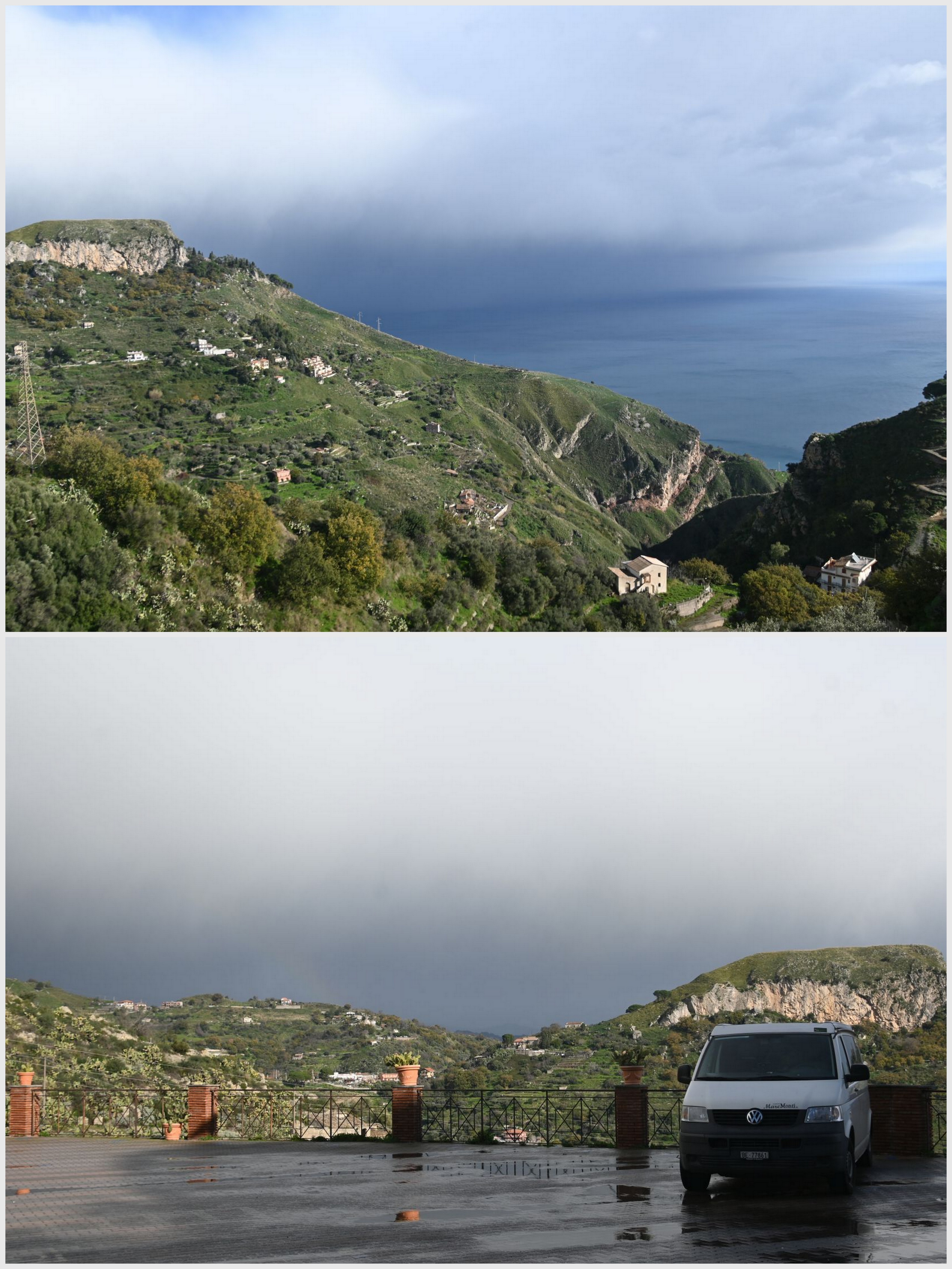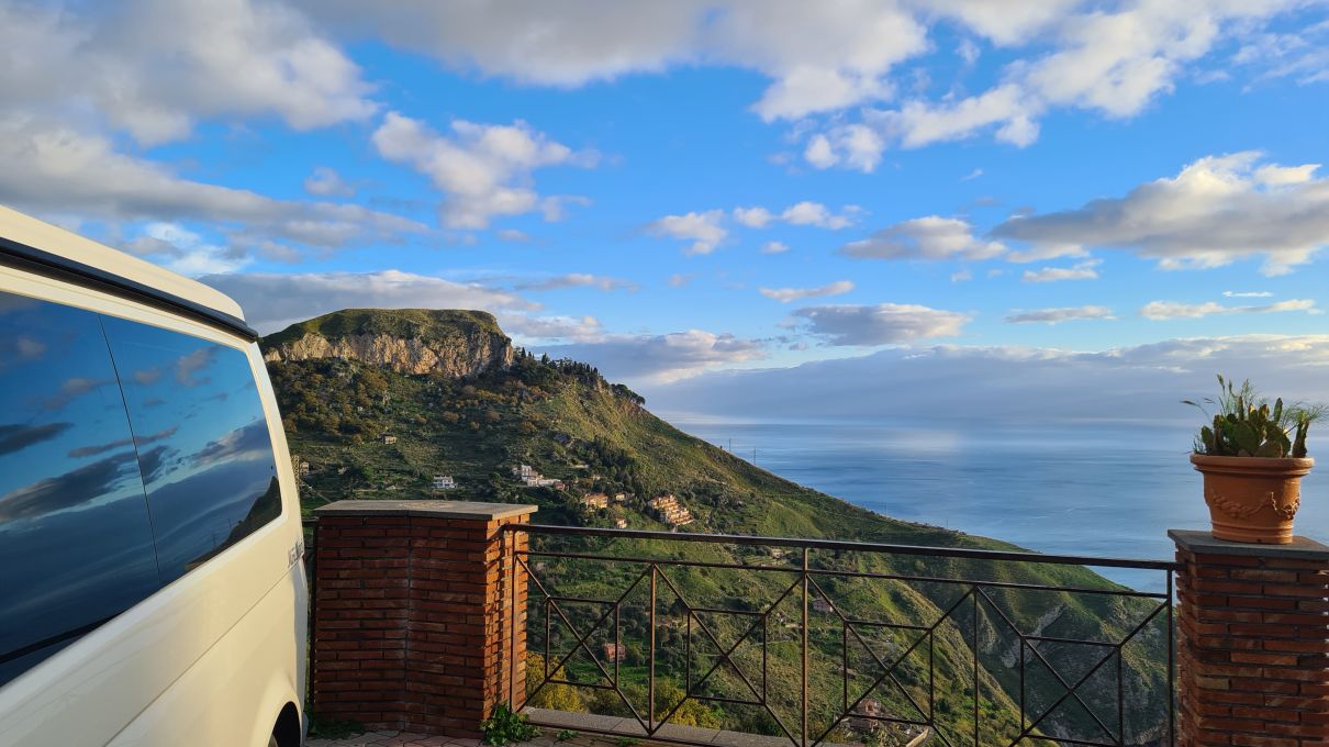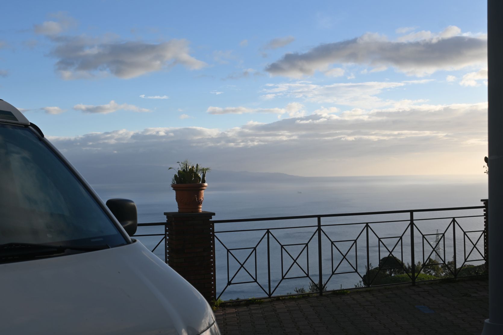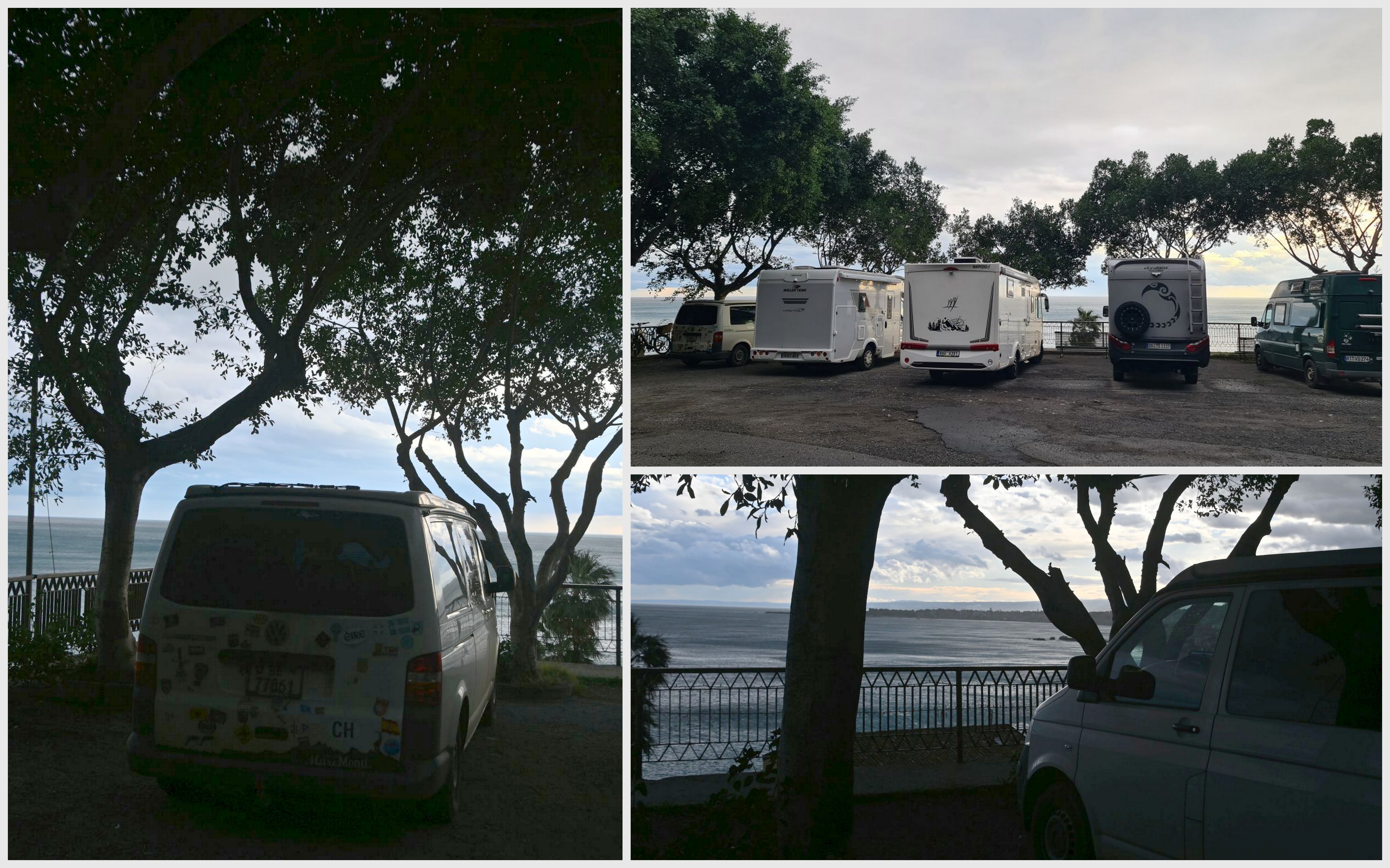 Ein kurzer Halt in Taormina um einzukaufen, dann fuhren wir wieder zum „Stellplatz mit Aussicht“ (wo wir vorletzte Nacht waren). Man beachte unsere italienische Art zu parken 😉
