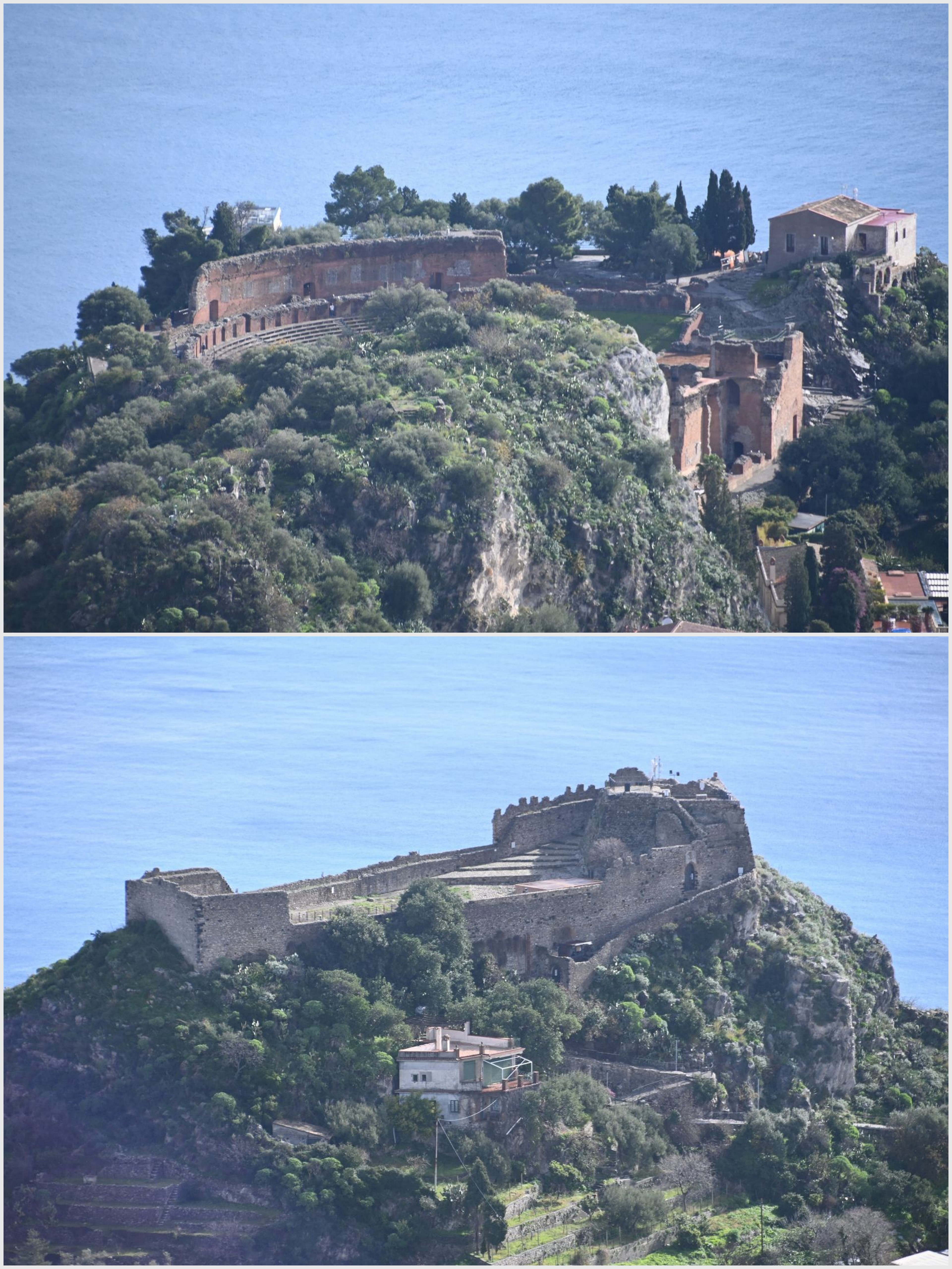 Der Besuch der Burg war etwas teuer… Wir liessen es bleiben. Blick hinunter nach Taormina und hinauf nach Castelmola.