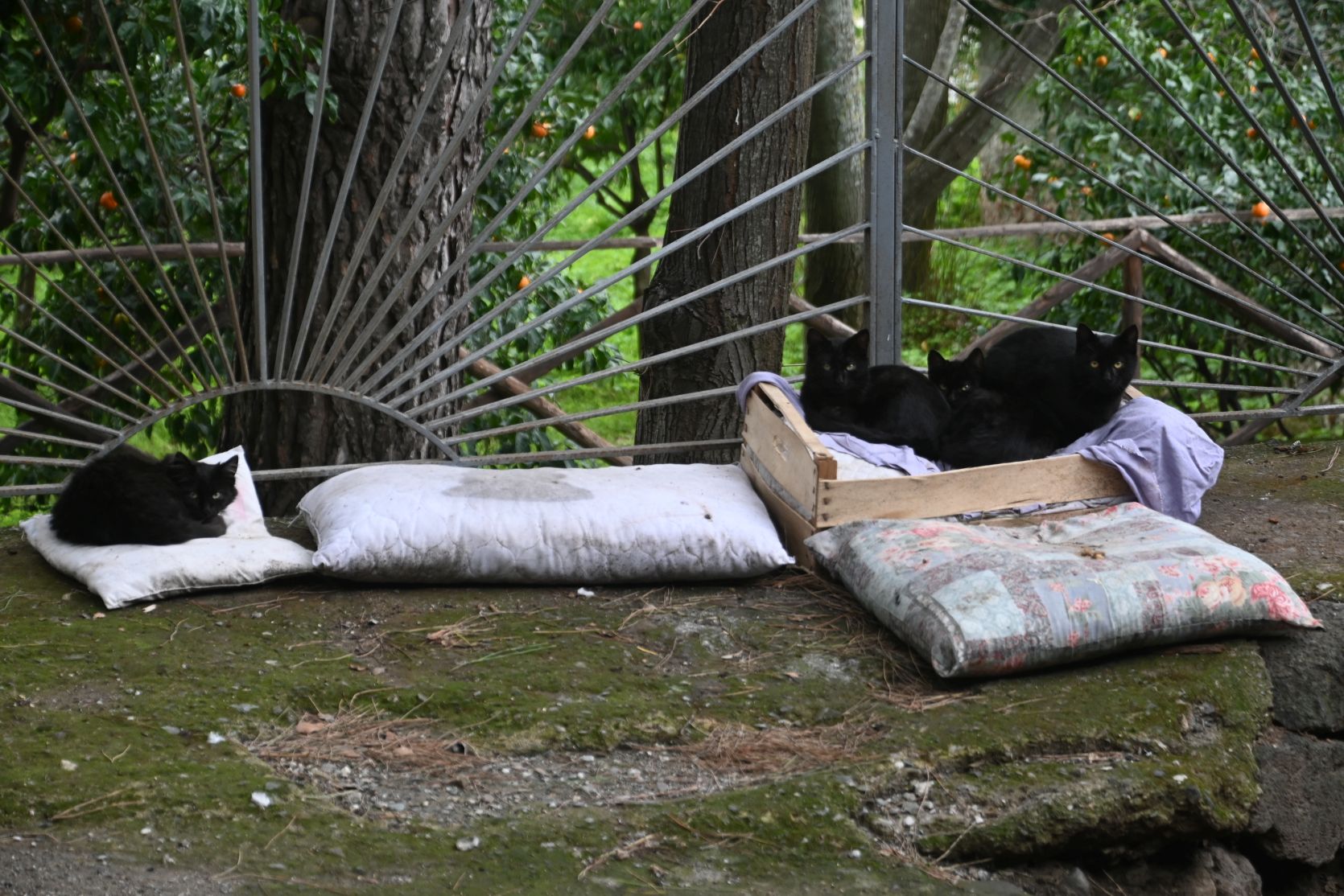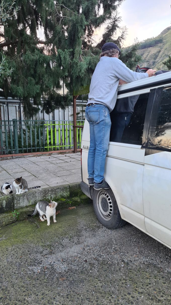We have problems with our solar panels 😦 Kurt is trying to find the problem, with the aid of some cats!