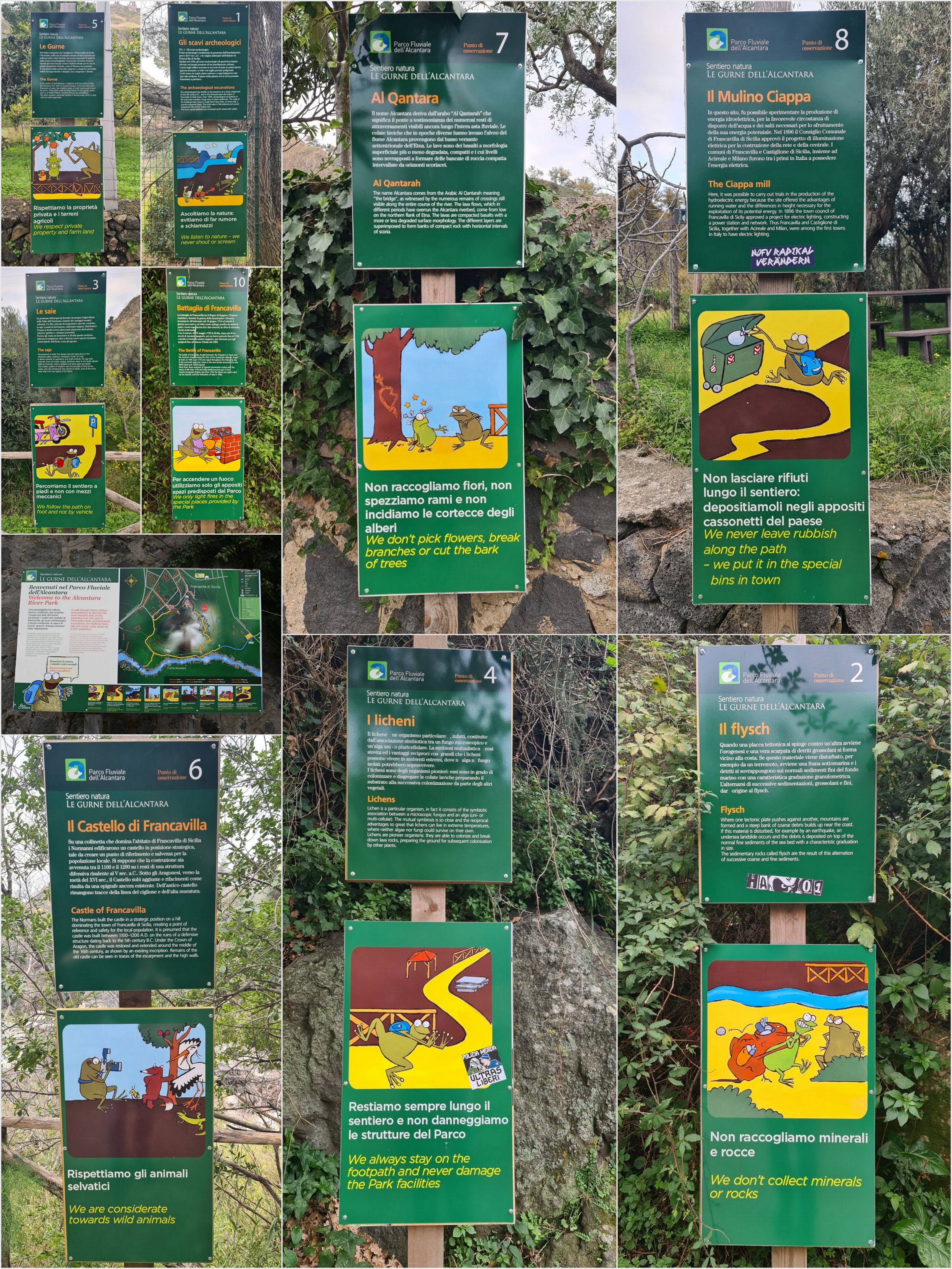 Viele Hinweistafeln über die Tümpel und den Fluss, und wie man sich verhalten muss 😉